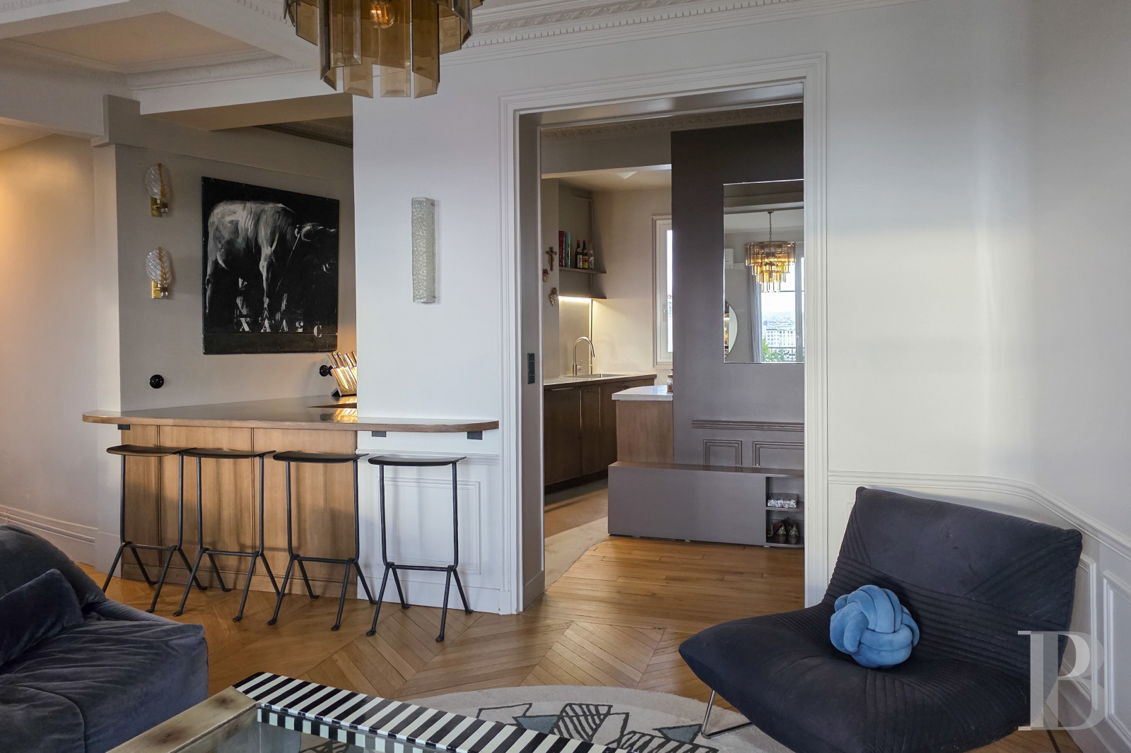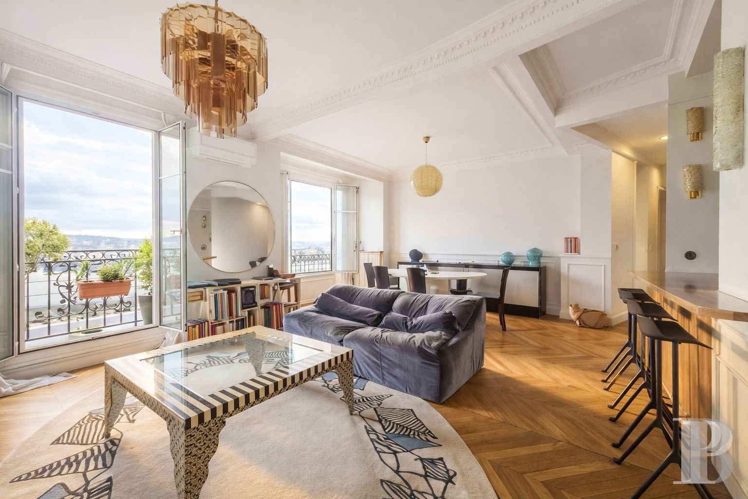 Ouverte sur le ciel, la propriété allie fonctionnalité des espaces et qualités esthétiques d’une architecture classique enrichie de touches d’Art nouveau tardif. Implantée en position dominante, l'appartement profite d’un environnement calme et d’une lumière généreuse qui accompagne la lecture des volumes tout au long de la journée. La présence d’activités aisément accessibles aux alentours renforce encore l’agrément du lieu. L’ensemble conjugue ainsi présence architecturale et qualité de cadre, offrant une base particulièrement pertinente pour un projet résidentiel ou mixte.