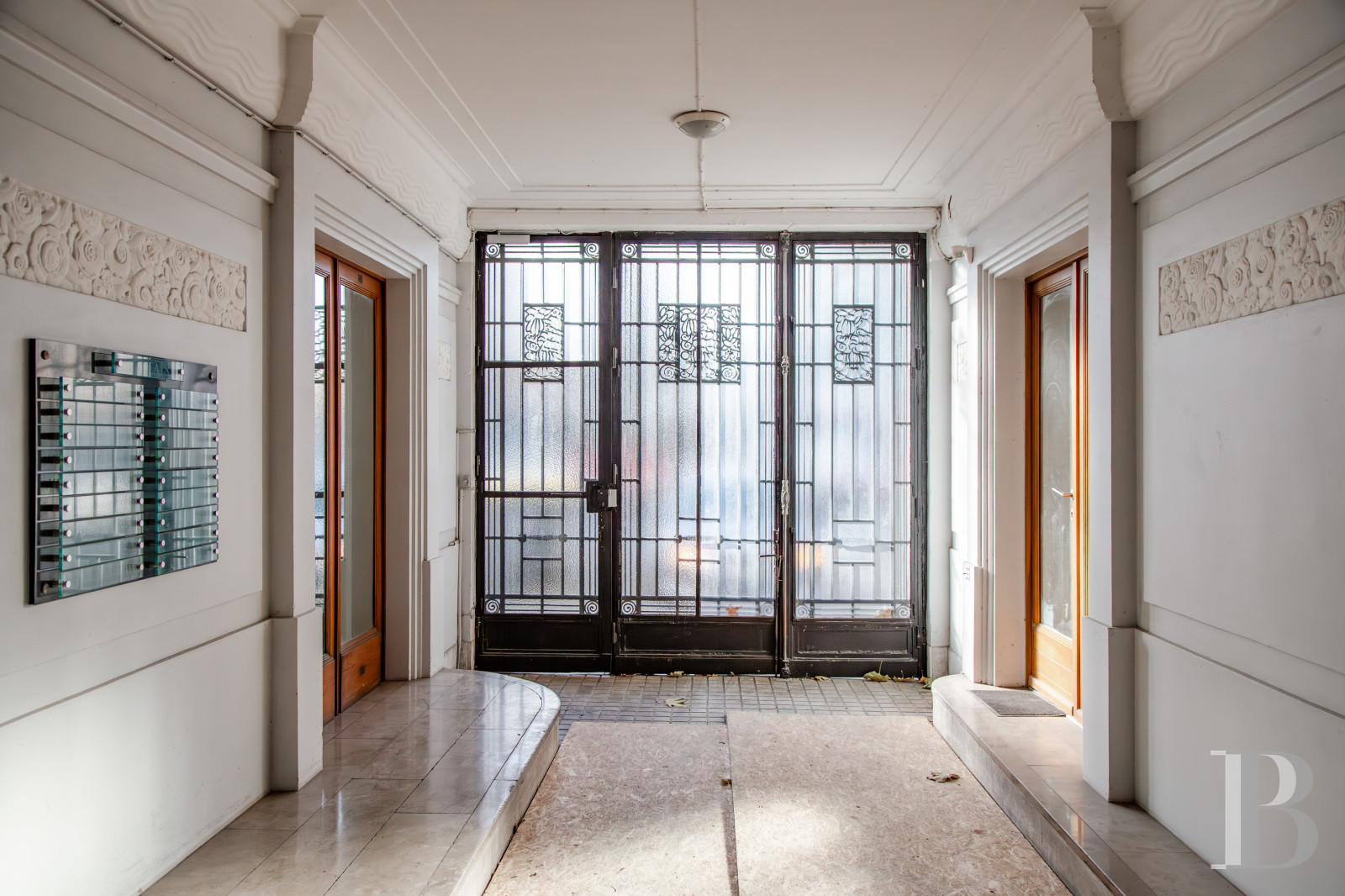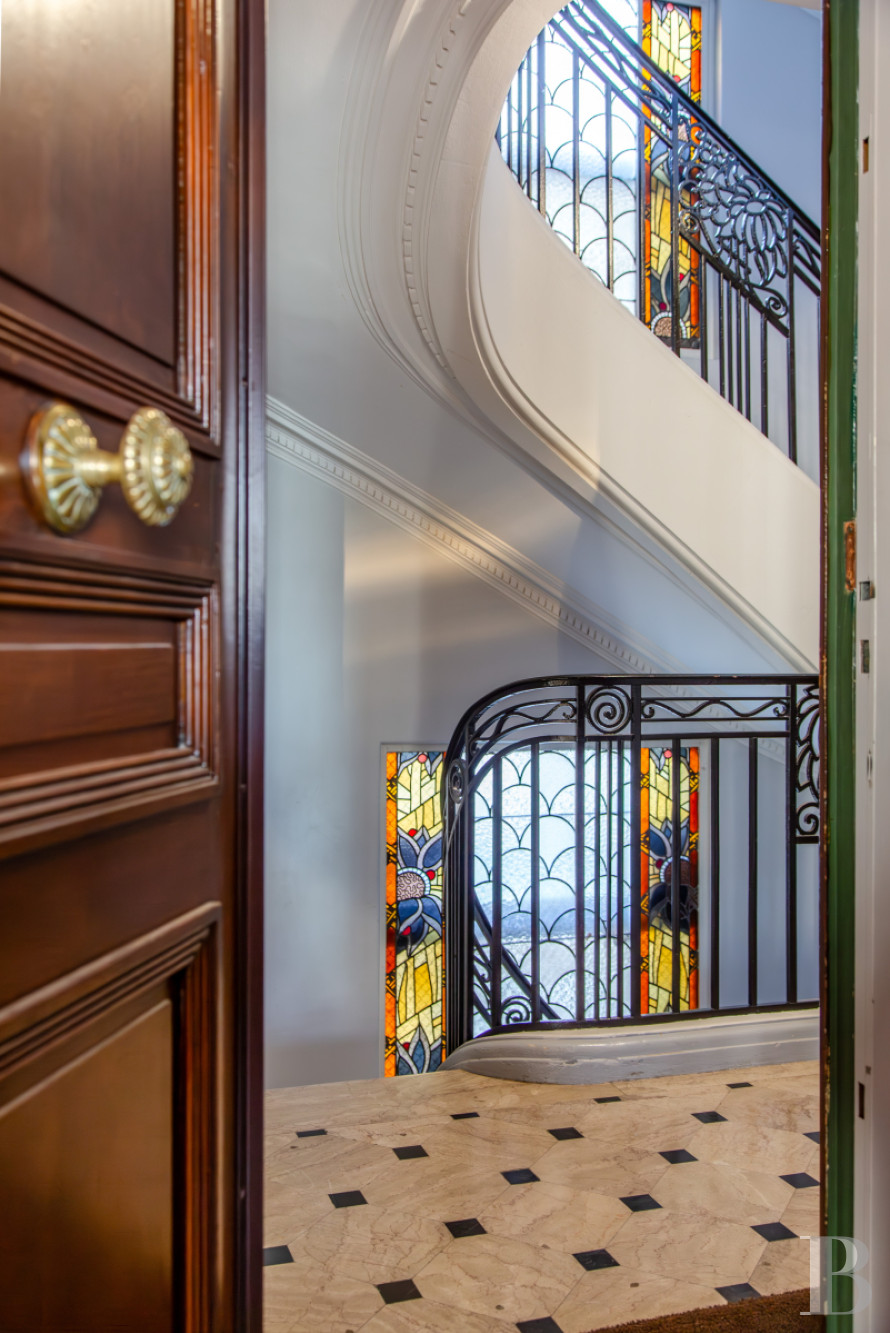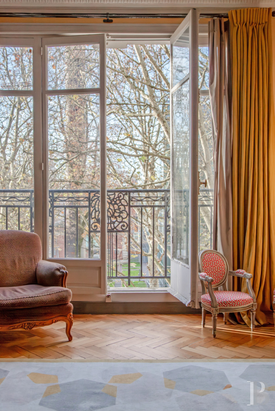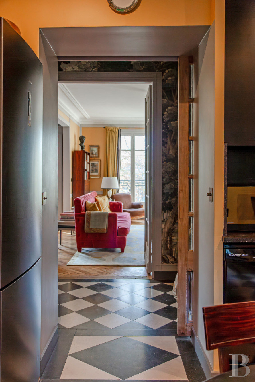 Au débouché de la porte d’entrée, le grand vestibule, qui dissimule de nombreux rangements, dessert la salle à manger avec cheminée en marbre, et le salon, également pourvu d'une cheminée en marbre rouge veiné de blanc, agrémenté d’un trumeau. L’appartement reçoit une abondante lumière naturelle de larges baies vitrées, équipées de balustrades en fer forgé. Les plafonds, d'une importante HSP, sont moulés, les sols alternent des parquets à bâtons rompus cirés mat pour les principales pièces, et des carrelages blancs et noirs pour l’entrée et la cuisine. Cette dernière, indépendante et équipée, est attenante à un dégagement situé à l'arrière de l'immeuble. Trois des quatre chambres à coucher sont parquetées et donnent au calme sur la cour intérieure. Deux salles de bain équipées de douches, un sanitaire, de nombreux et larges espaces de rangement, ainsi que des bibliothèques, complètent l'ensemble.
