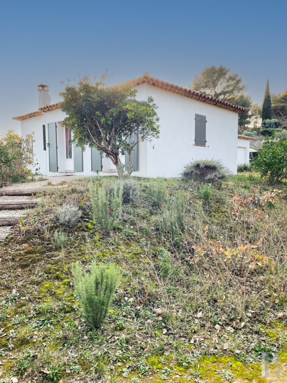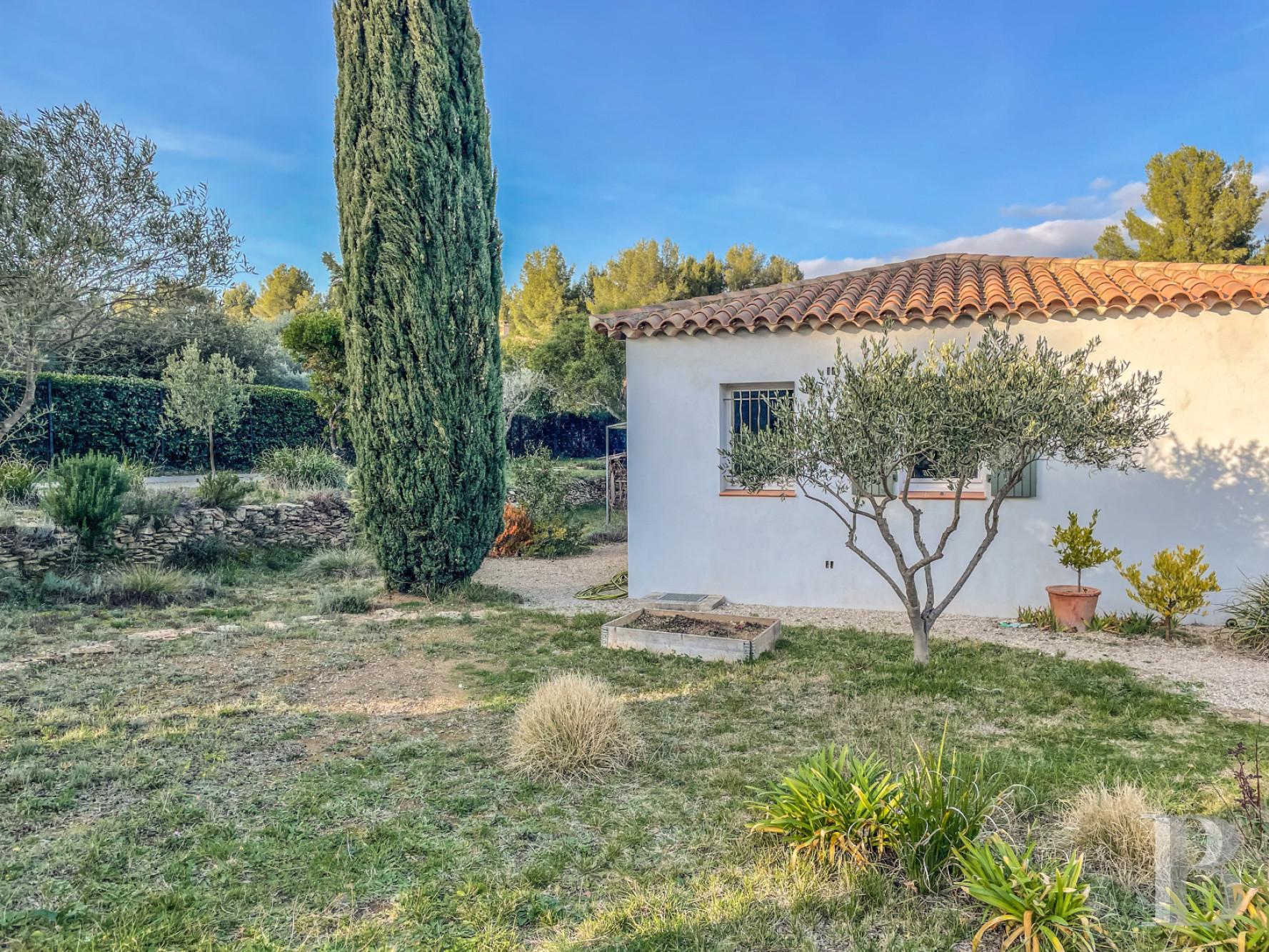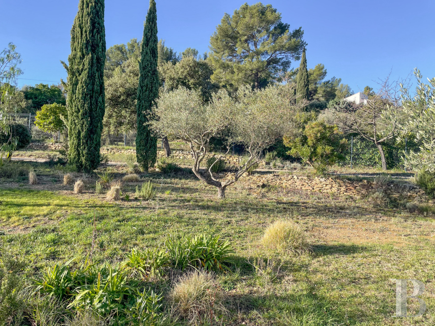 Étendu sur plus de 5000 m², il est constitué de plusieurs restanques délimitées par des murets en pierre sèche. La plus vaste s'étire principalement au sud du bâtiment, où se trouvent la piscine et ses plages en bois et en pierre. Sécurisée par un volet électrique, de 10 x 5 m et traitée au sel, cette dernière a été rénovée en 2022. Une végétation méditerranéenne composée d'oliviers, muriers platane, mimosa, arbousier, poivrier, chênes vert et blanc, lauriers rose… ponctue délicatement le terrain soigneusement entretenu et apporte l'ombre nécessaire, ainsi que des points de vue sans vis-à-vis.Ce que nous en pensons