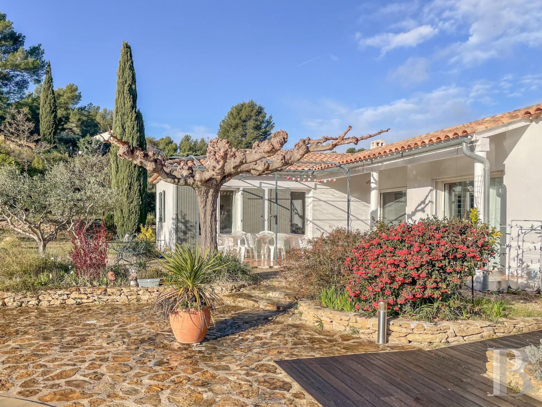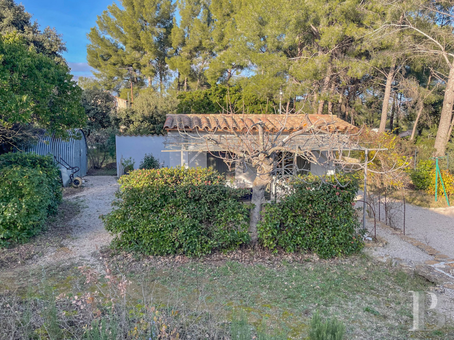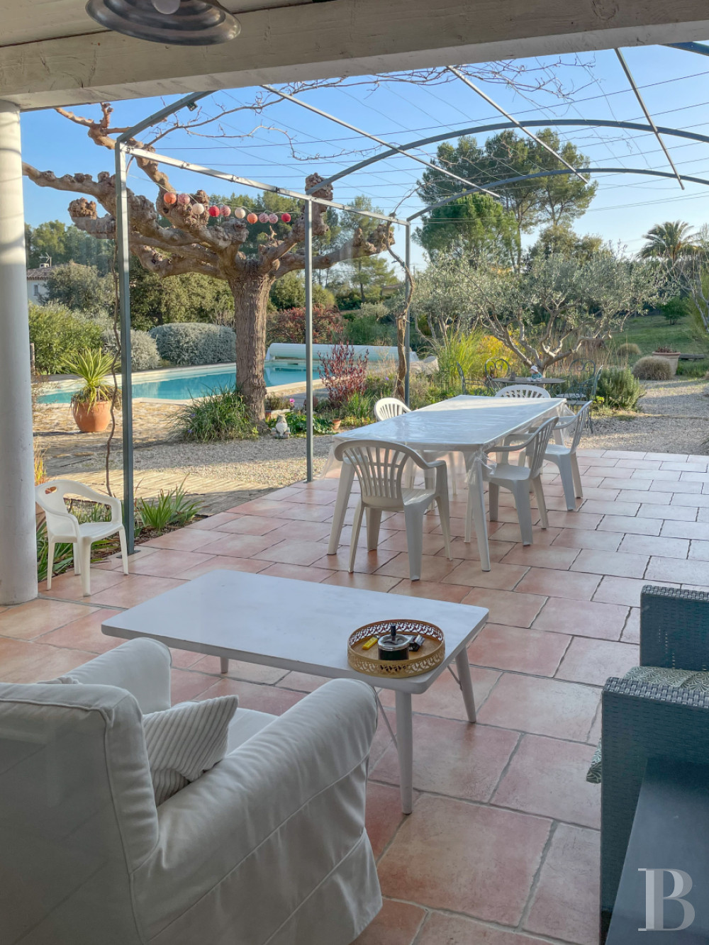 Étendu sur plus de 5000 m², il est constitué de plusieurs restanques délimitées par des murets en pierre sèche. La plus vaste s'étire principalement au sud du bâtiment, où se trouvent la piscine et ses plages en bois et en pierre. Sécurisée par un volet électrique, de 10 x 5 m et traitée au sel, cette dernière a été rénovée en 2022. Une végétation méditerranéenne composée d'oliviers, muriers platane, mimosa, arbousier, poivrier, chênes vert et blanc, lauriers rose… ponctue délicatement le terrain soigneusement entretenu et apporte l'ombre nécessaire, ainsi que des points de vue sans vis-à-vis.Ce que nous en pensons
