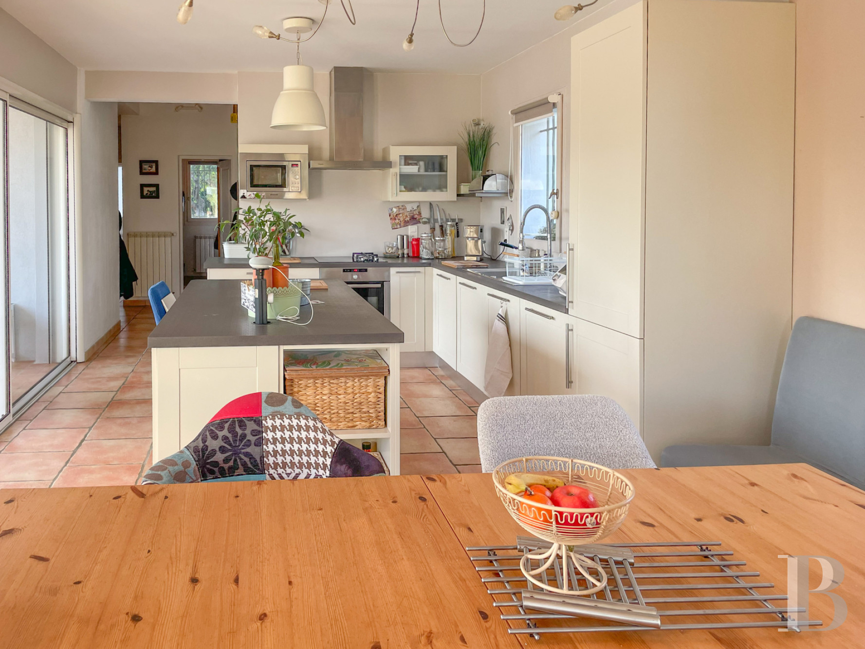 L’accès s’effectue à l’arrière, au nord, par un sas couvert qui dessert également le garage et conduit à l’entrée. Celle-ci distribue, à l’est, une pièce de vie d’environ 47 m², toute en longueur, où se succèdent en enfilade cuisine ouverte, espace repas et salon. Baigné de lumière grâce à deux baies vitrées à galandage, dont l’une disparaît entièrement dans l’épaisseur du mur, l’ensemble ouvre au sud sur la terrasse. À l’arrière, trois autres baies apportent un éclairage généreux à la partie cuisine et salle à manger. Le salon, avec poêle à bois, se prolonge à l’est par deux larges baies qui ménagent une vue dégagée sur les collines au loin.Dans le prolongement du salon, en retour d’équerre, un couloir avec espace de rangement mène à un coin nuit, aussi indépendant. Il comprend deux chambres d’environ 11 m², chacune éclairée par une porte-fenêtre orientée à l’est, ainsi qu’une salle d’eau avec toilettes. De l’autre côté de l’entrée se trouvent un vestiaire, des toilettes invités, un bureau de dimensions modestes, une chambre éclairée à l’ouest par deux portes-fenêtres, ainsi qu’une chambre principale avec sa salle d’eau attenante. Cette dernière, d’environ 14 m², profite de deux ouvertures : une porte-fenêtre à l’est sur la terrasse et une fenêtre au sud.À l’exception du salon parqueté, les sols sont pavés de grès et les murs se déclinent dans des tons pastel, dans un état d’entretien irréprochable. Attenant à la maison, le garage abrite une cuve à fioul ainsi qu’un cellier.Les dépendances