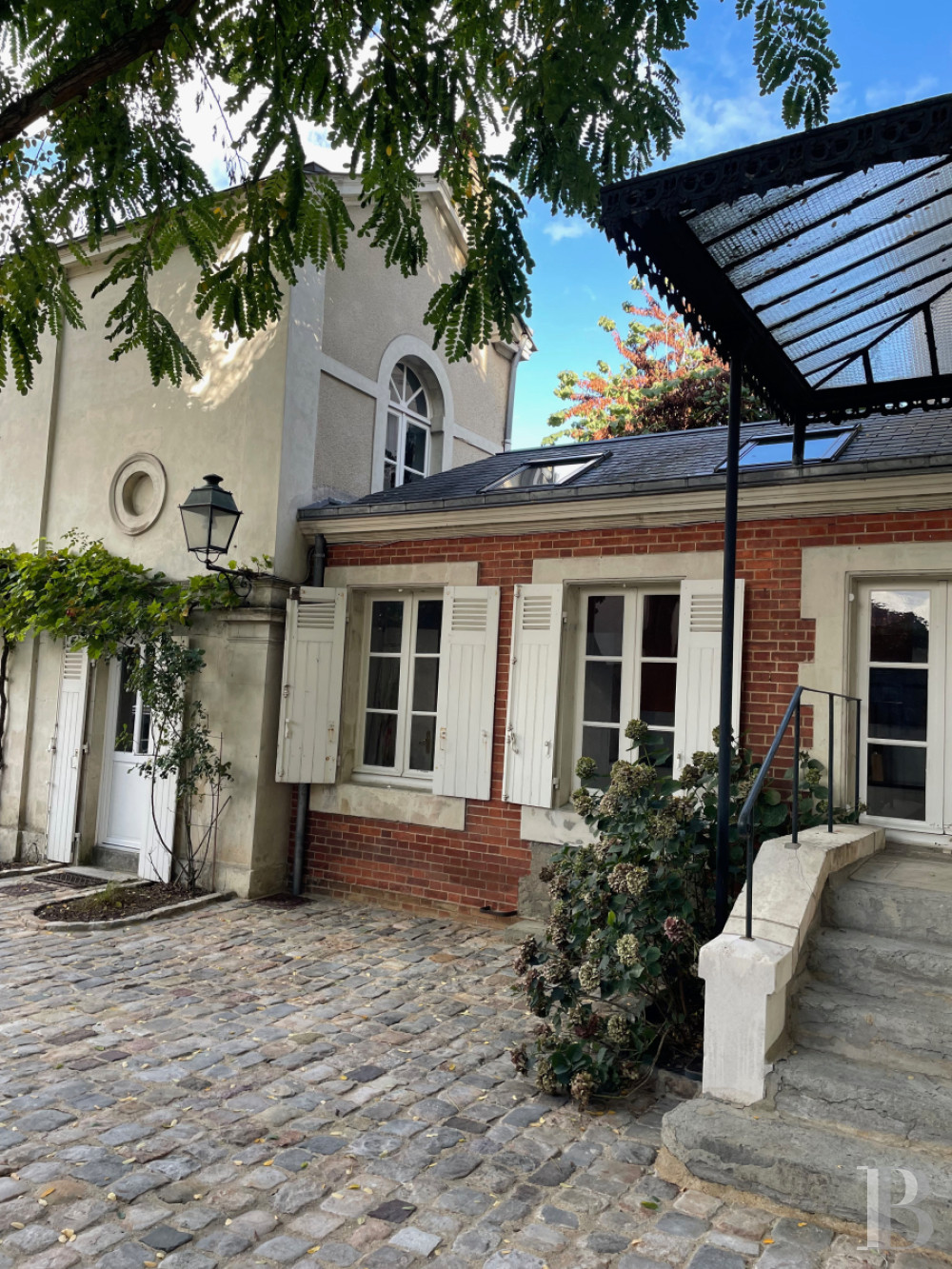 En retour d'équerre, élevée de deux niveaux et indépendante à l’origine, elle est à présent rattachée à la demeure principale par un bâtiment plus bas en briques anciennes, qui sert de cuisine et d'entrée de service. L'espace comprend au rez-de-chaussée le garage, en limite de propriété, avec un accès direct à la rue. L’étage, par une porte depuis la cour d’honneur, est accessible par un escalier qui distribue deux pièces à restaurer.