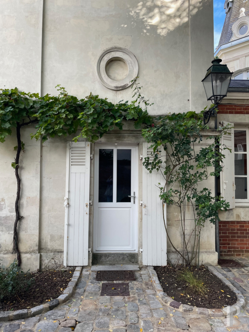 L’entrée se fait par une porte à simple battant, qui accède à un espace de belle taille avec en fond, un escalier suspendu, ainsi qu'un accès aux caves. Sur un côté, une porte à double vantail dessert une pièce de réception, d’une surface de plus de 60 m². De cet espace lumineux, la vue porte sur le jardin via trois larges baies anciennes. De l'autre côté, un dégagement mène à des toilettes, une buanderie puis à une cuisine contemporaine aménagée et équipée dans un bâtiment plus bas construit en briques. À sa suite, une entrée de service donne sur la cour d’honneur et le garage.