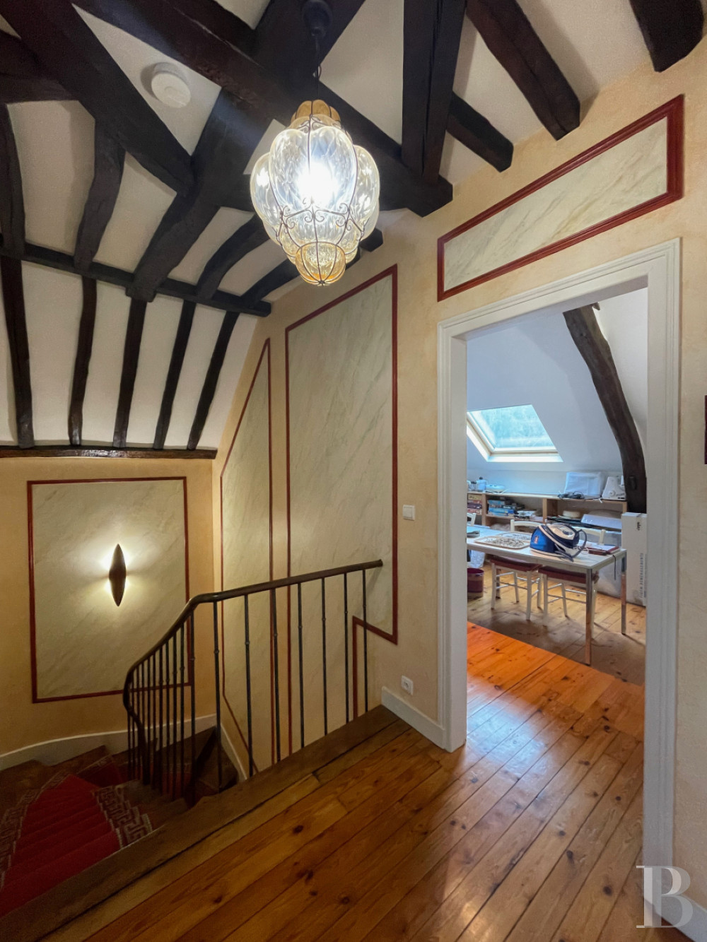 Le palier dessert trois chambres et une spacieuse salle de bains avec baignoire, douche à l’italienne et toilettes. Un système de chromothérapie est intégré dans le plafond. Les éléments de charpente sont en partie apparents.