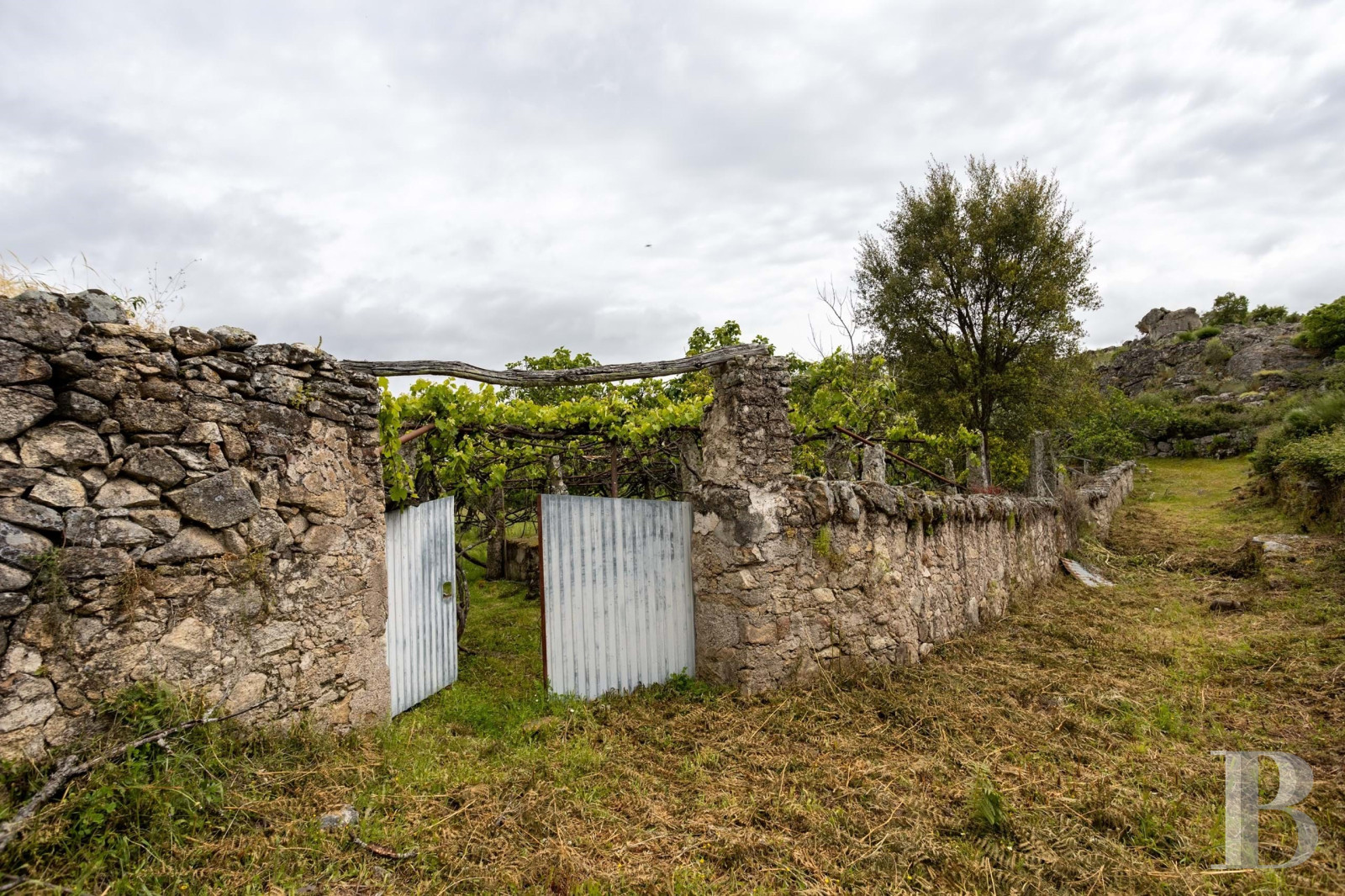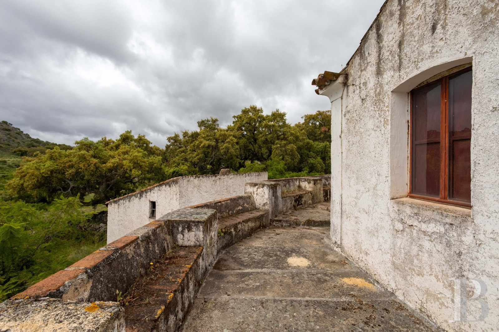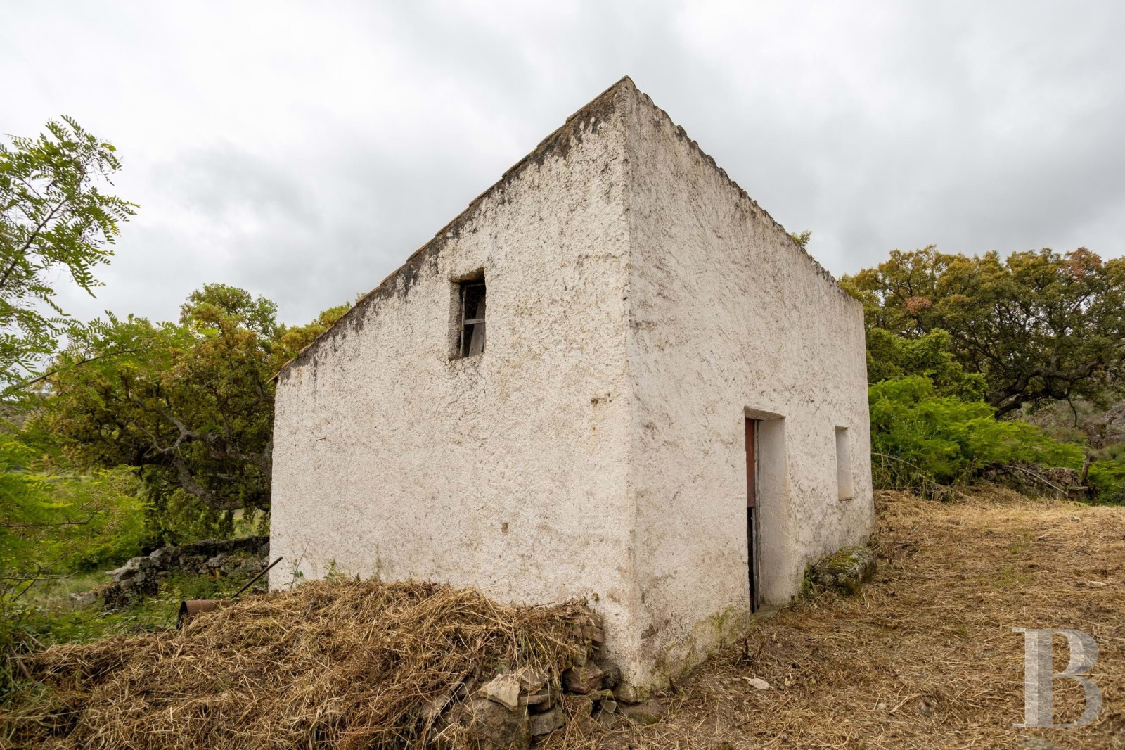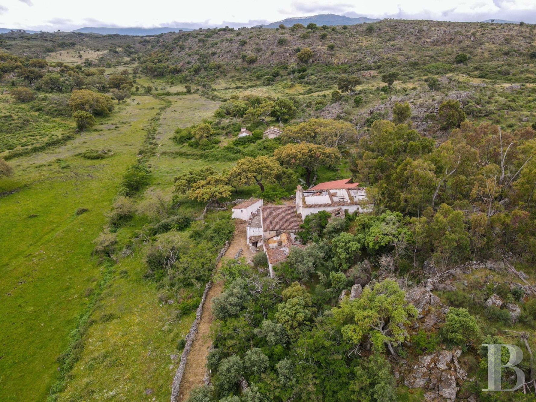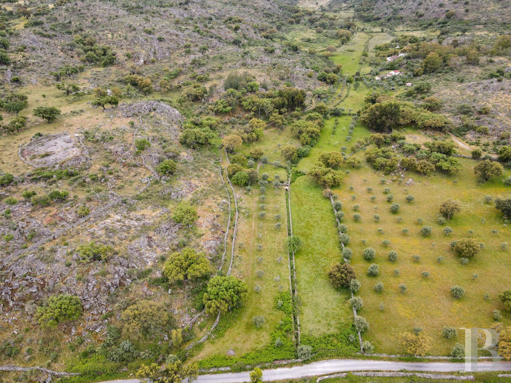 Au cœur du parc naturel de São Mamede, plusieurs bâtiments forment un ensemble à restaurer. Le corps principal compte deux niveaux. Le rez-de-chaussée garde les anciennes étables, une crèche et une cave. Trois constructions annexes complètent le site. Le terrain plat d’environ trois hectares porte des oliviers et des chênes-lièges en production. Des vignes de Morangão poussent près du ruisseau. Deux puits et plusieurs citernes en pierre équipent la parcelle. Aucun raccordement n’existe : ni électricité, ni eau courante, ni assainissement. L’ensemble occupe une position isolée dans une zone calme. La propriété demande une intervention complète pour être habitable.