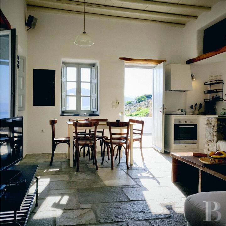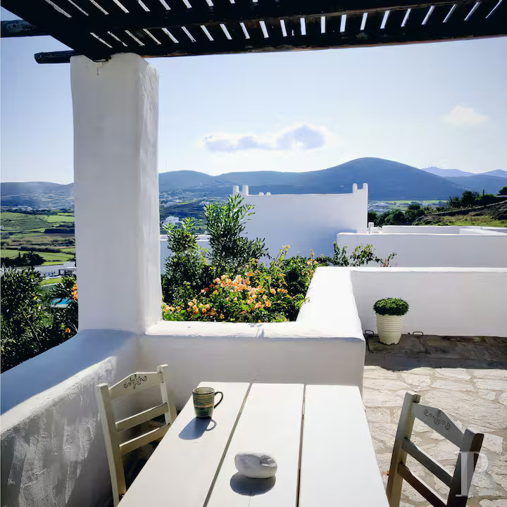 Un refuge cycladique : la formule se justifie lorsque authenticité architecturale, perspectives maritimes et tranquillité se donnent rendez-vous sur les hauteurs sculptées de Kolymbithres. Ici, dominant la baie de Naoussa, 133 m² répartis sur deux niveaux et 2 800 m² de terrain préservé composent un ensemble où vie familiale et accueil d'invités trouvent leur équilibre naturel. La position dominante sur les formations rocheuses de Kolymbithres, les plages accessibles en quelques minutes à pied, et le village animé de Naoussa à sept minutes en voiture composent un cadre privilégié. Un lieu qui se prête aussi bien à résidence permanente qu'à villégiature saisonnière, dans un territoire de Paros qui maintient authenticité cycladique et paysages côtiers préservés, où les rochers sculptés par les vagues dessinent depuis des siècles l'une des côtes les plus photographiées des Cyclades.