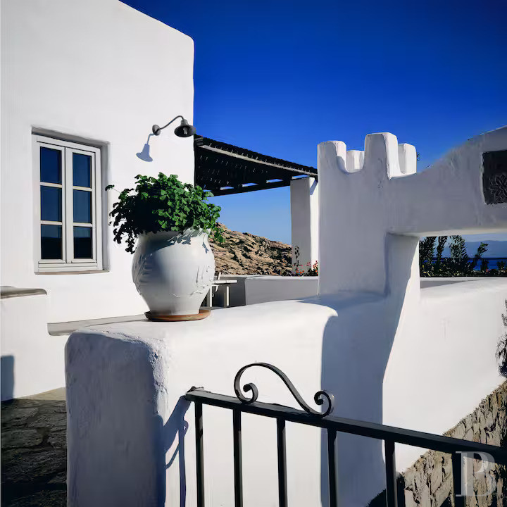 une maison cycladique de 133 m² sur 2 800 m² de terrain avec vue panoramique sur la baie de Naoussa