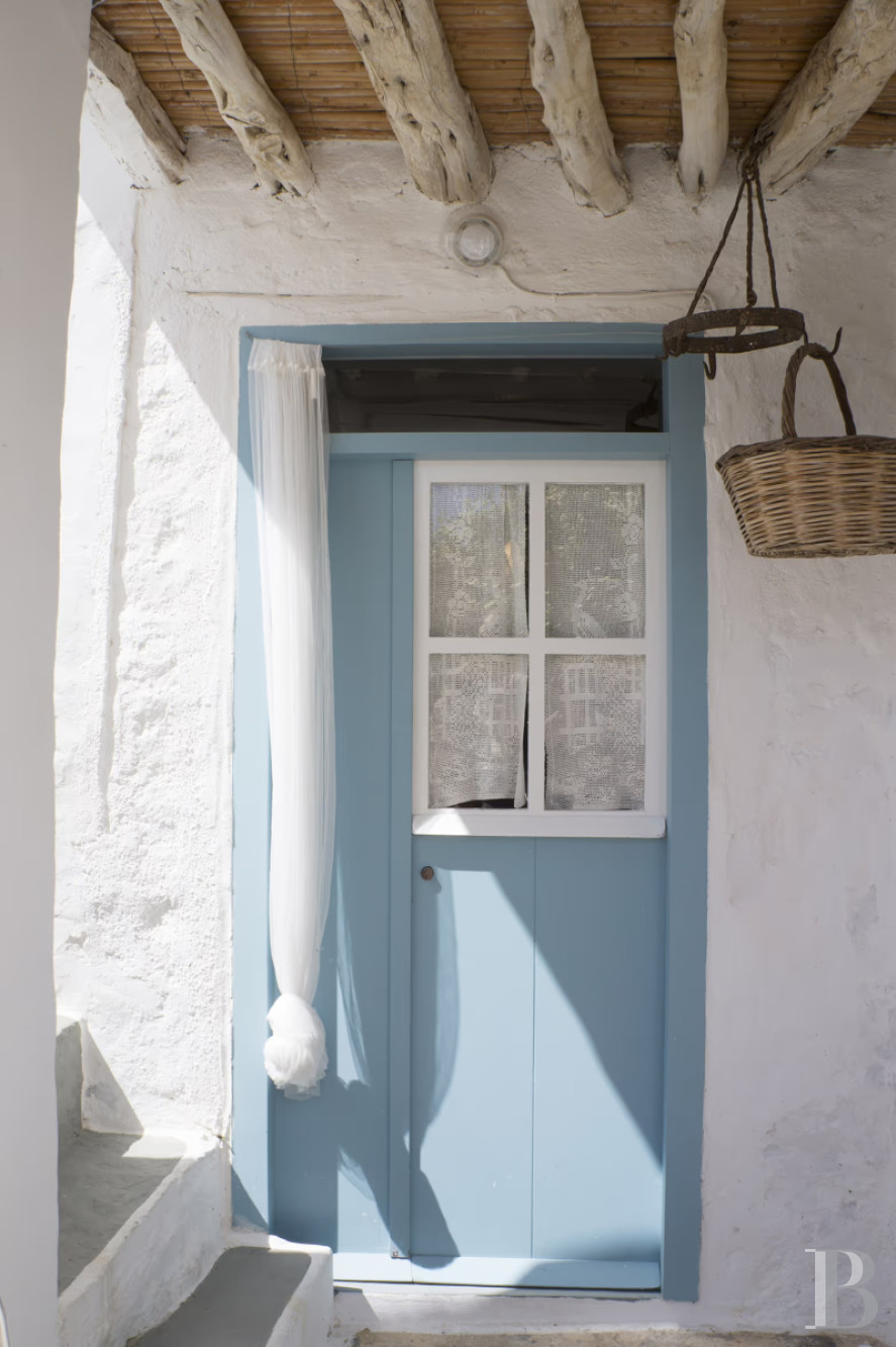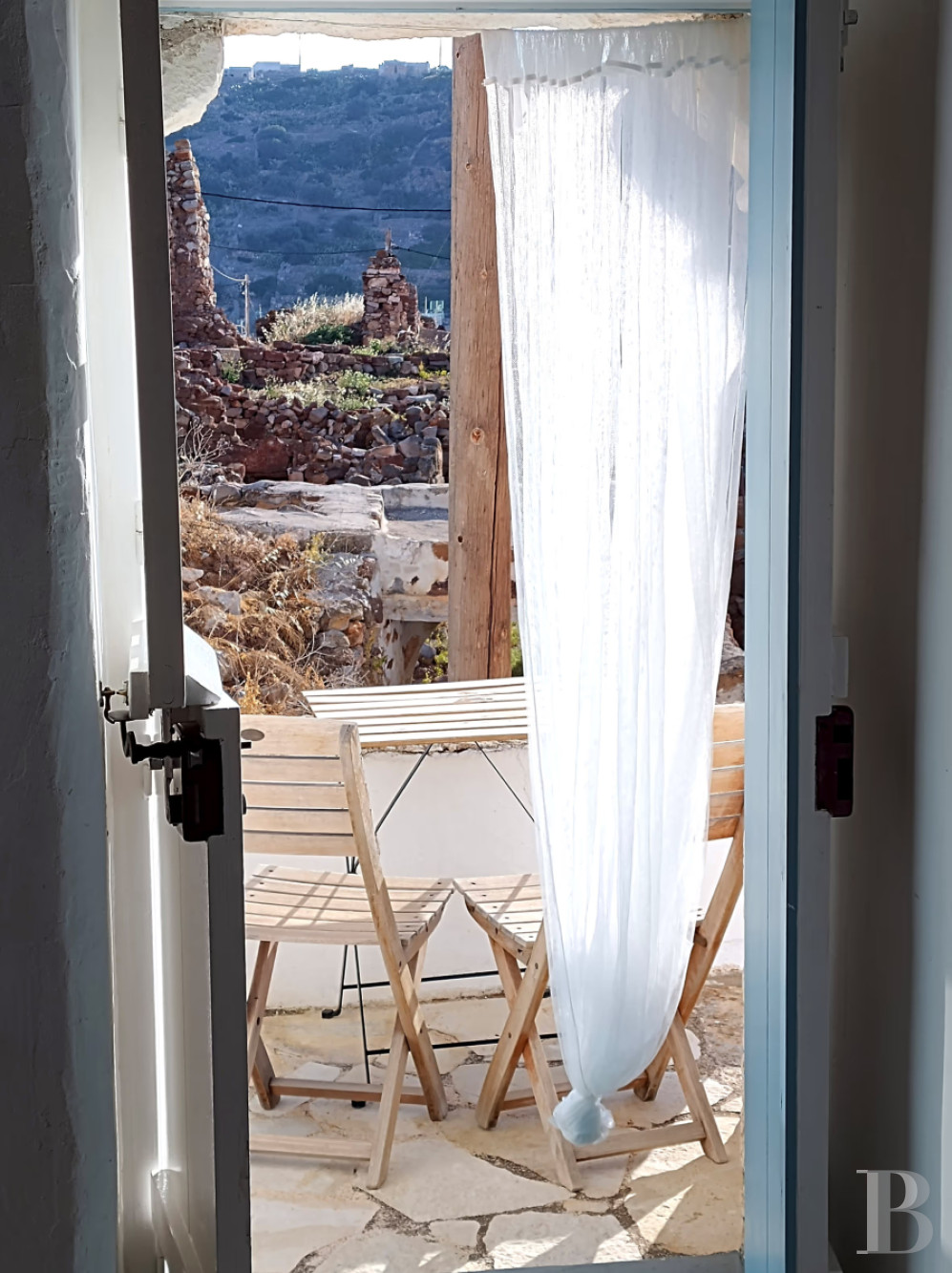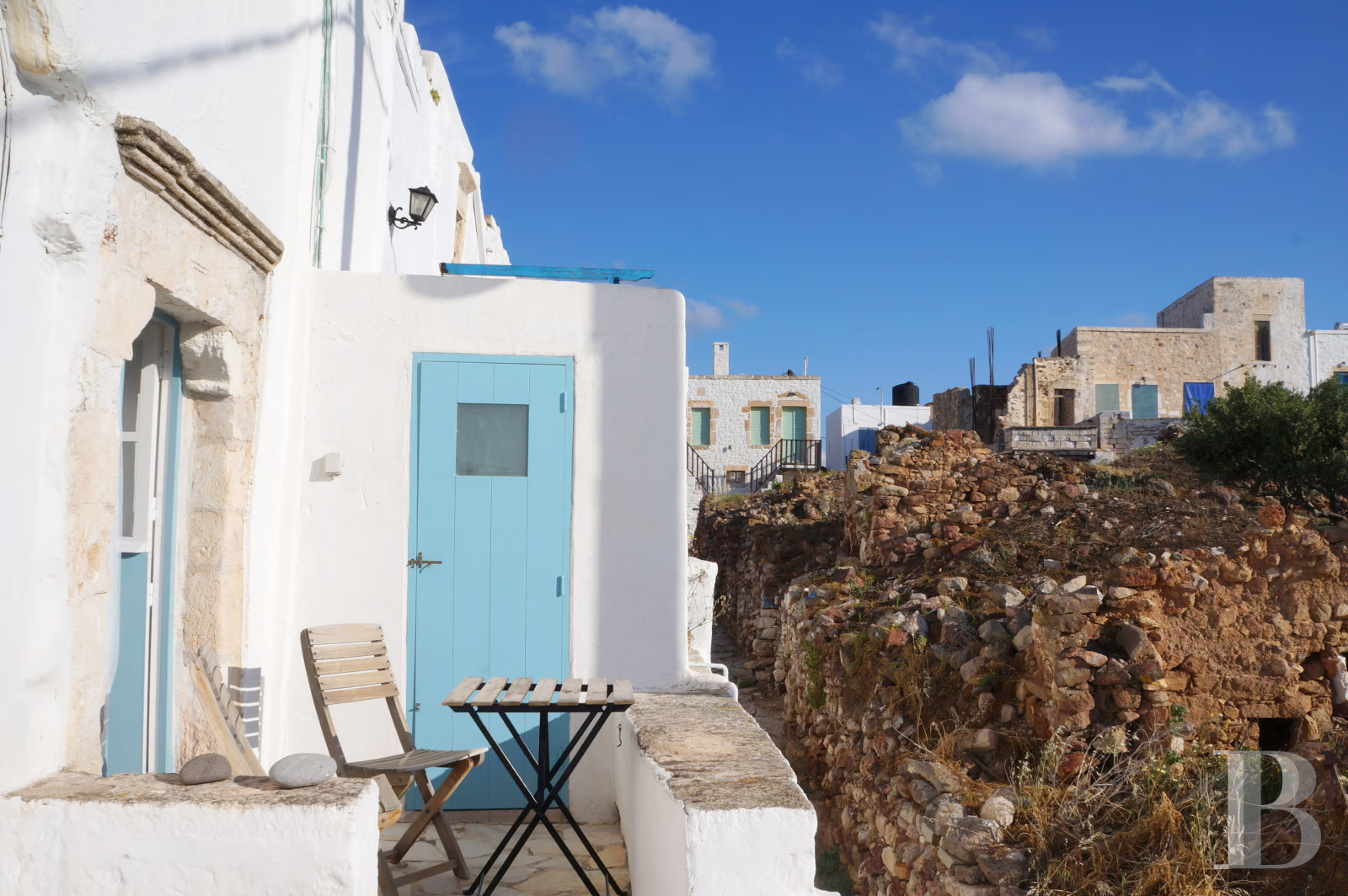 Les 100 m² de volumes blanchis à la chaux forment un sanctuaire domestique au cœur du kastro médiéval, où les ruelles étroites et les fortifications dessinent un paysage urbain figé depuis des siècles. Restaurée en 2008 sous la surveillance de l'Éphorat des Antiquités byzantines, la demeure a conservé ses éléments vernaculaires : foyers en pierre, vasques en marbre de Tinos, escalier extérieur grimpant le long de la façade. La maison convient à qui recherche un ancrage dans l'histoire cycladique, au sein d'un ensemble médiéval préservé où la vie insulaire s'organise encore selon des codes séculaires, entre mer Égée et tradition artisanale.