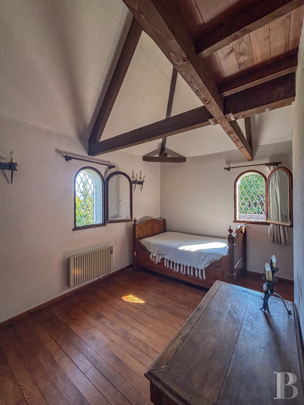 Accessible par le garage et l’aire de stationnement extérieure de la demeure, il est intégré à la base du volume principal. Le garage se distingue par une large ouverture encadrée de piédroits en pierre et d’un arc en plein cintre. Au-delà, un couloir dessert les différentes pièces du niveau inférieur. Un atelier, une salle de danse et une salle de jeux y prennent place, voisins d’une buanderie et d’une salle d’eau. De fines et hautes baies, percées sur la façade sud-ouest, laissent pénétrer la lumière du jour et assurent une ventilation naturelle.