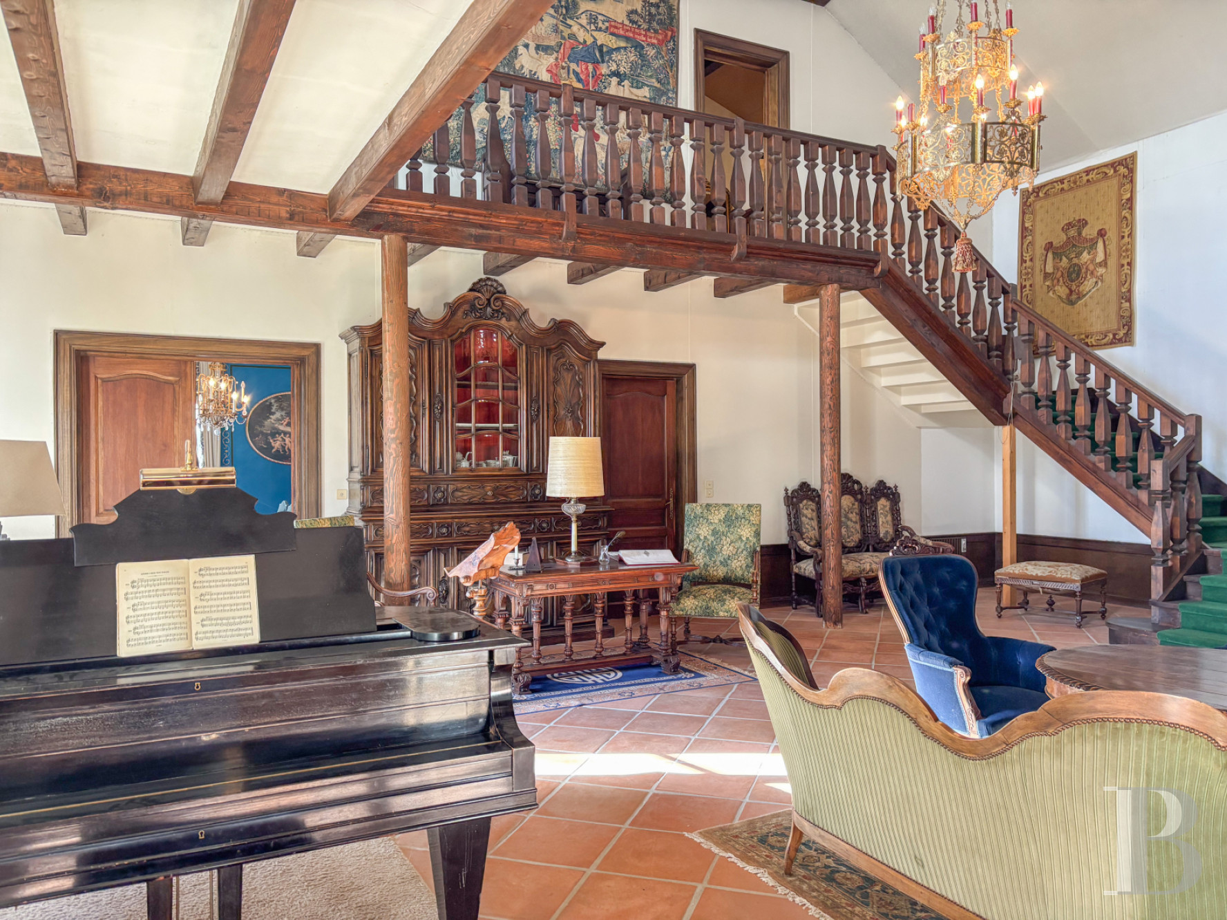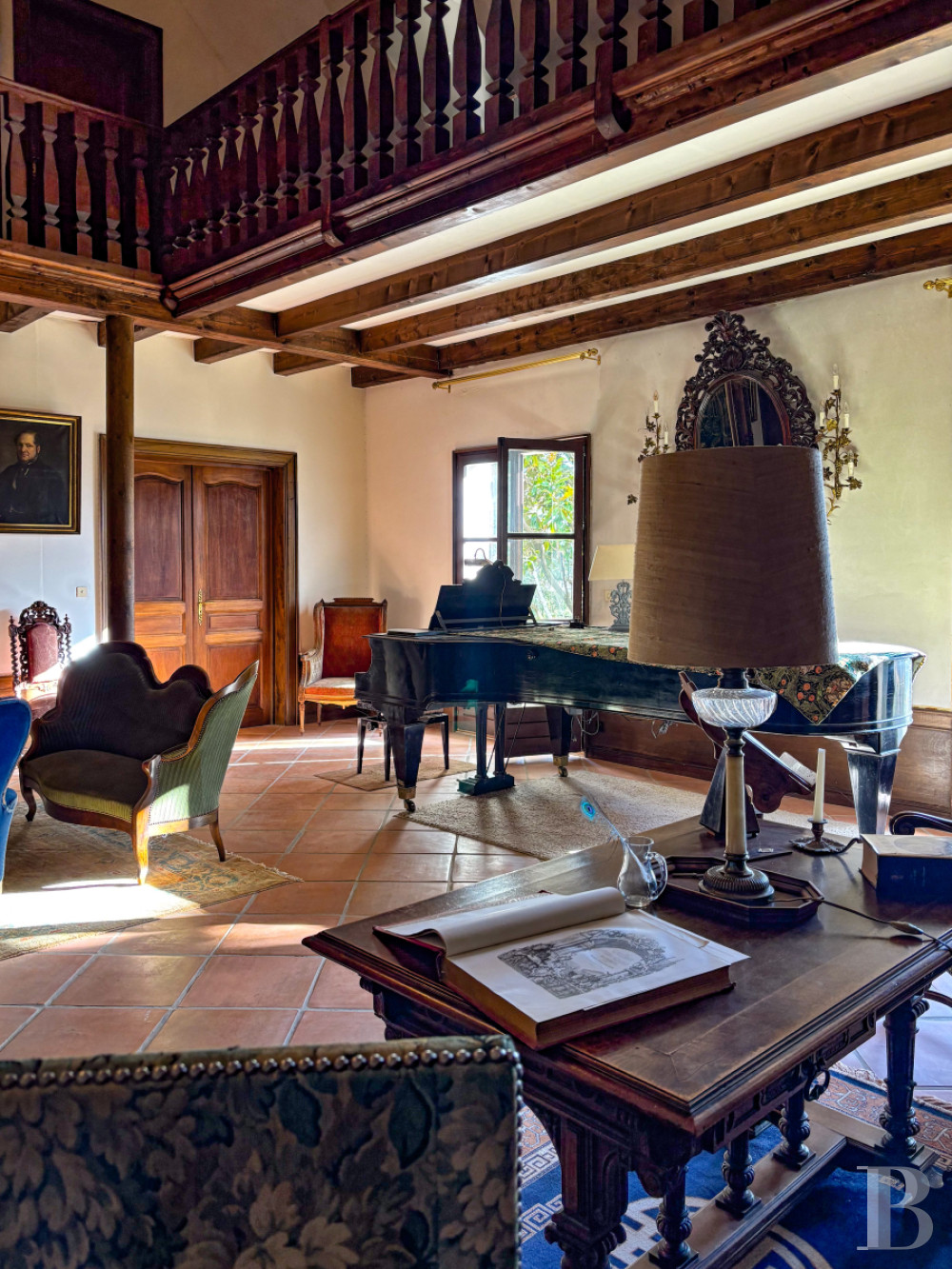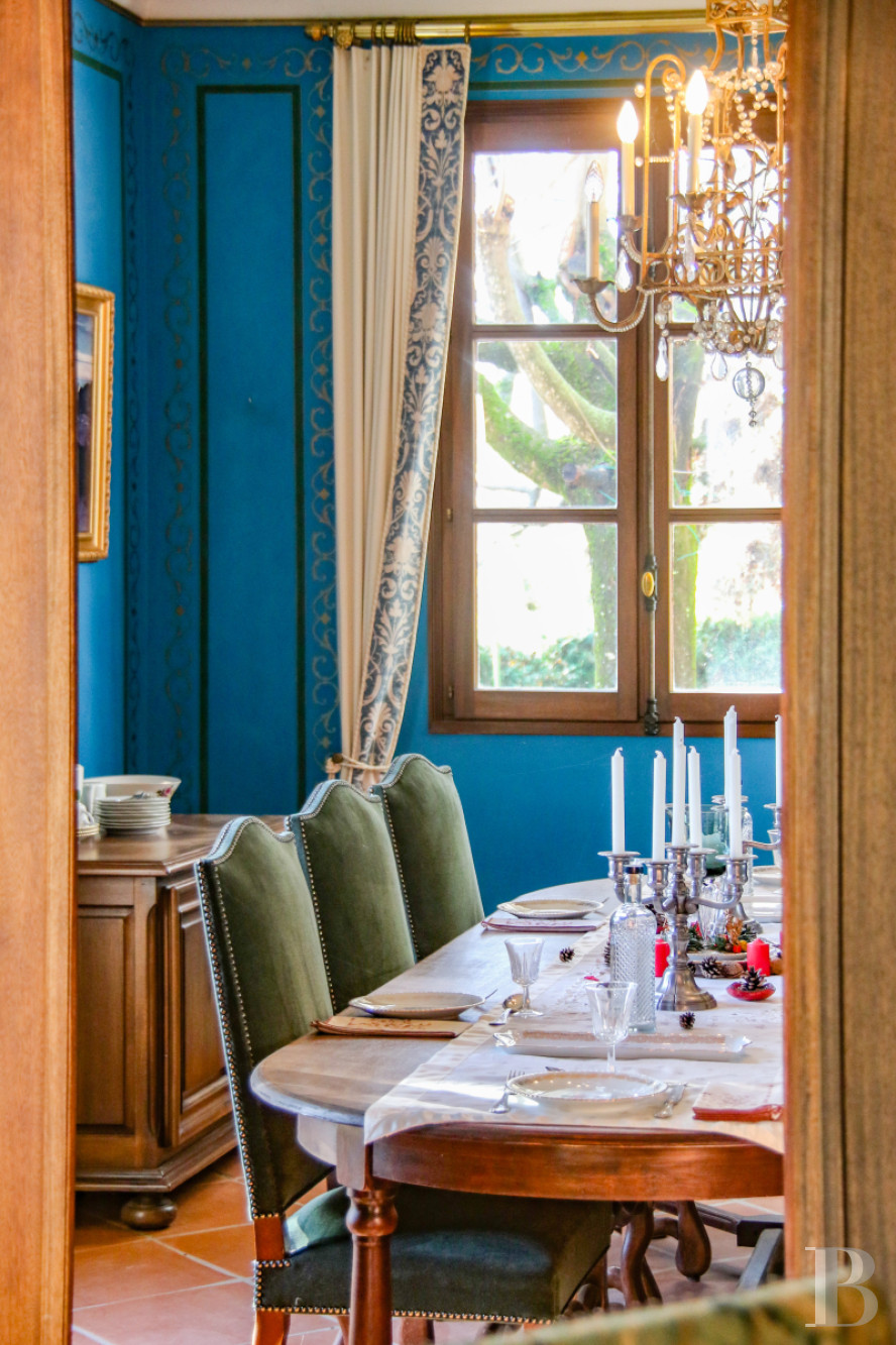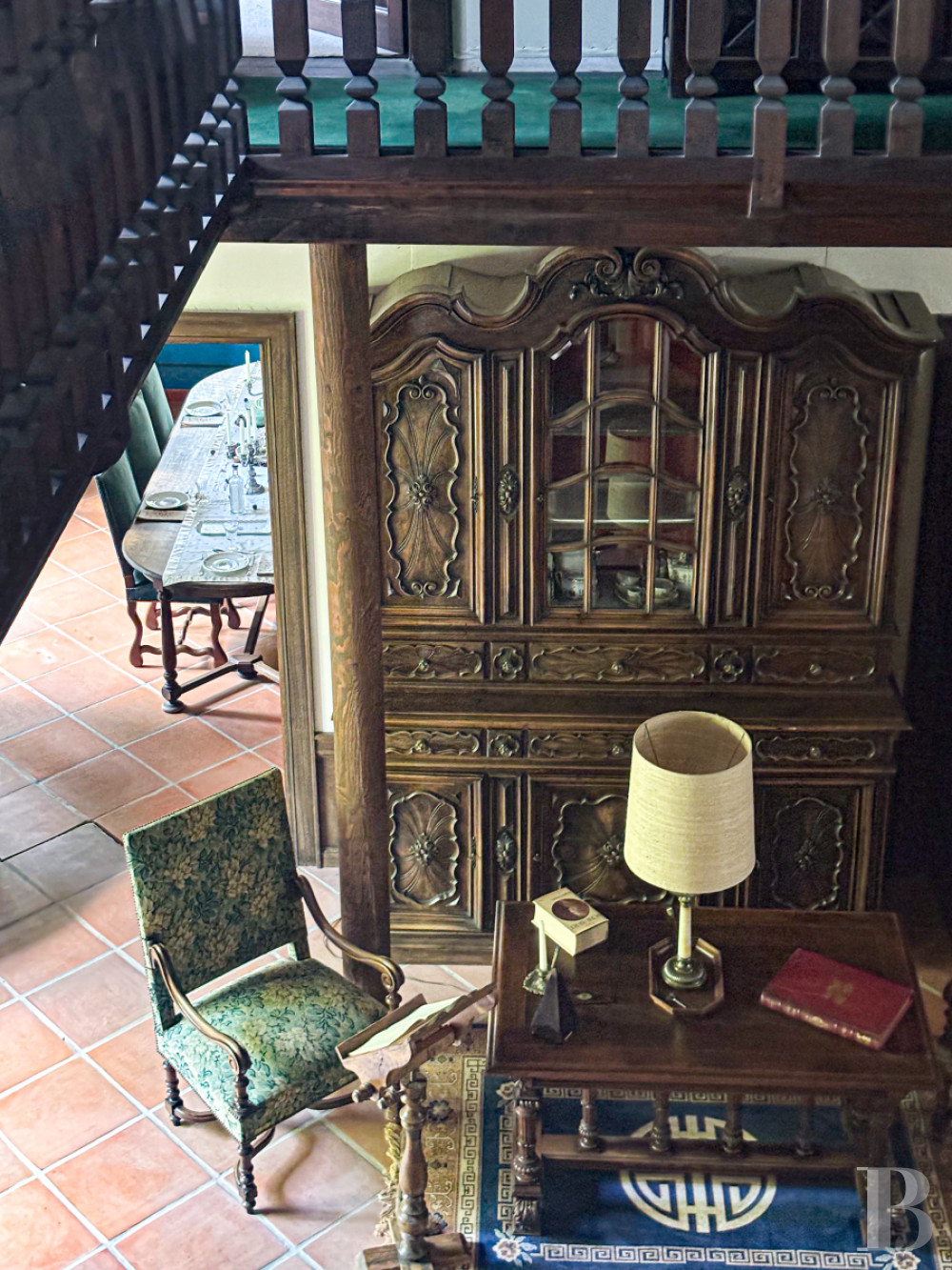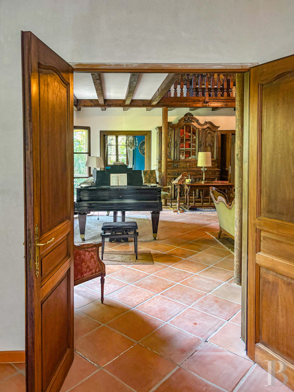 De l’autre côté, une salle à manger est pavée de tomettes, assorties aux teintes des boiseries. De là, l’espace conduit vers un vaste hall de réception, orné d’une grande cheminée, d’une bibliothèque et de coins de détente. Véritable centre de distribution intérieure, le hall, organisé en double hauteur, s’articule autour d’un escalier monumental. Dans le prolongement, se trouve une salle de bains décorée de carreaux à motifs géométriques fins, avec double vasque et grands miroirs encastrés et des toilettes indépendantes.