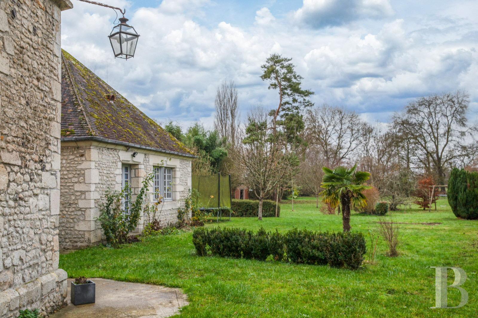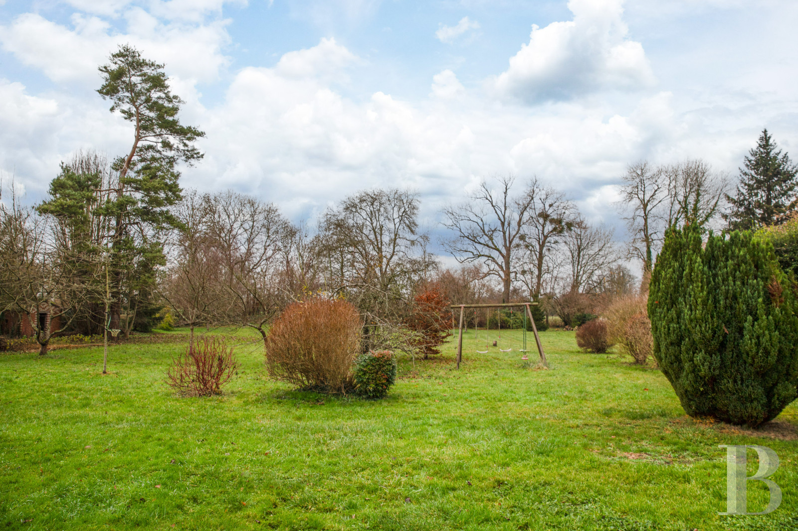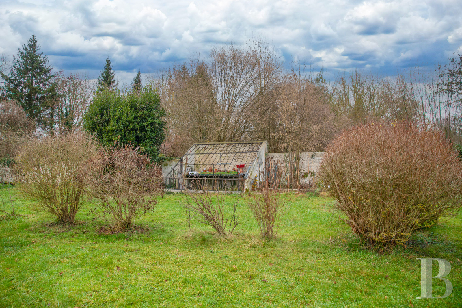 Il compose une vaste étendue vers l'ouest, fermé par de grands arbres et jalonnée d'arbustes et fruitiers. L'ensemble est en grande partie clôturé d'un mur d'enceinte. Un portail au sud donne un accès direct au jardin et au garage. Une ancienne serre est adossée au mur d'enceinte au nord de la parcelle. La structure en fer forgé attend de nouvelles vitres.