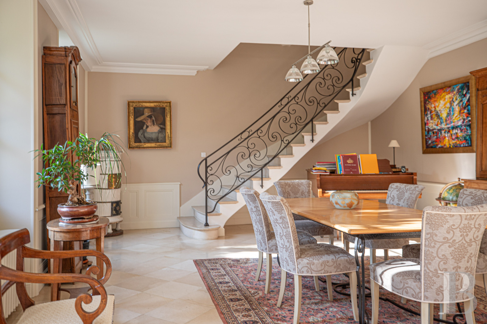 L'entrée, séparée d'une cuisine par une verrière, distribue également une arrière-cuisine, des toilettes et un salon-salle à manger. Dans l'entrée et la cuisine, le sol est carrelé à cabochons et le plafond à la française. Le salon-salle à manger occupe tout le rez-de-chaussée d'un des deux corps de logis. Il est éclairé par quatre baies et une porte-fenêtre, qui ouvrent toutes sur le jardin. Une porte-fenêtre ouvre aussi sur la cour arrière. Une cheminée en pierre blanche est adossée à l'un des murs, qui sont tous habillés de lambris d'appui. En face, un escalier en pierre avec rampe en fer forgé mène à l'étage. Le sol de cette pièce est en pierre de combe brune.