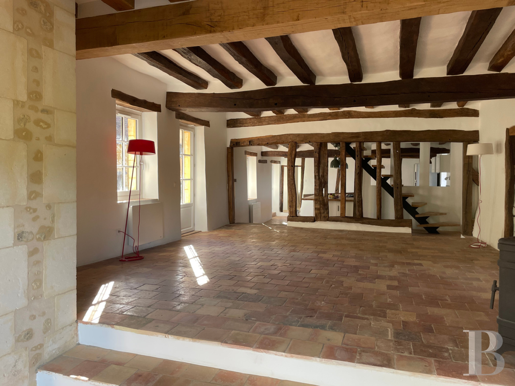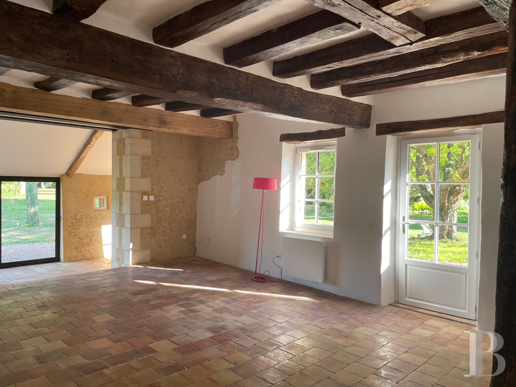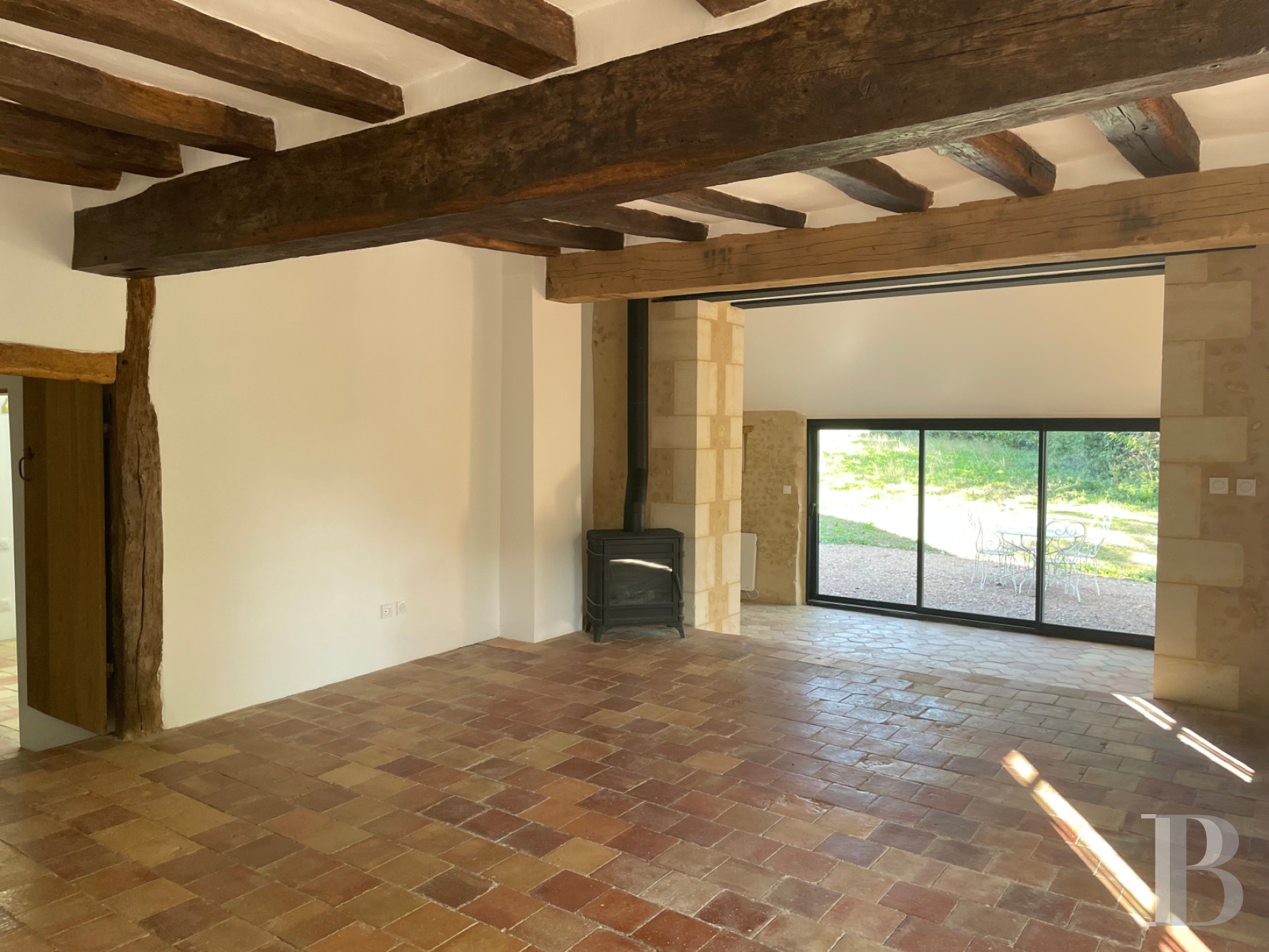 Les plafonds sont à la française et les sols sont en terre cuite. Les murs sont habillés de pans de bois ou enduits et peints. Tout le côté nord, où se trouvent des pièces d’eau et une chambre, a bénéficié d’une isolation. Les baies sont munies de fenêtres à double vitrage. Côté sud, depuis des pièces de réception et une autre chambre avec cheminée, trois portes ouvrent sur l'extérieur. L’entrée a été créée dans un bâtiment plus bas en retour du logis, où se trouvait un ancien four à pain. Ouvert à l’est par de grandes baies, cet espace mène par deux marches vers un grand salon avec un poêle à bois dans un coin. S'ensuit une cuisine ouverte aménagée et équipée, séparée par des pans de bois ouverts. L'ensemble est fluide et lumineux.