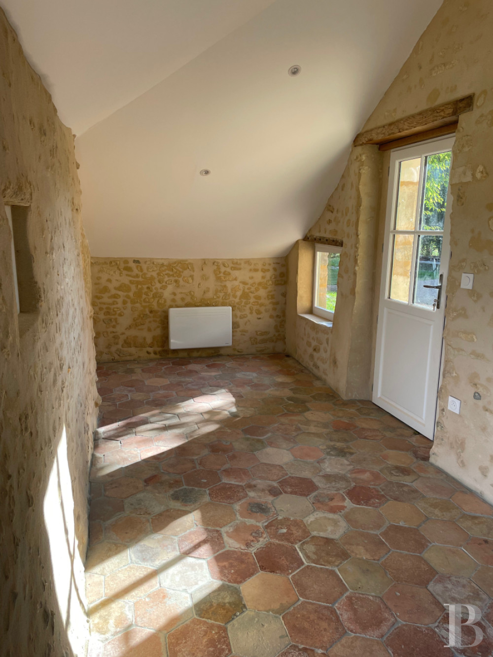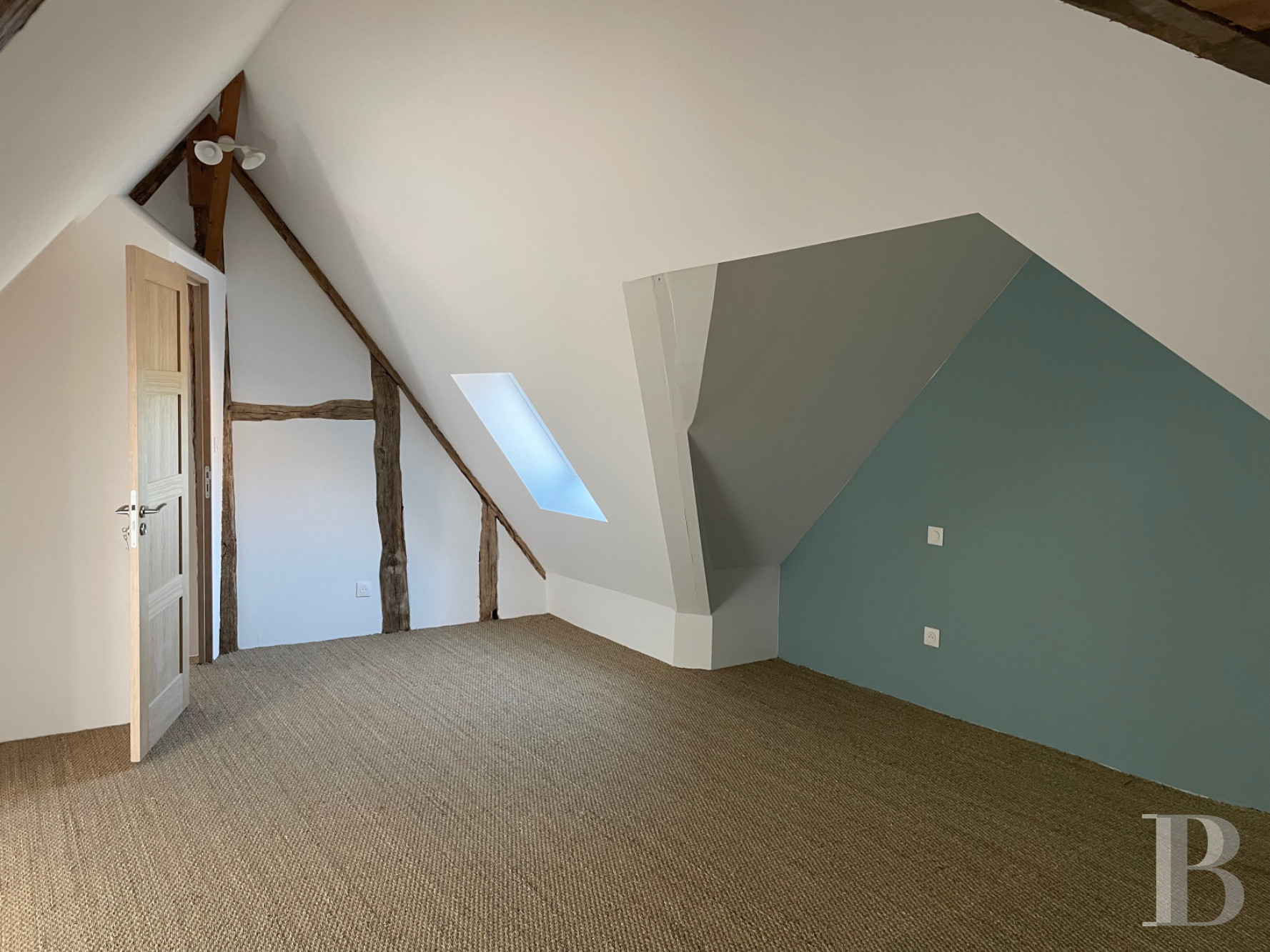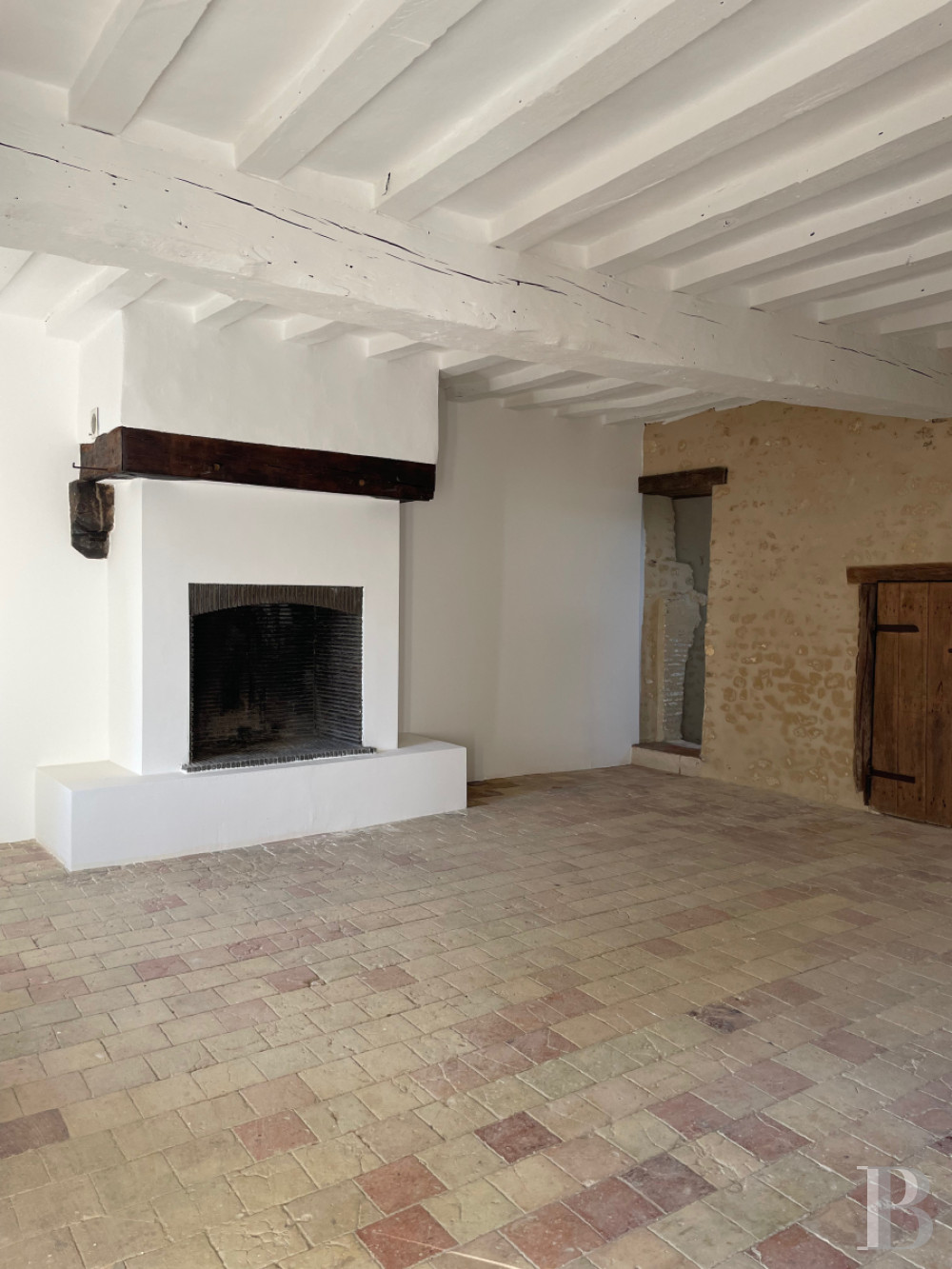 Les plafonds sont à la française et les sols sont en terre cuite. Les murs sont habillés de pans de bois ou enduits et peints. Tout le côté nord, où se trouvent des pièces d’eau et une chambre, a bénéficié d’une isolation. Les baies sont munies de fenêtres à double vitrage. Côté sud, depuis des pièces de réception et une autre chambre avec cheminée, trois portes ouvrent sur l'extérieur. L’entrée a été créée dans un bâtiment plus bas en retour du logis, où se trouvait un ancien four à pain. Ouvert à l’est par de grandes baies, cet espace mène par deux marches vers un grand salon avec un poêle à bois dans un coin. S'ensuit une cuisine ouverte aménagée et équipée, séparée par des pans de bois ouverts. L'ensemble est fluide et lumineux.