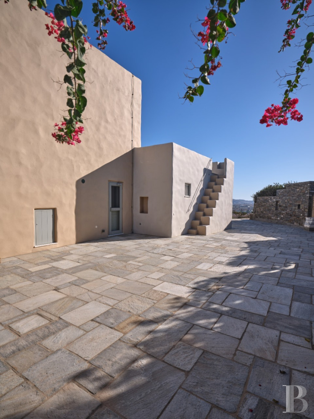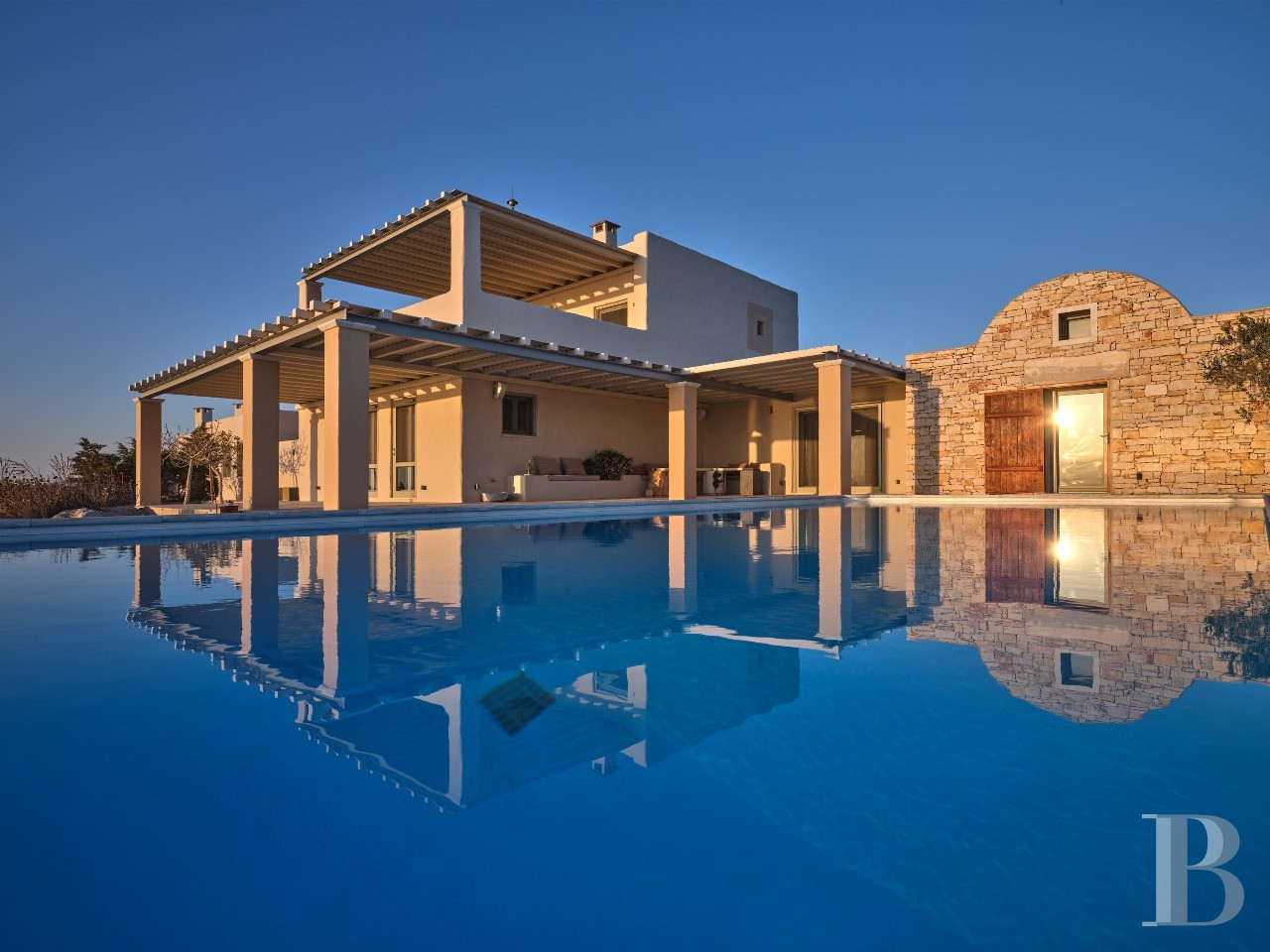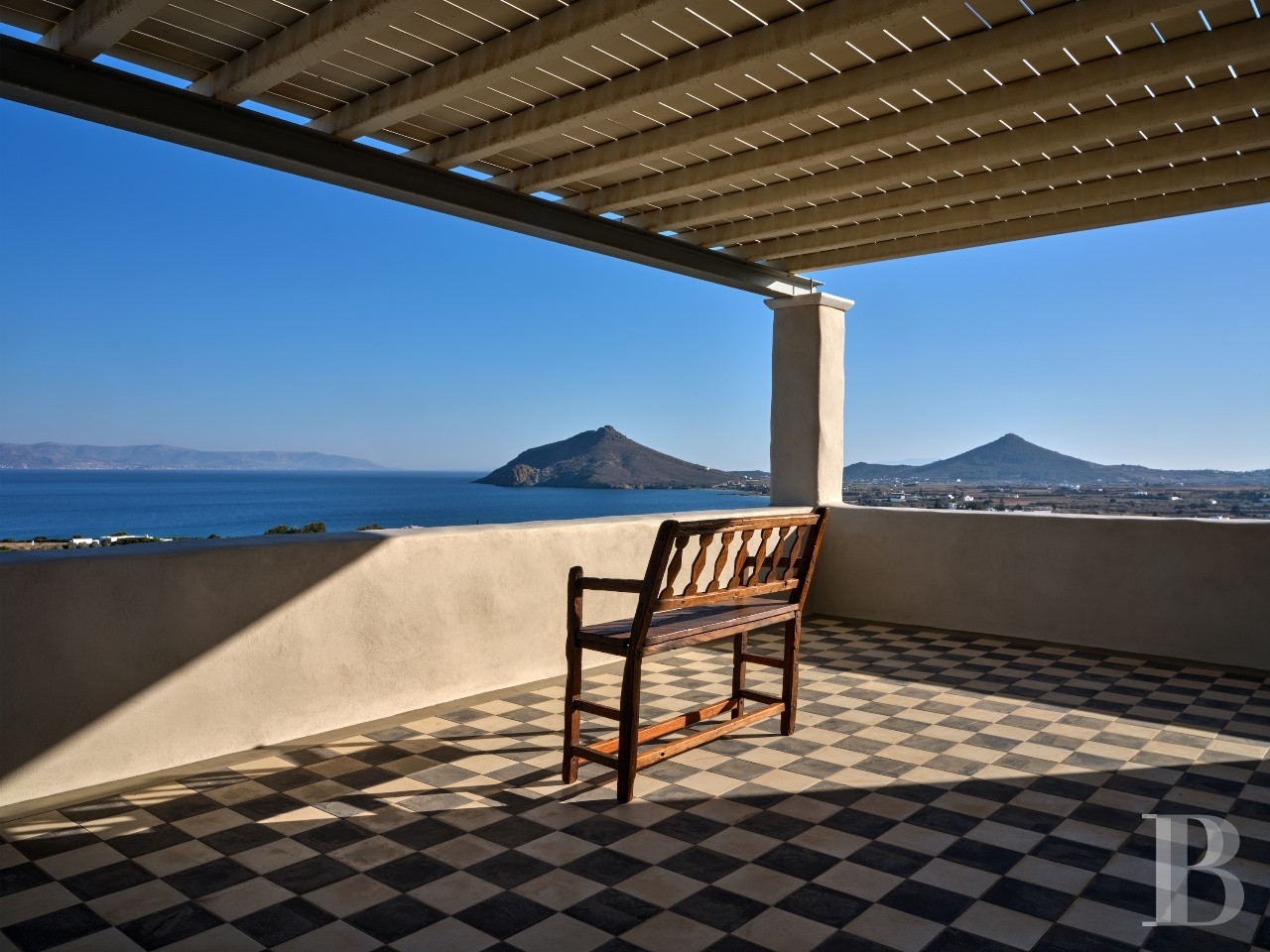 Il est des villas dont la beauté tient moins à la démonstration architecturale qu'à l'équilibre qu'elles instaurent entre modernité épurée et harmonie avec le paysage insulaire. Celle-ci en fait partie. Son architecture contemporaine, dominant discrètement la baie d'Isterni, conjugue rigueur des volumes spacieux et intensité des perspectives maritimes. À l'intérieur, les espaces généreux, les ouvertures panoramiques sur la mer et le ciel bleu, et la séparation harmonieuse entre résidence principale et grande maison d'hôtes par une chapelle privée, créent un univers à la fois intime et ouvert, où rien n'est contraint. La position en hauteur sur les collines d'Isterni, hameau tranquille de Paros, offre ce privilège de perspectives maritimes exceptionnelles dans un environnement préservé de toute construction voisine. Tout est là, rien à ajouter.