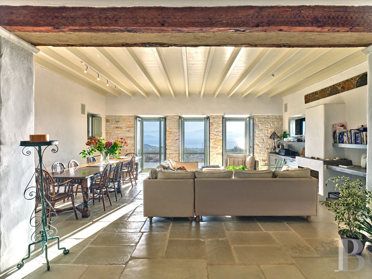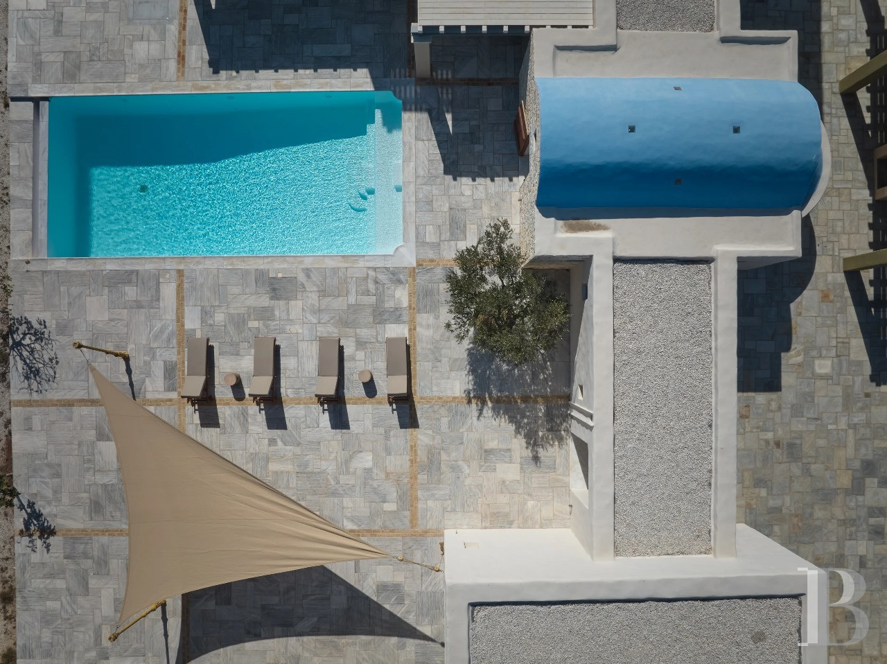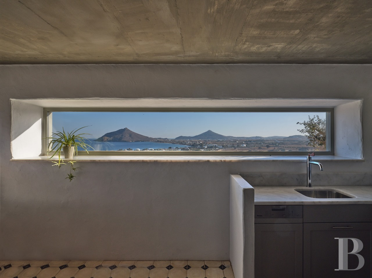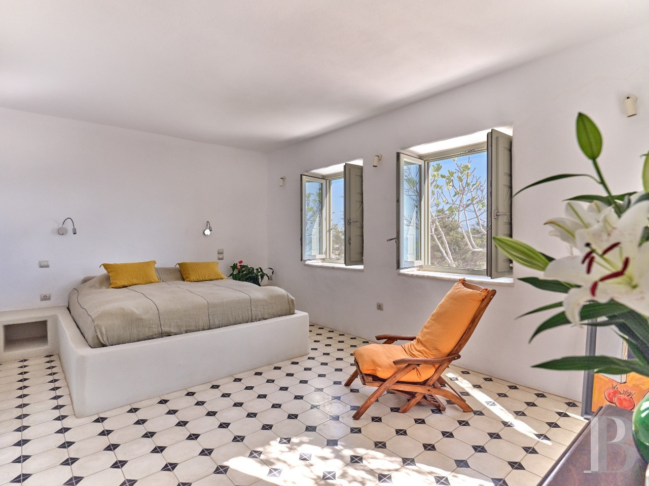 Il est des villas dont la beauté tient moins à la démonstration architecturale qu'à l'équilibre qu'elles instaurent entre modernité épurée et harmonie avec le paysage insulaire. Celle-ci en fait partie. Son architecture contemporaine, dominant discrètement la baie d'Isterni, conjugue rigueur des volumes spacieux et intensité des perspectives maritimes. À l'intérieur, les espaces généreux, les ouvertures panoramiques sur la mer et le ciel bleu, et la séparation harmonieuse entre résidence principale et grande maison d'hôtes par une chapelle privée, créent un univers à la fois intime et ouvert, où rien n'est contraint. La position en hauteur sur les collines d'Isterni, hameau tranquille de Paros, offre ce privilège de perspectives maritimes exceptionnelles dans un environnement préservé de toute construction voisine. Tout est là, rien à ajouter.