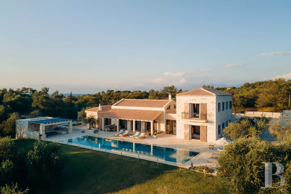 Face à la mer Ionienne, une villa d'architectes primés s'inscrit dans un écosystème de 7 000 m² planté de plus de 100 oliviers dont certains remontent à 150 ans, complétés d'un vignoble et d'arbres fruitiers méditerranéens. La piscine, les jardins parcourus d'allées ombragées et la plage de sable à 380 mètres composent un refuge où traditions agricoles corfiotes et confort contemporain trouvent leur équilibre. À cinq minutes de Roda et 45 minutes de Corfou, une propriété rare conjuguant verdure préservée et accessibilité ionienne.
