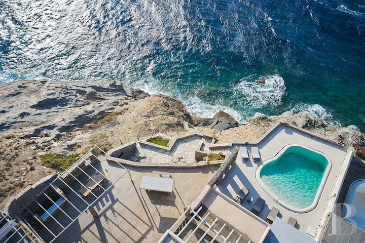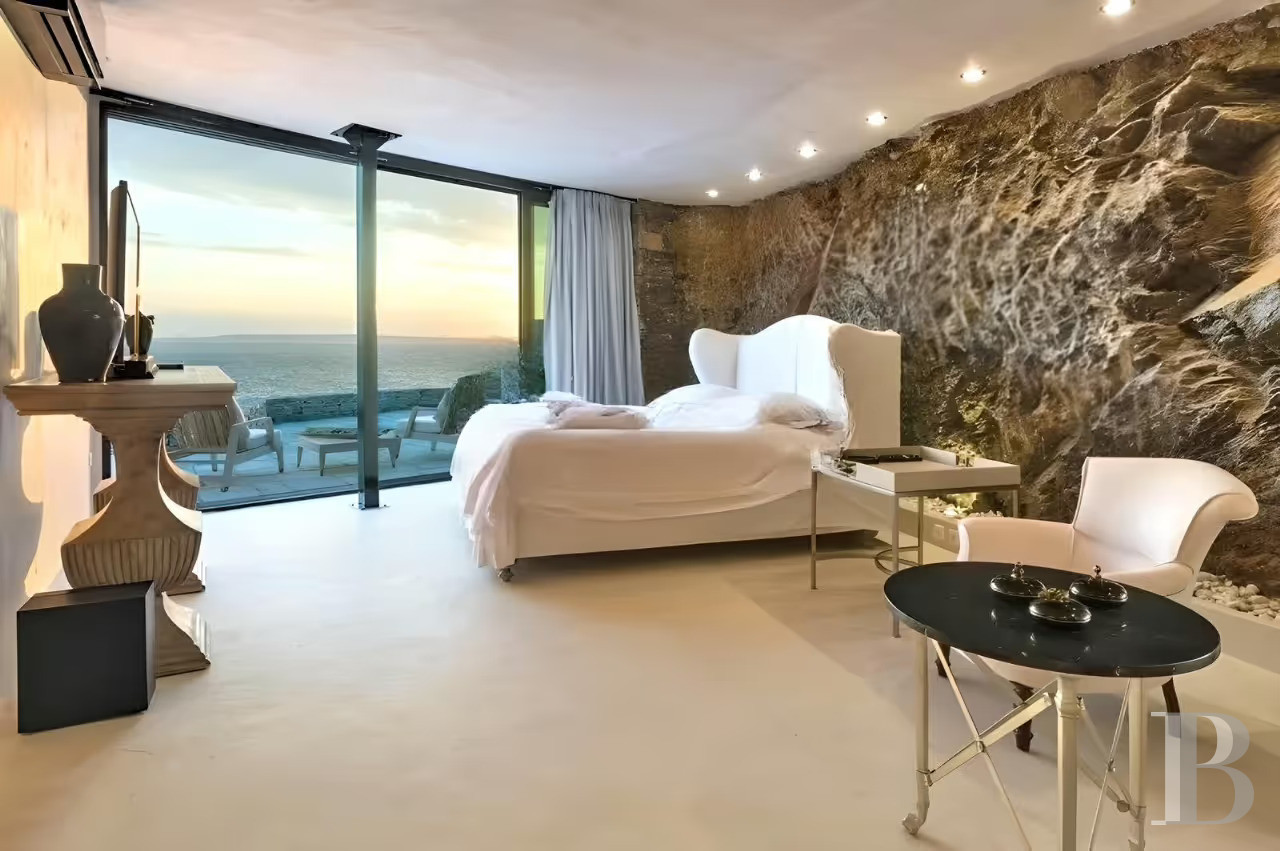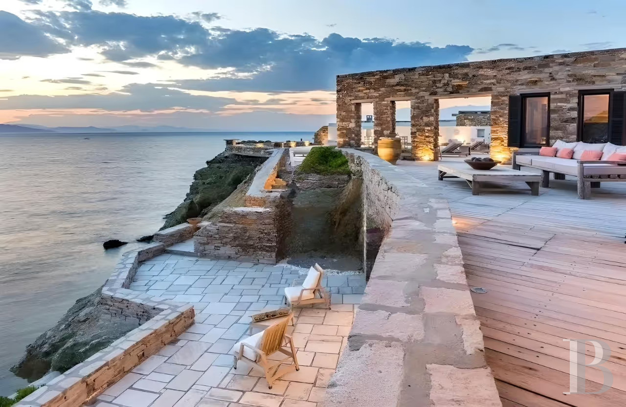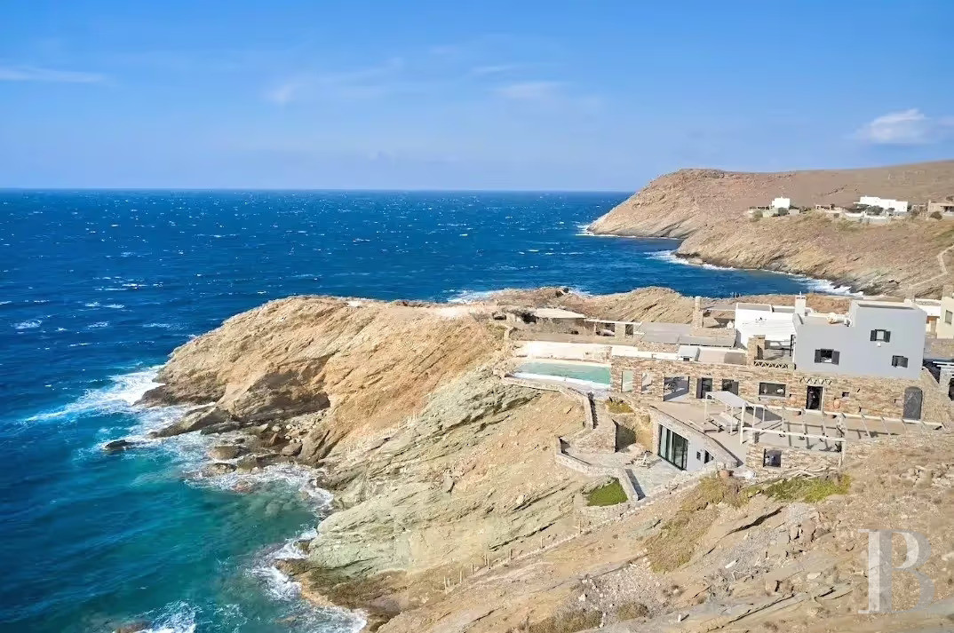 Un ensemble bâti et paysager des plus harmonieux avec, côté terrasse, des espaces de vie extérieure multiples organisés autour de la piscine d'eau salée incurvée qui dialogue avec la mer, et, côté falaise, une architecture en pierre, bois et roc qui s'intègre avec discrétion dans son environnement rocheux tout en dominant majestueusement les perspectives sur la mer Égée et les couchants méditerranéens. Un lieu particulièrement stimulant pour l'amateur d'architecture intégrée dans un cadre idéal pour étés grecs prolongés ou escapades depuis Athènes.