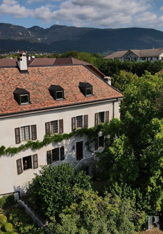 La propriété dispose d'une vue allant du Mont Blanc au Jura. Elle s'ouvre sur une cour intérieure autour de laquelle s’organisent trois bâtiments distincts : une maison de maître, une petite maisonnette, autrefois la cuisine de la propriété, aujourd'hui transformée en loft et une immense grange à la charpente monumentale dite "cathédrale", culminant à quatorze mètres de hauteur, aujourd’hui partiellement dédiée à des événements et expositions. Parmi les éléments remarquables figurent l’escalier principal avec sa rampe courbée à la main, véritable chef-d’œuvre artisanal et l’un des éléments clés de la maison. Certaines fenêtres sont d’origine, tout comme des vitres qui portent encore des marques du 17e siècle. Les cheminées, aux cadres en bois très rares – que l'on retrouve aussi à la Maison Tavel à Genève – témoignent également d’un artisanat d’exception. Lors de la restauration, nous avons retrouvé de vieux papiers peints, dont certains ont été encadrés et appelés "fenêtres de la mémoire".