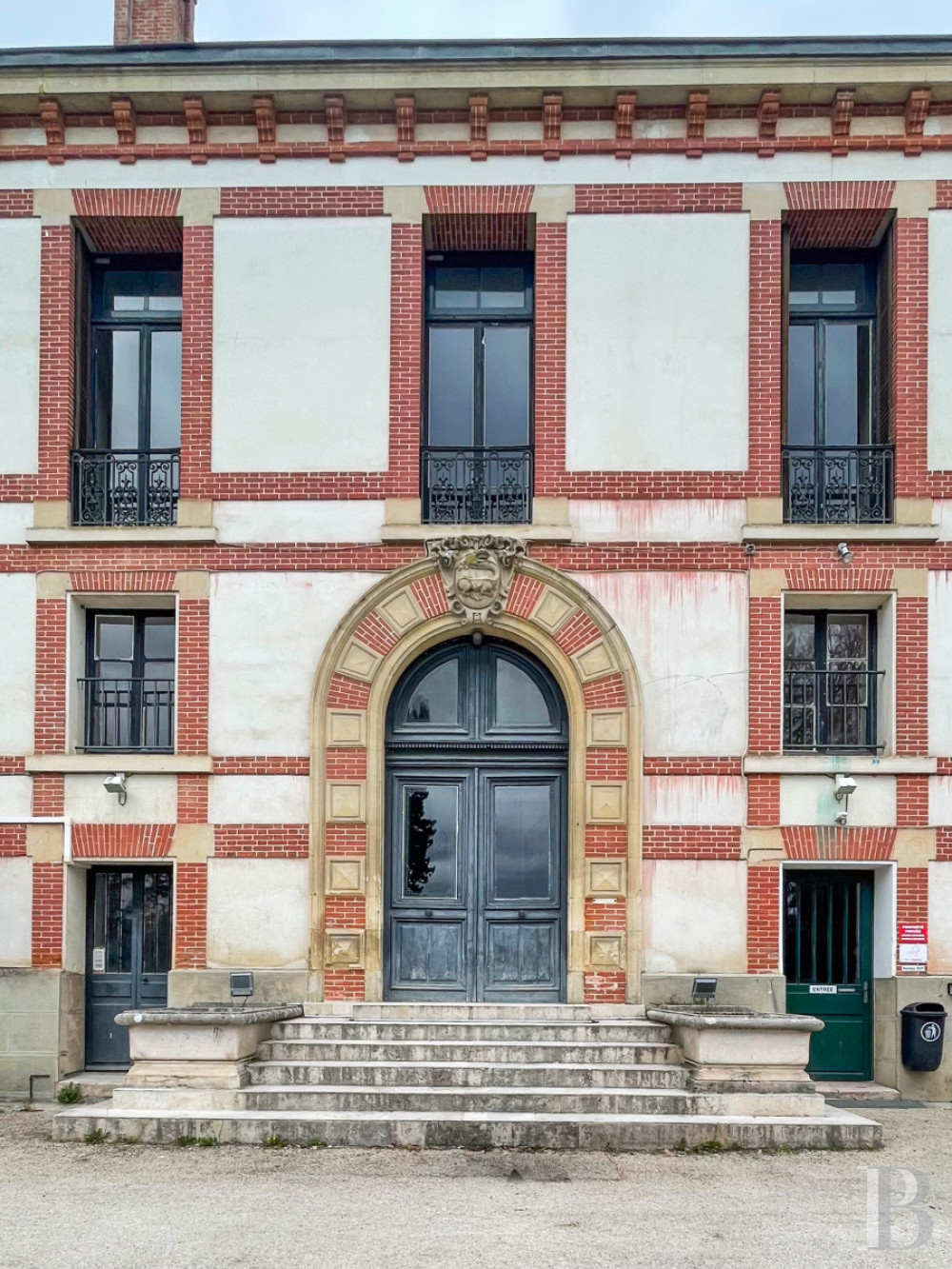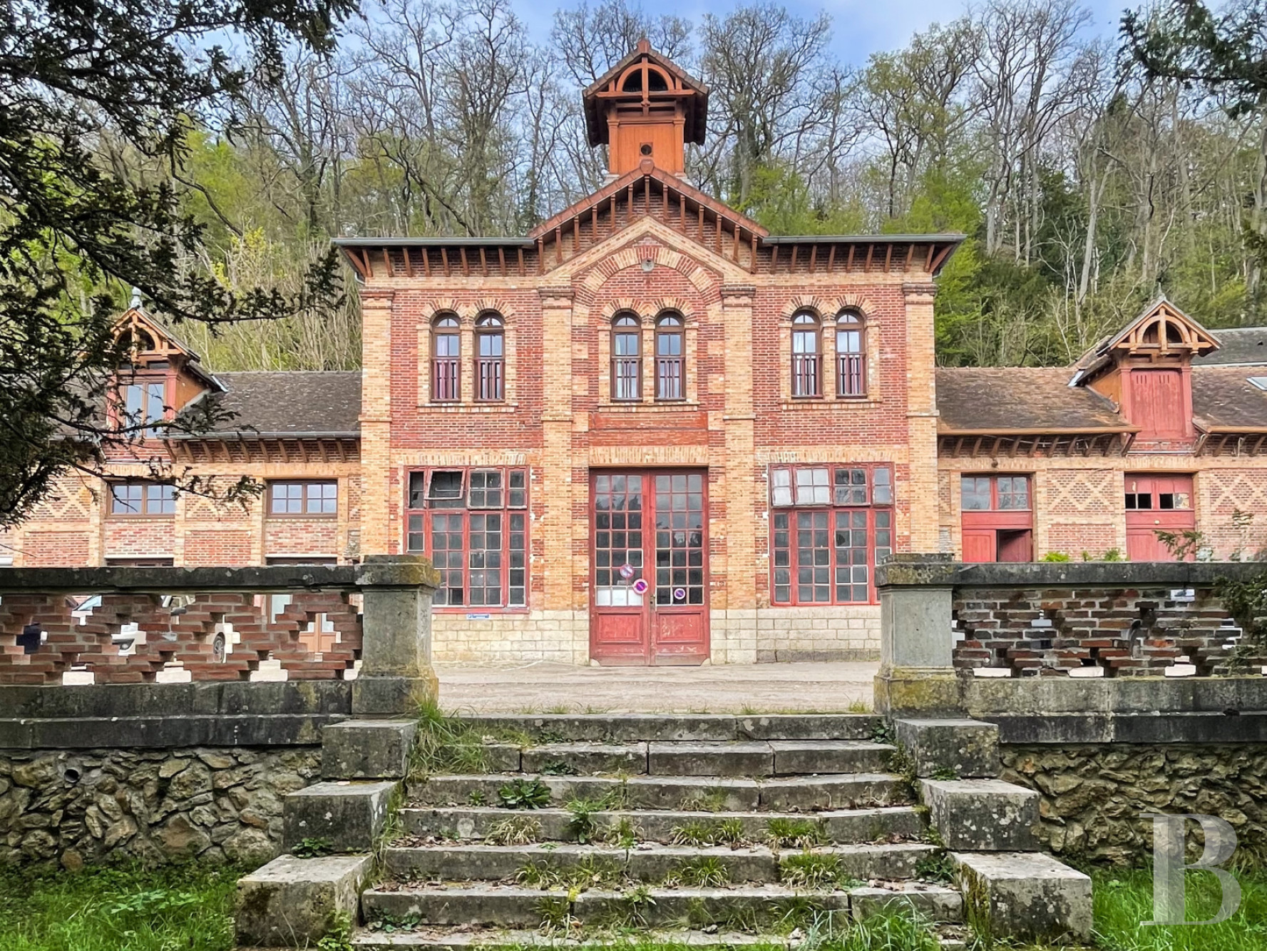 Près du bois, elles se distinguent par une architecture en brique polychrome, caractéristique de la fin du 19e s. La façade, organisée de manière symétrique, est animée par un jeu de brique rouge et clair. Le corps central, légèrement saillant, est surmonté d’un pignon et d’un clocheton ajouré. De larges baies vitrées en rez-de-chaussée, associées à des baies plus étroites à l’étage, traduisent une organisation fonctionnelle liée à l’accueil des chevaux et au stockage. Un escalier en pierre avec muret précède l’ensemble.La maison du directeur