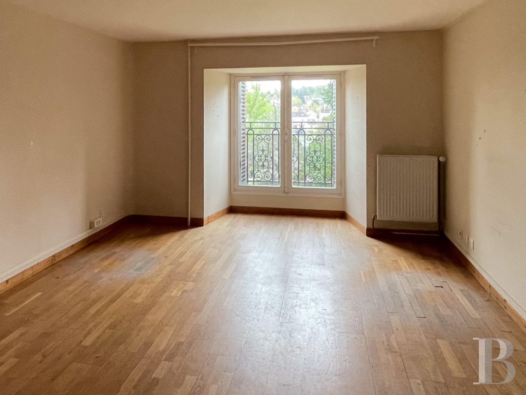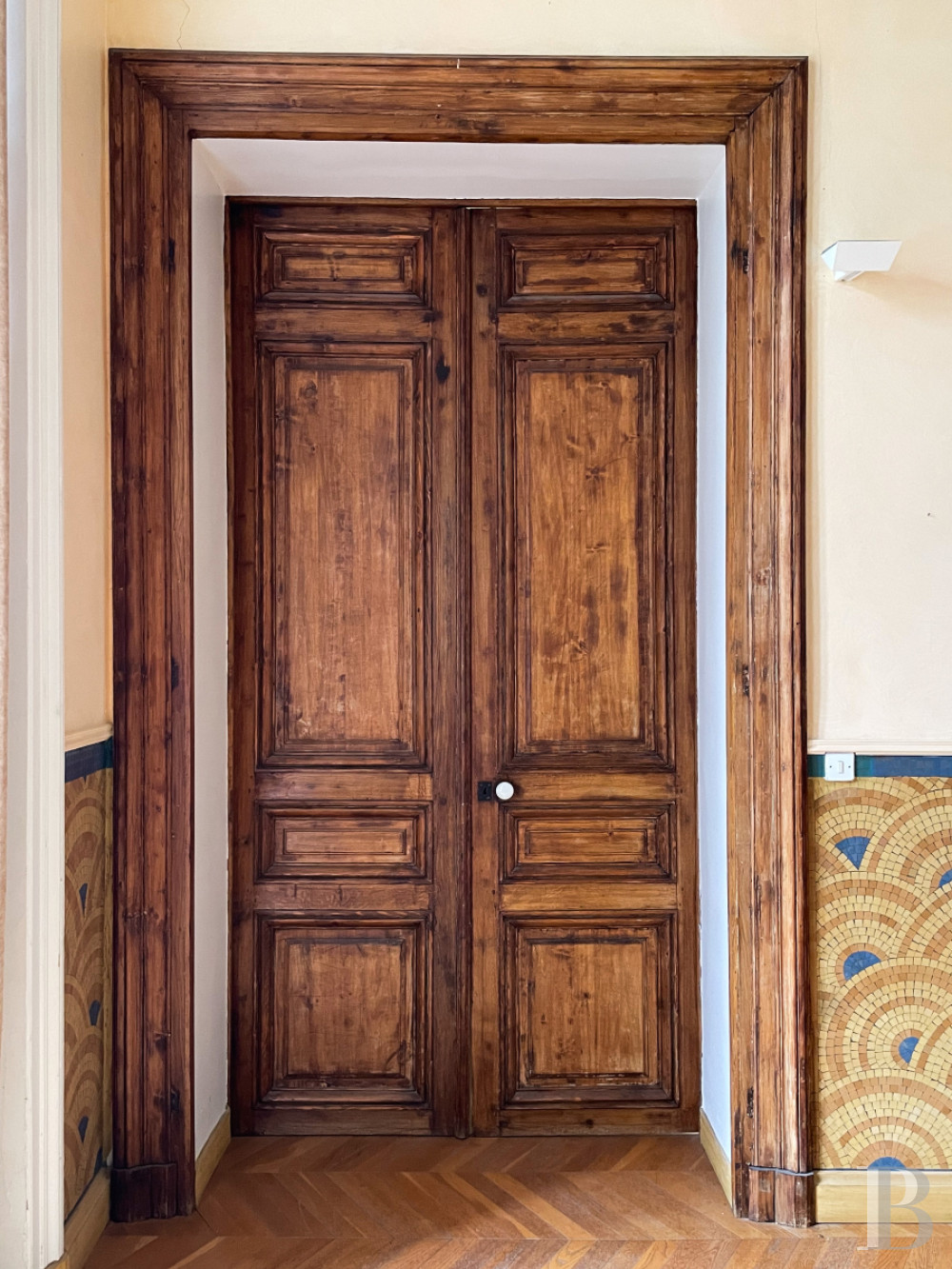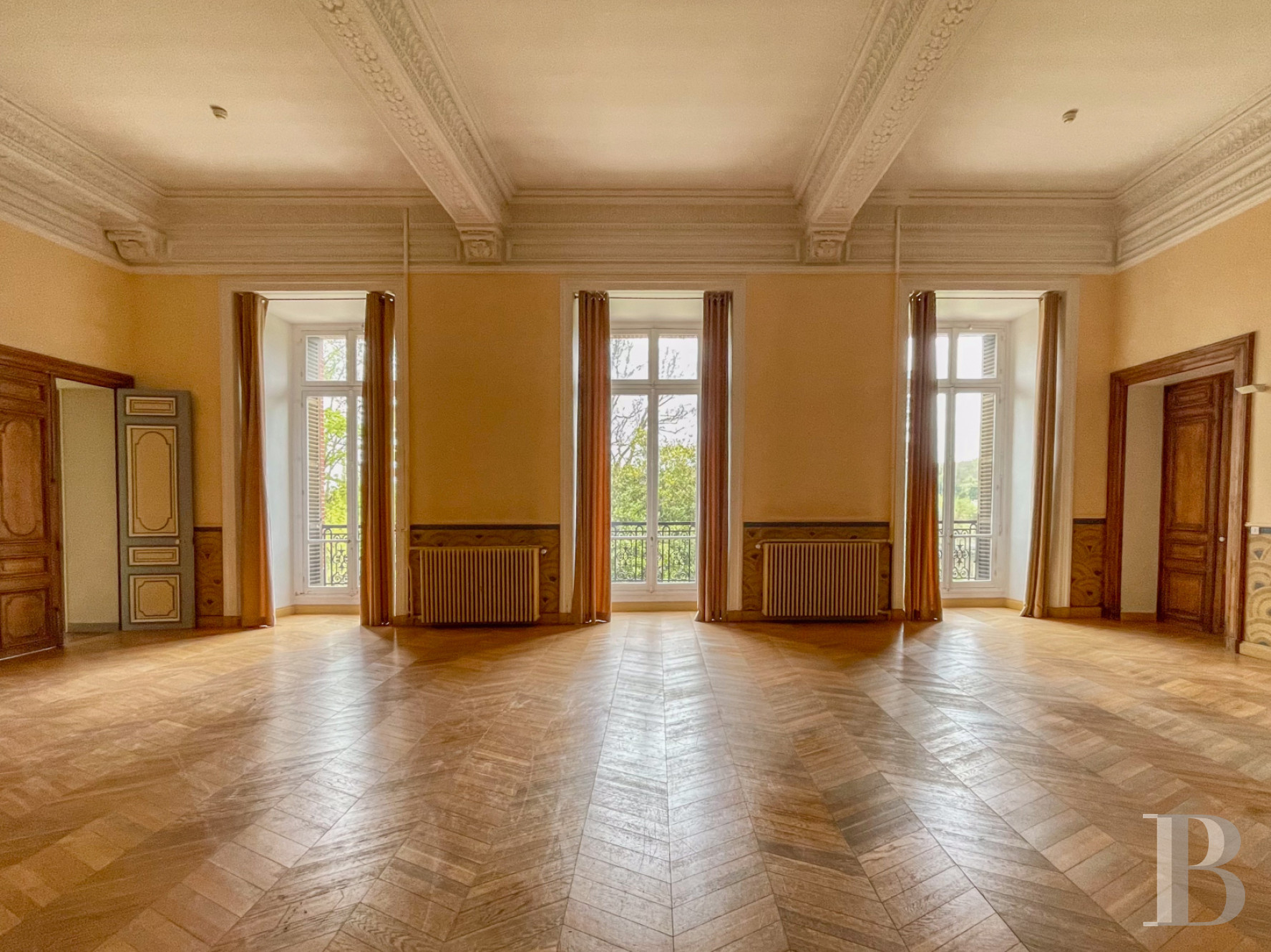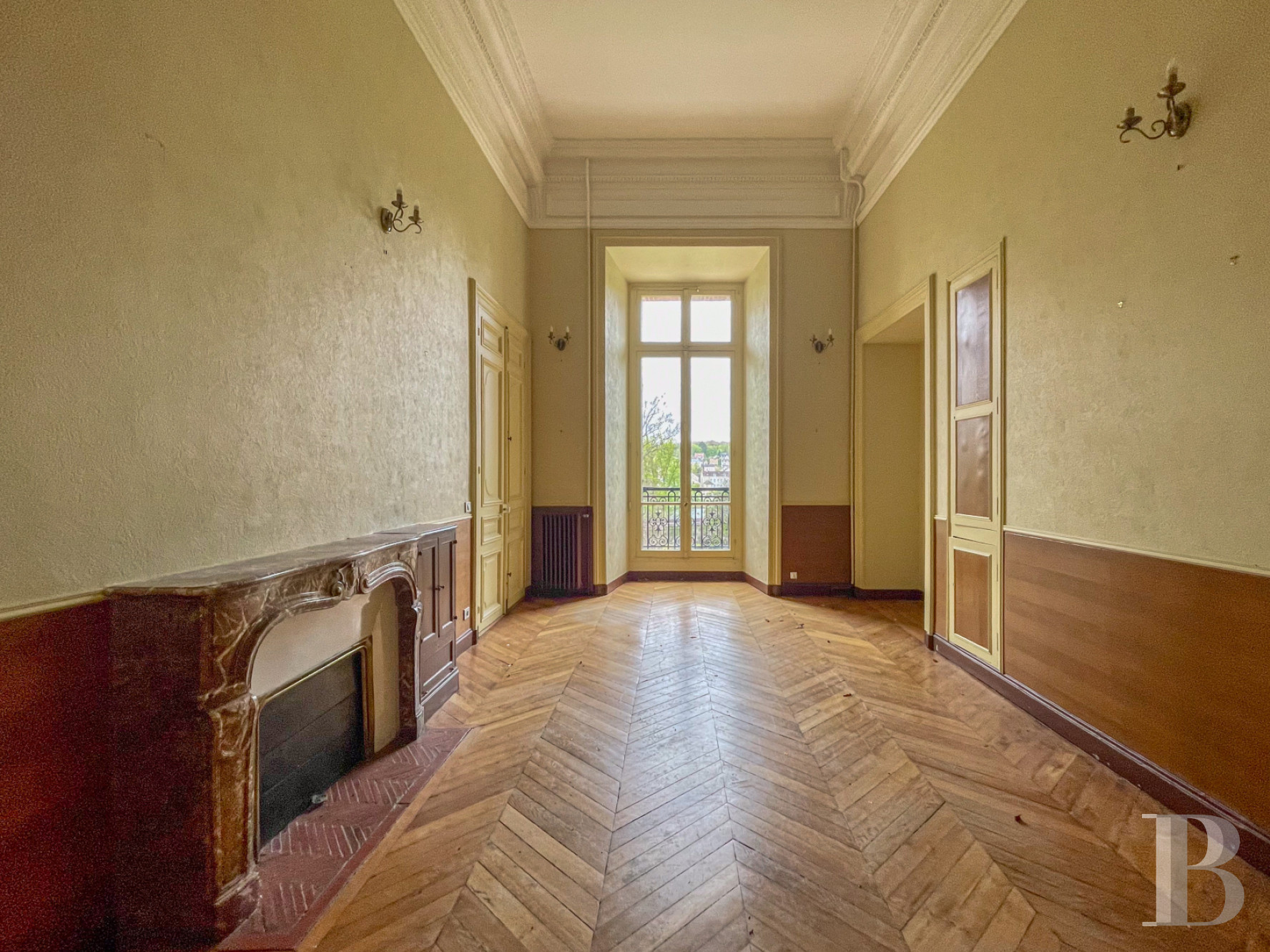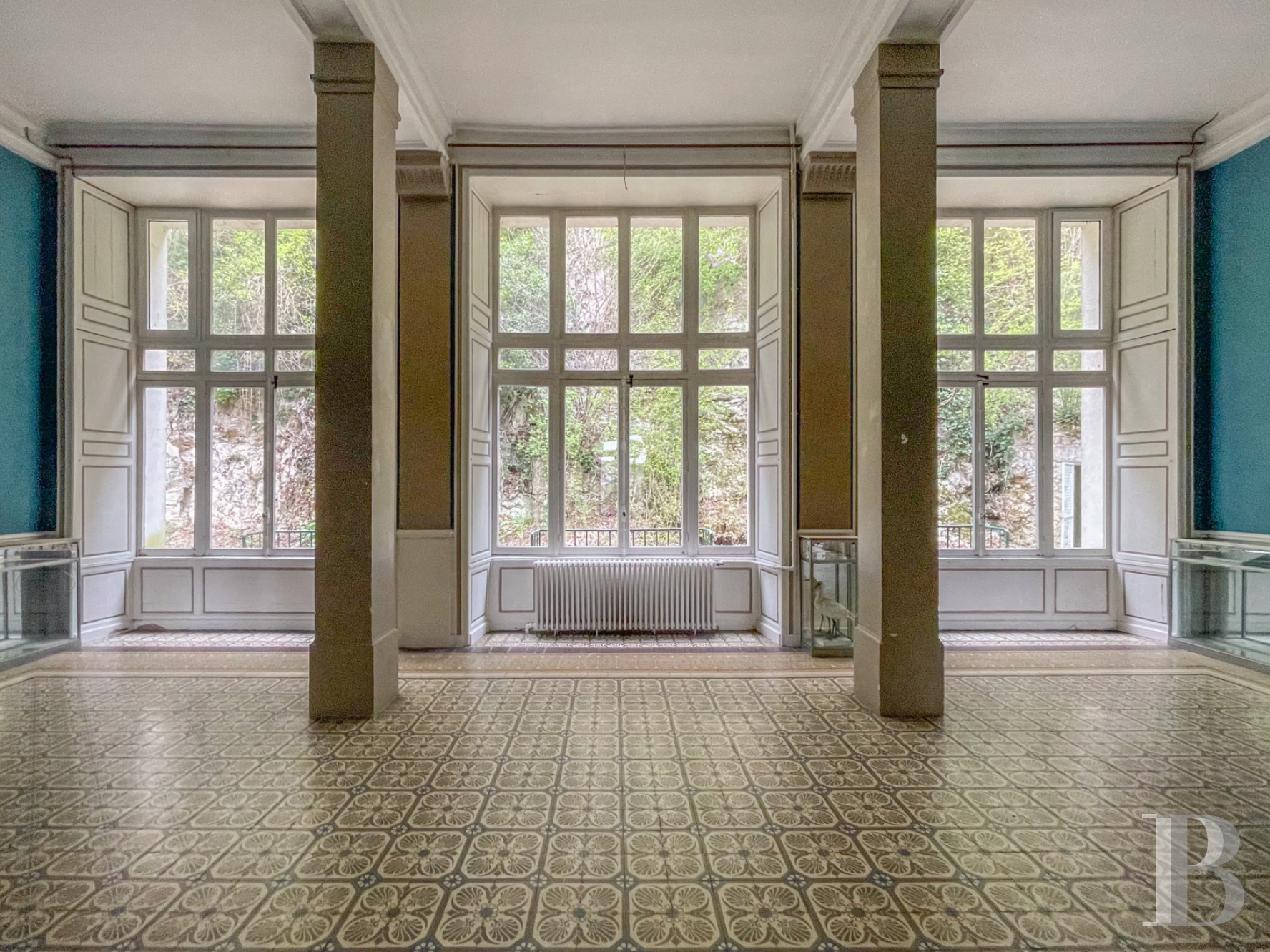 À l’est de l’escalier monumental, plusieurs pièces de réception affichent une composition régulière et lumineuse. L’espace s’organise en trois travées qui structurent les perspectives. De grandes baies à petits carreaux, largement ouvertes sur l’extérieur, laissent entrer une abondante lumière. Les murs sont ornés de lambris d’appui. Les sols alternent carreaux de ciment anciens à motifs répétitifs et parquets massifs en chêne, sous une hauteur de plafond d’environ 5 m.
