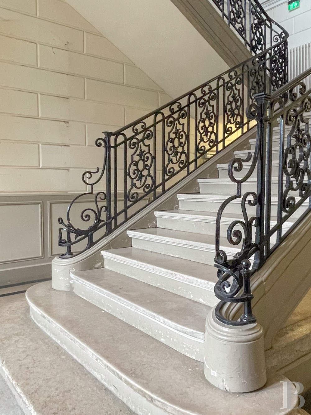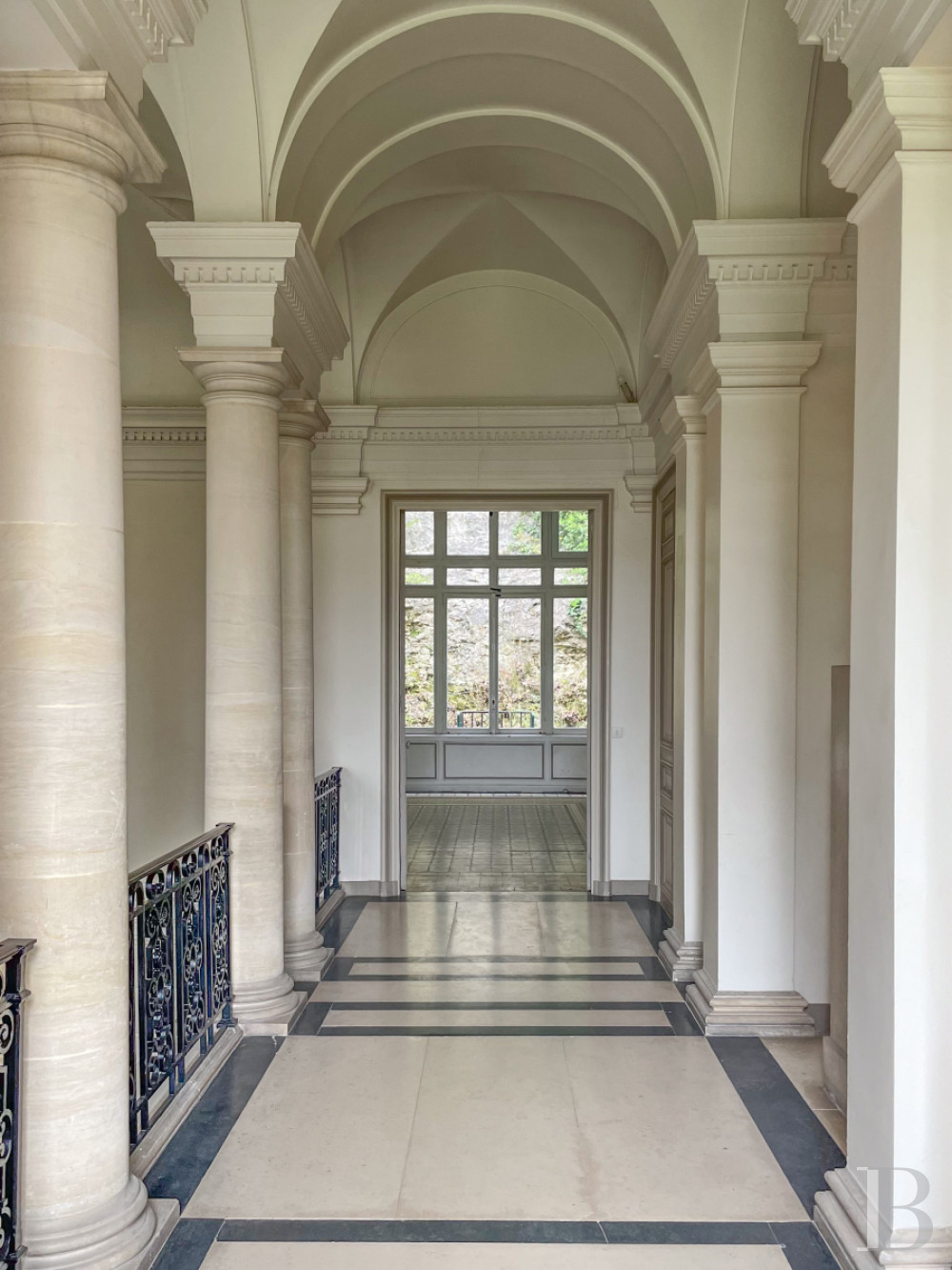 Le vestibule se distingue par une composition monumentale, organisée autour d’un escalier en pierre à double volée, disposé en miroir et souligné de rampes en ferronnerie finement ouvragées. L’espace, largement ouvert, est rythmé par des colonnes qui soutiennent arcs en plein cintre et voûtes. Les murs, traités en faux appareil, renforcent l’ordonnancement architectural, tandis que la lumière naturelle, diffusée par de hautes baies, souligne les volumes et les perspectives. Le tout conduit à une galerie périphérique puis à plusieurs espaces techniques : lingerie, caves, zones de stockage et chaufferie, également accessibles en rez-de-jardin.