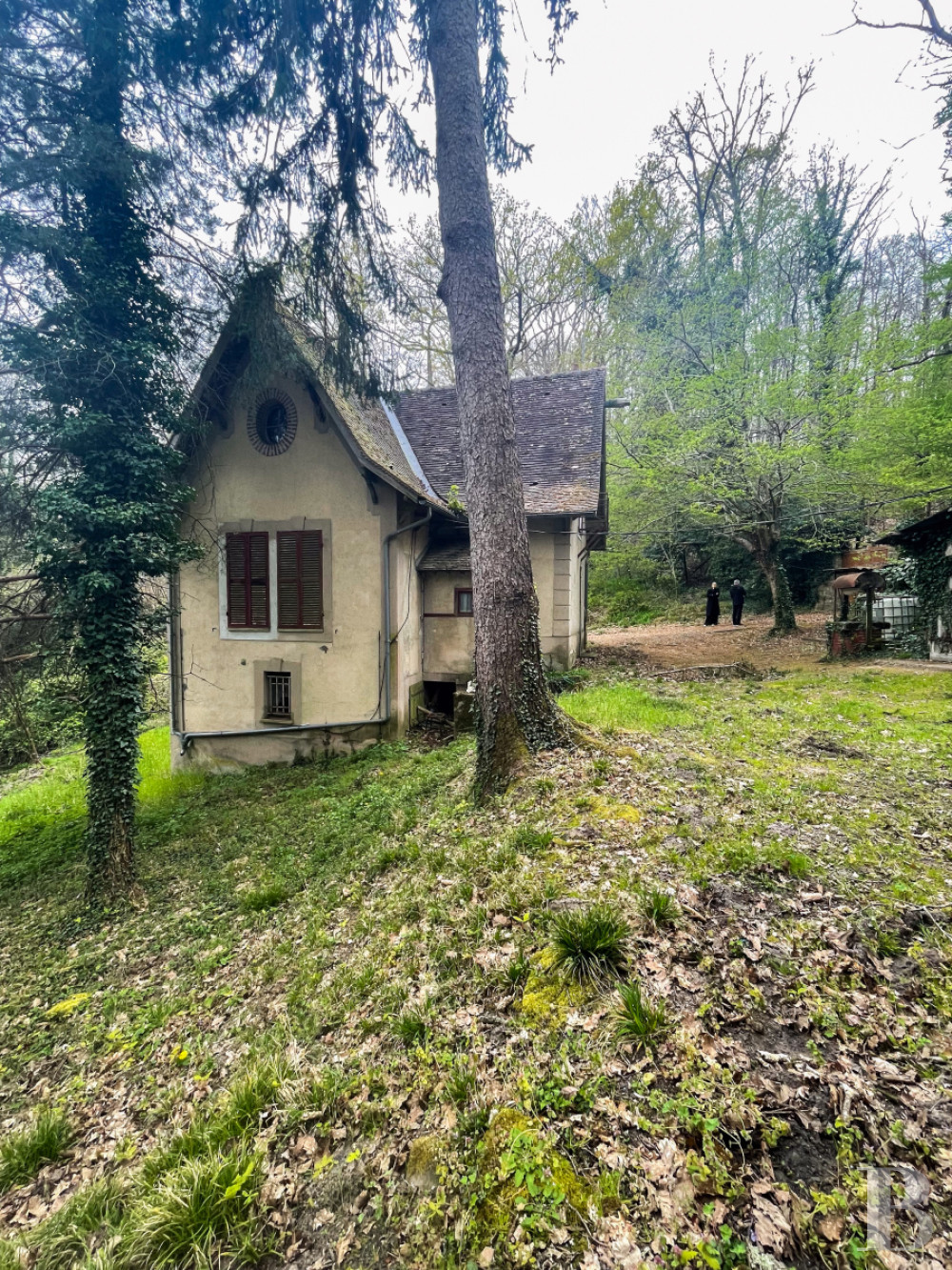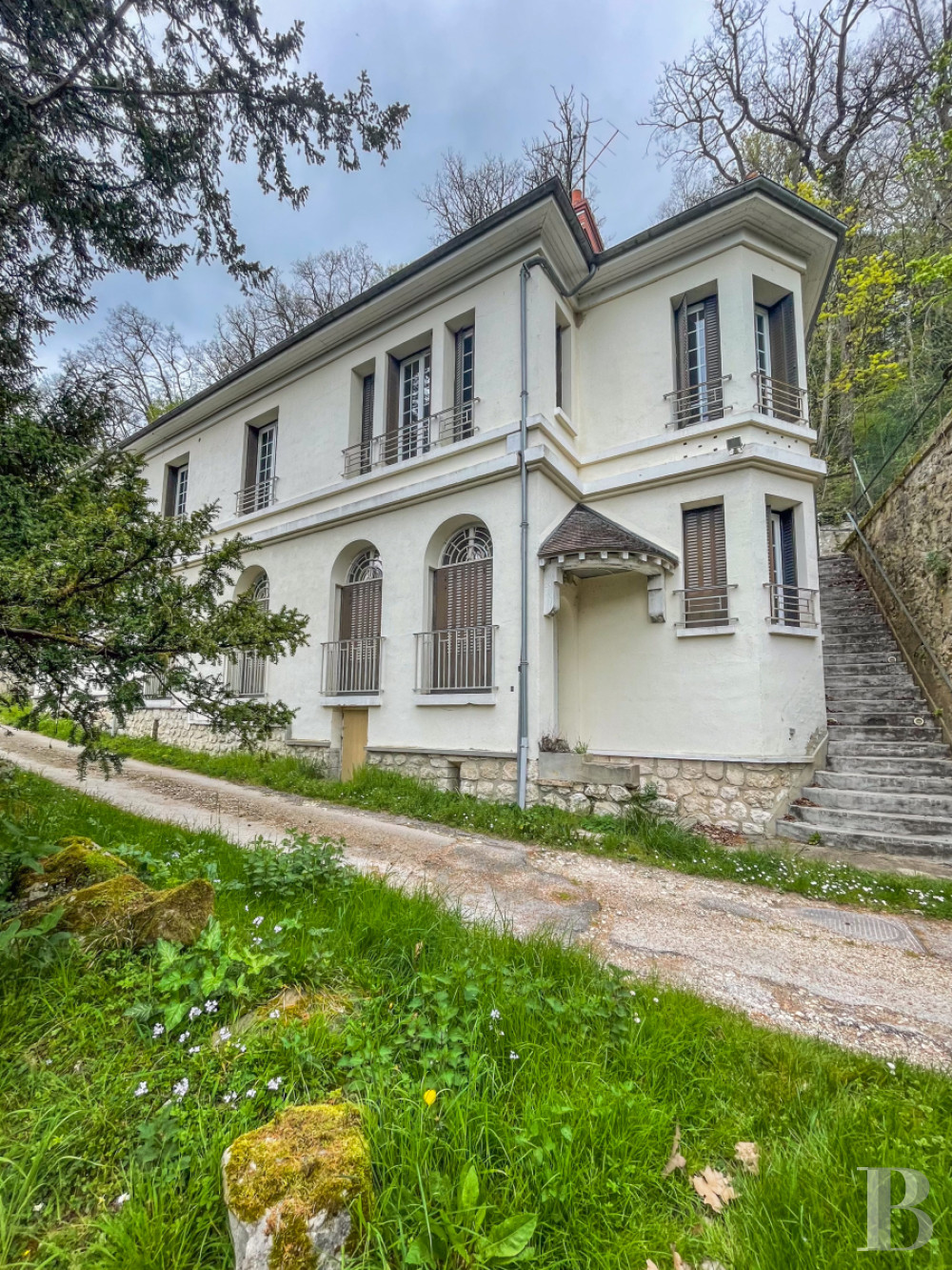 Implantée en léger surplomb et desservie par un escalier latéral, elle est adossée à la structure rocheuse du terrain, dans un environnement boisé. Son architecture sobre et ordonnancée est caractéristique du début du 20e s. Élevée de deux niveaux sur un soubassement en pierre, sa façade est enduite. Les baies du rez-de-chaussée, traitées en arc cintré et protégées par des garde-corps métalliques, répondent aux baies rectangulaires de l’étage, soulignées de ferronneries simples. Une corniche discrète marque la séparation des niveaux et court sous la toiture à faibles débords. L’entrée est localisée sous un petit auvent.La maison forestière