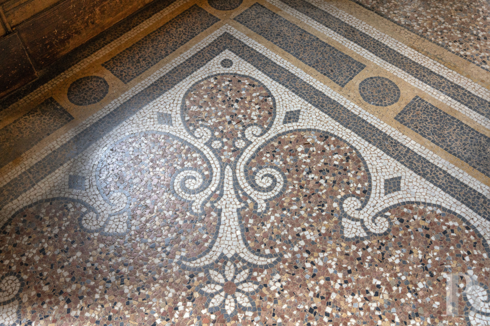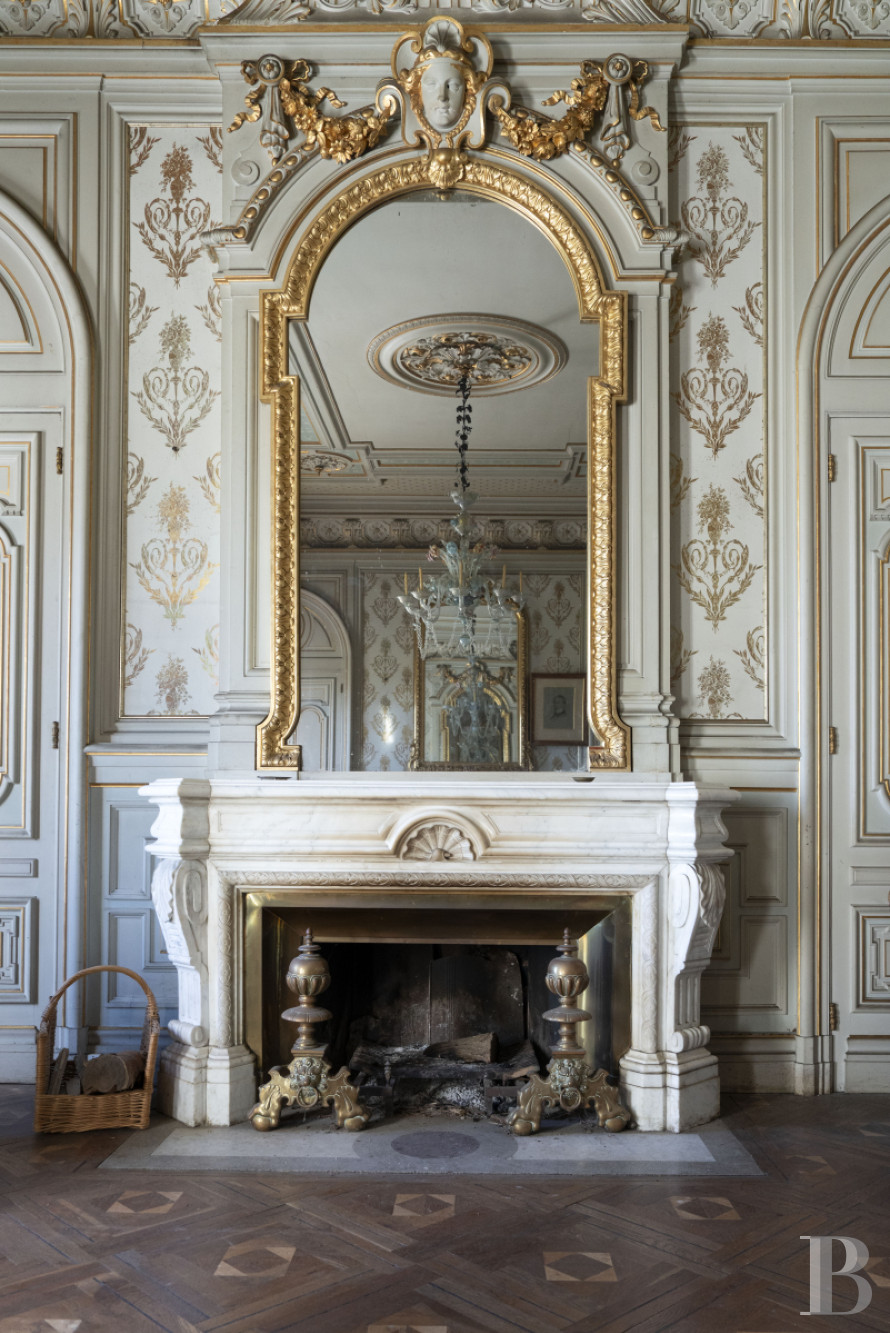Niveau de réception et de représentation, il comprend un vaste vestibule central qui distribue les espaces. Le sol est décoré de mosaïques qui font échos aux murs couverts de panneaux de marbre peints en trompe l'œil. Les plafonds sont également peints à la main, de même que les boiseries murales claires. En face, au débouché de portes doubles, se dévoilent le grand salon et la salle à manger, orientés vers la terrasse et le parc. Le grand salon, au sol parqueté selon un dessin spécifique comme c'est le cas pour chaque pièce, est décoré de boiseries peintes et dorées qui s'articulent autour des cheminées et de leurs trumeaux. La salle à manger, égayée de tentures peintes reprenant les décors et les vues depuis une ancienne propriété de la Côte d'azur, au sol revêtu d'un parquet singulier, est gratifiée de plafonds peints à la main. Un salon de lecture et une chambre à coucher, positionnés dans les deux tours d'angle à l'est, la cuisine et un bureau, aménagés dans deux autres tours, à l'ouest, complètent le niveau.Un escalier en pierre conduit aux étages.