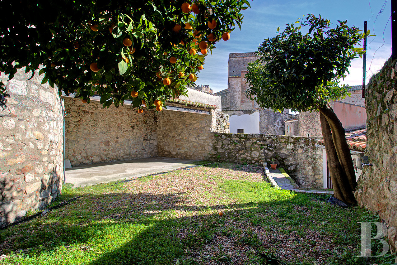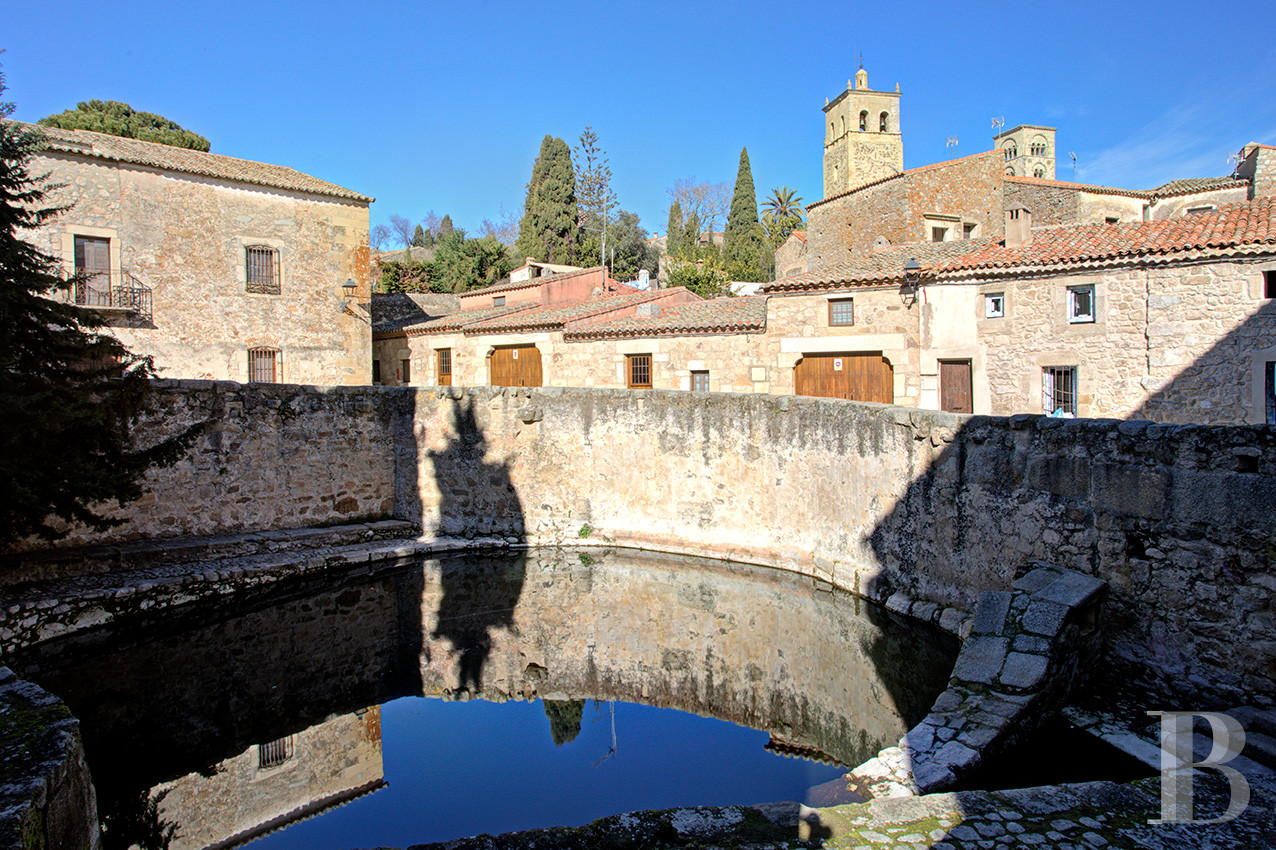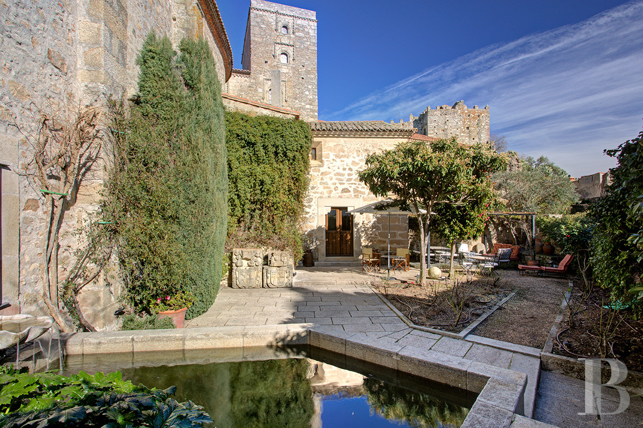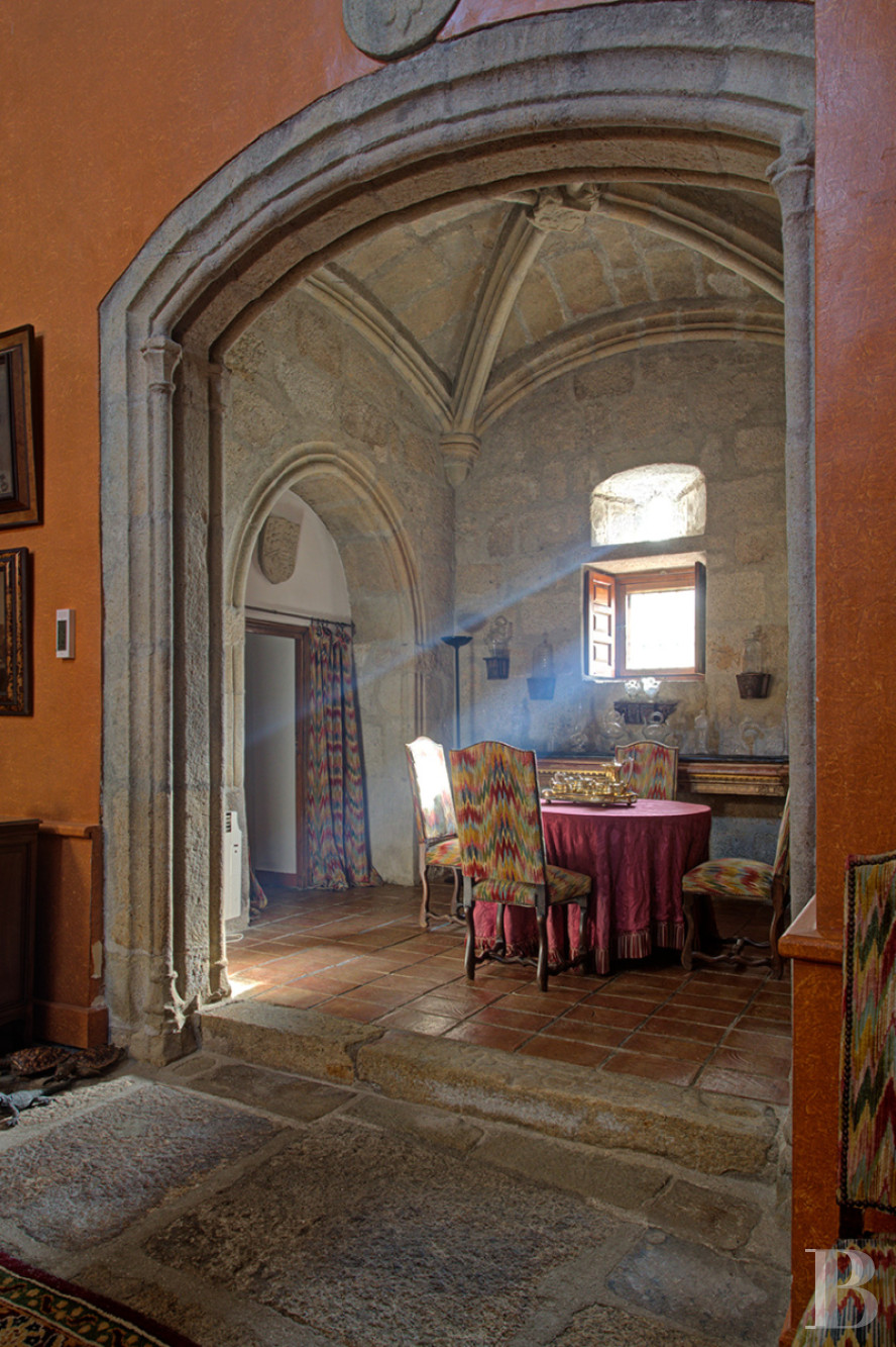 Franchir l'Arc de San Andrés, c'est pénétrer dans un sanctuaire de pierre et d'histoire, où le temps semble suspendu aux confins du 16e s. Une ancienne église de 1518, aujourd'hui désacralisée, offre à ses habitants un refuge monumental face à l'Alberca historique, citerne séculaire taillée dans la roche vive. Les volumes religieux d'origine, préservés avec dévotion, dialoguent avec la lumière qui inonde le vaste salon aux deux cheminées, créant une atmosphère empreinte de sérénité. L'ensemble s'étend sur 825 m² bâtis et 788 m² de terrain, incluant la demeure principale avec ses trois chambres en suite, sa cuisine cheminée, son jardin et son belvédère, ainsi que deux maisons d'invités entièrement autonomes. La pierre blonde, le bois patiné et la terre cuite composent un cadre authentique où rien n'a été dénaturé. Vendue meublée, la propriété au cœur de Trujillo convient aussi bien comme résidence principale que comme havre patrimonial où se ressourcer au rythme des saisons.