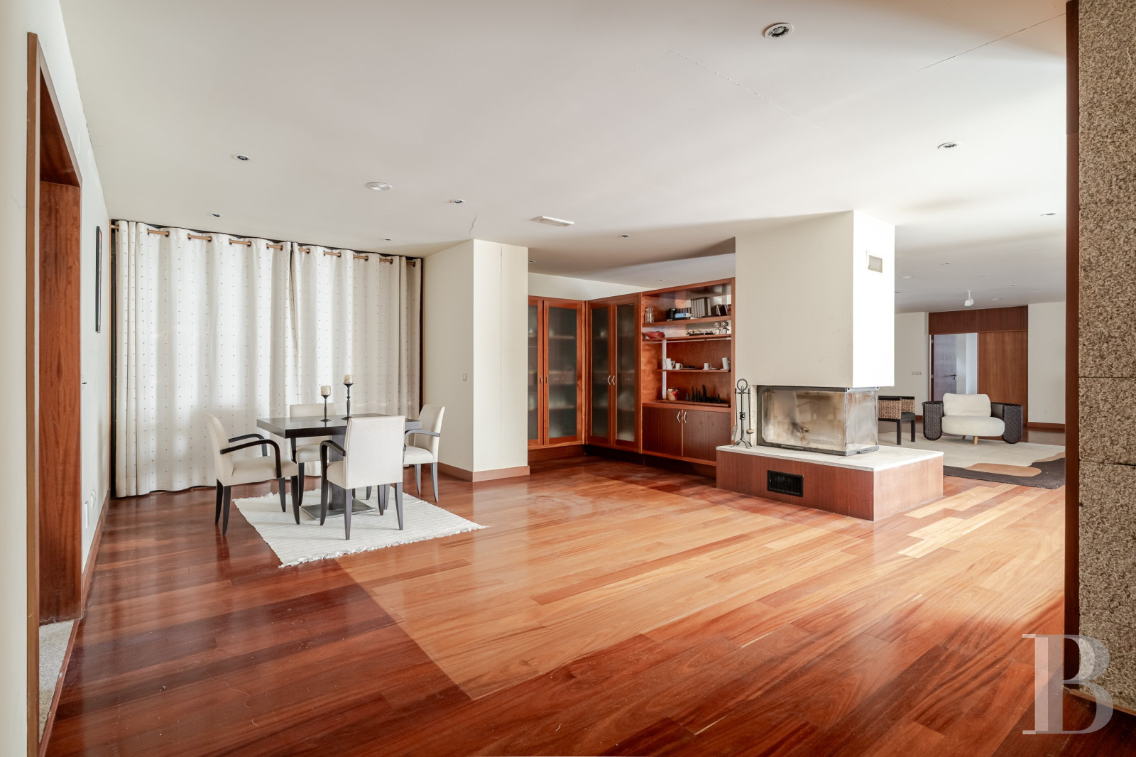 La campagne du Minho s'étend sans bruit, ponctuée d'arbres fruitiers et de végétation ancienne. Une villa contemporaine occupe 10 000 m² de terrain, loin des routes passantes. Les journées s'y organisent entre piscine et jardins, cuisine d'été sous les arbres, repas dans l'un des deux salons reliés par une cheminée double face. Cinq suites se répartissent dans la partie intime, séparée des espaces communs par un léger décalage de niveau. Le bureau permet le travail à distance, la buanderie absorbe le quotidien. L'annexe peut devenir salle de sport, cinéma ou terrain de squash selon les besoins. Un jardin intérieur fait entrer la lumière au centre de la maison. Vivre ici suppose d'aimer le silence, l'espace et la possibilité de recevoir largement sans jamais se sentir à l'étroit.