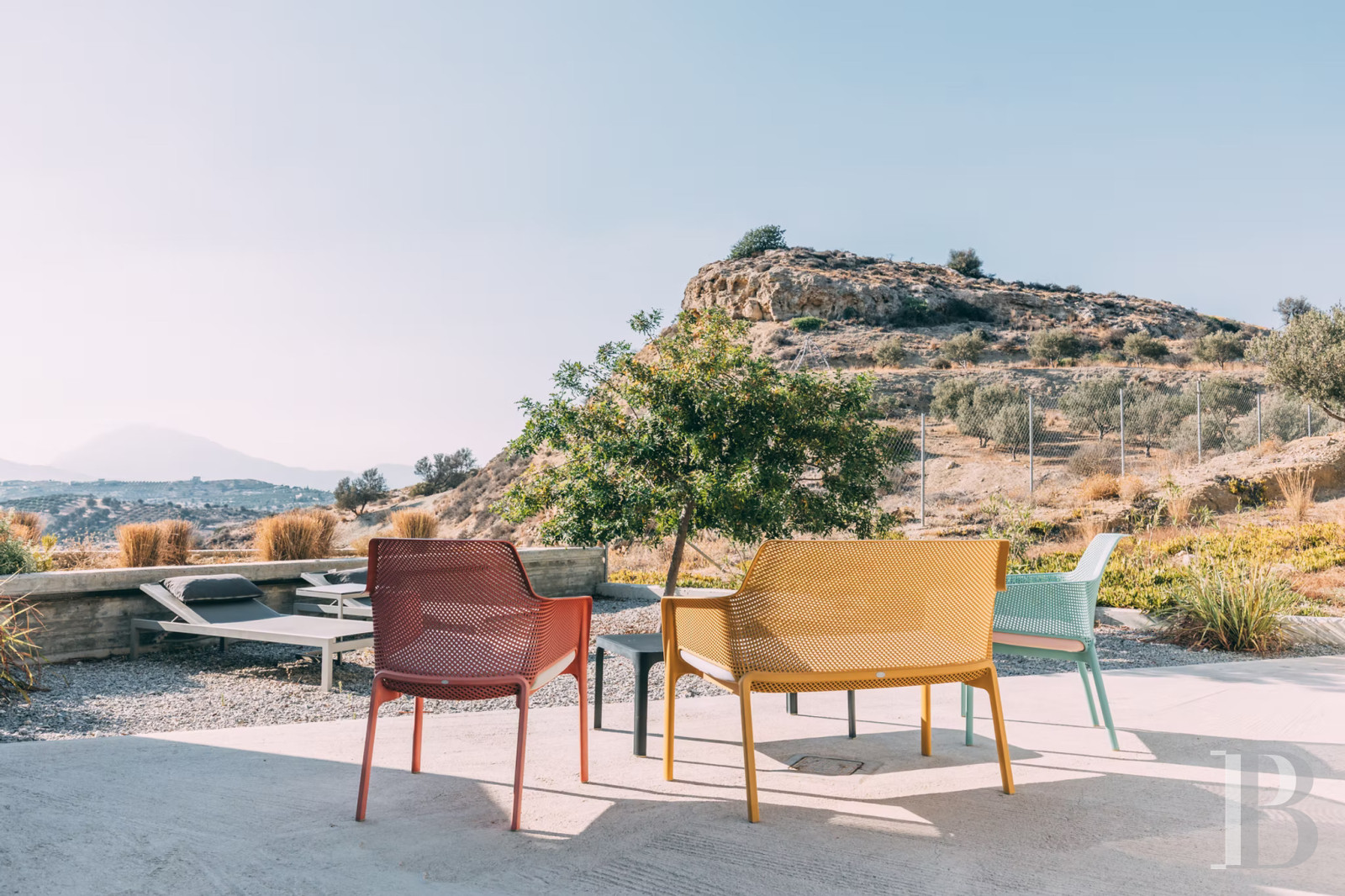 Une villa où la vie s'organise entre oliveraie centenaire et mer de Libye aperçue depuis les terrasses. Les matins débutent par une promenade dans le domaine et les après-midi se prolongent autour de la piscine où l'eau capte les reflets des montagnes environnantes. Le soir venu, le silence crétois n'est troublé que par le vent dans les oliviers et les conversations qui s'étirent. Sivas, village traditionnel du sud crétois accessible à 500 mètres seulement, maintient commerces, tavernes et vie communautaire préservée. La distribution architecturale en deux ailes distinctes permet d'accueillir famille étendue ou de générer revenus locatifs tout en préservant intimité. Le terrain généreux de 6 162 m² planté de vignes et d'essences méditerranéennes offrent une flexibilité unique dans un territoire crétois qui a su maintenir authenticité agricole et traditions insulaires, loin des développements touristiques qui ont transformé les côtes nord de l'île.