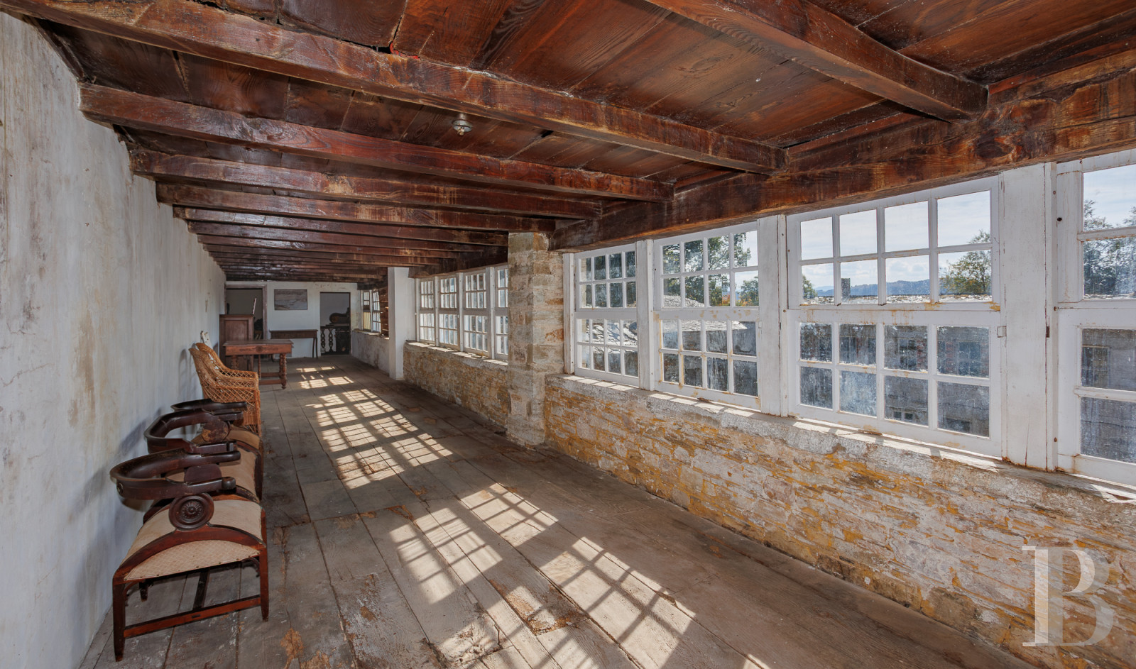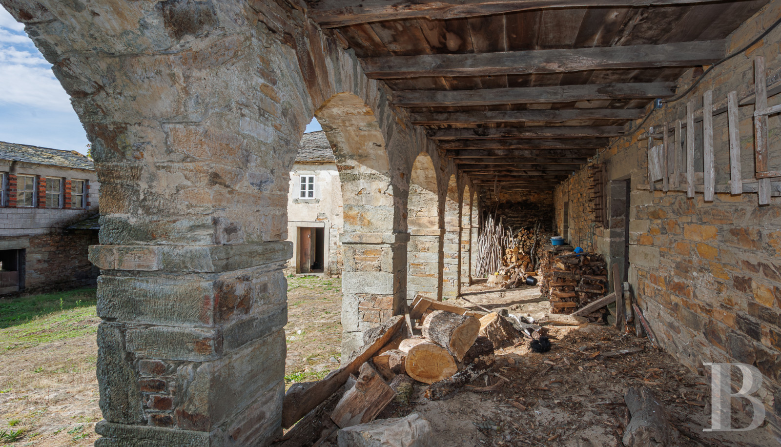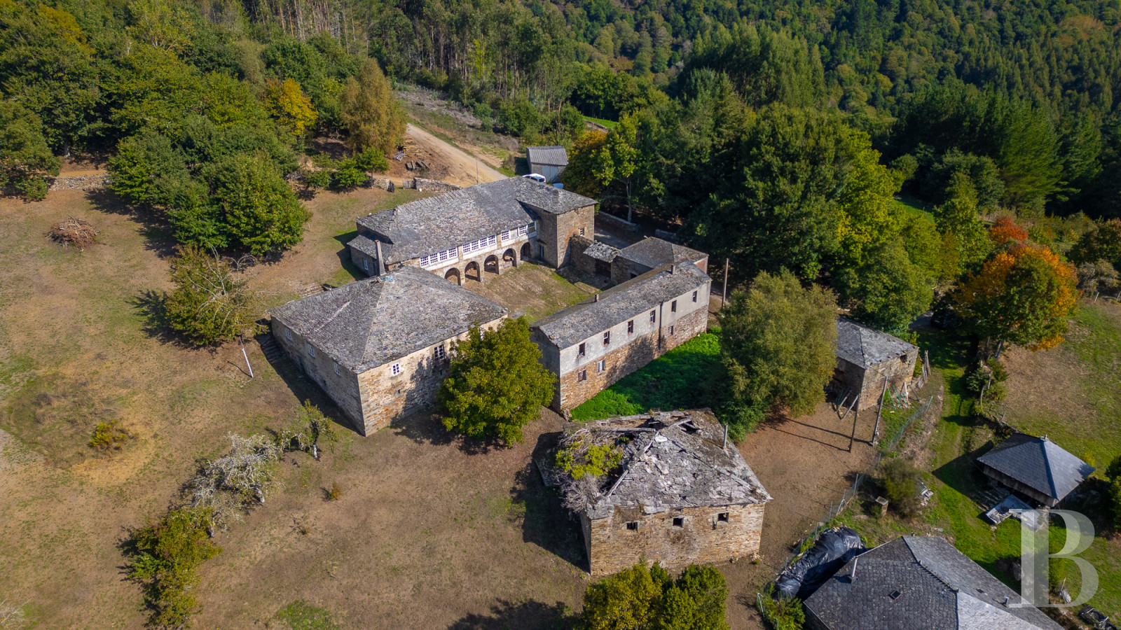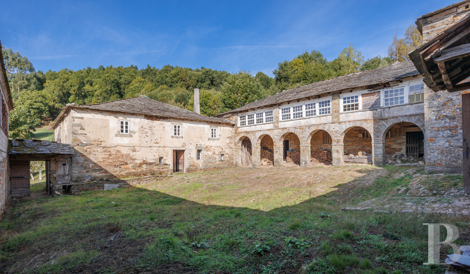 Au sein des montagnes de Lugo, une vaste demeure compose un ensemble d'architecture rurale où plusieurs structures s'organisent autour d'une grande cour intérieure. Habitations, écuries et chapelle forment un complexe que le temps a préservé dans l'attente d'une restauration. Les arcades de pierre dessinent une galerie qui entoure la cour. La partie résidentielle compte deux salles de séjour, cinq chambres et une cuisine où le poêle à bois traditionnel voisine avec un évier de pierre. Une maison de gardien et un domaine de plus de 17 500 m² en pente douce, planté d'arbres fruitiers, complètent la propriété. Une source d'eau traverse le terrain. Un patrimoine traversé par le Chemin primitif de Saint-Jacques, à 60 km de Lugo et ses remparts romains classés au patrimoine mondial.