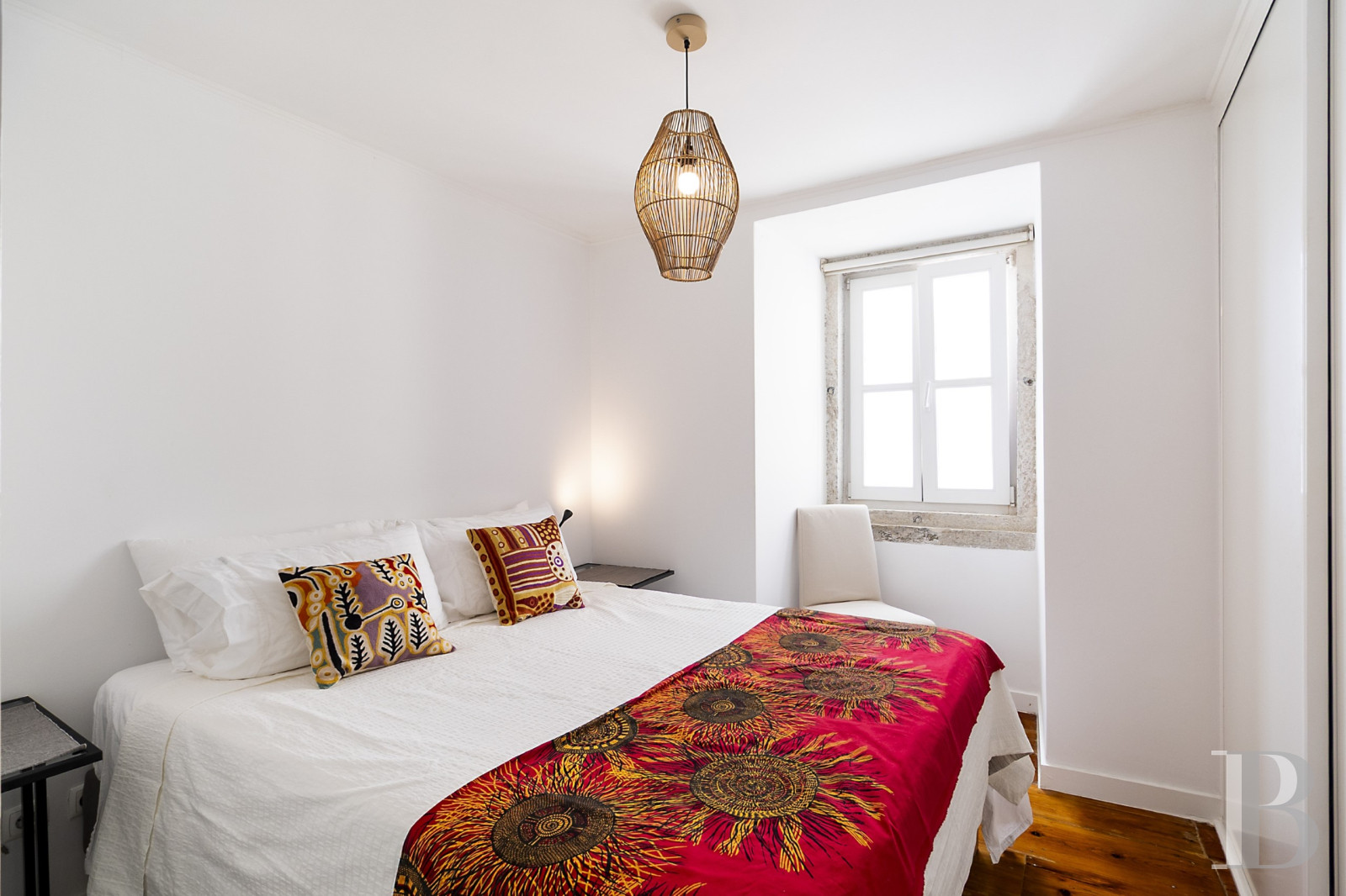 Dans le plus ancien quartier de Lisbonne, où se mêlent vestiges romains et ordonnancement pombalin, cet appartement de cent mètres carrés occupe le quatrième étage d'un immeuble du 18e siècle restauré avec respect. La structure en cage pombaline, les plafonds et planchers de bois, la cheminée de pierre témoignent d'un patrimoine préservé. Rénové il y a cinq ans, le logement conjugue authenticité et confort contemporain. Le séjour plein sud s'ouvre sur un balcon dominant le Tage, tandis que la cuisine déploie ses azulejos clairs et carreaux hydrauliques dans la pure tradition lisboète.