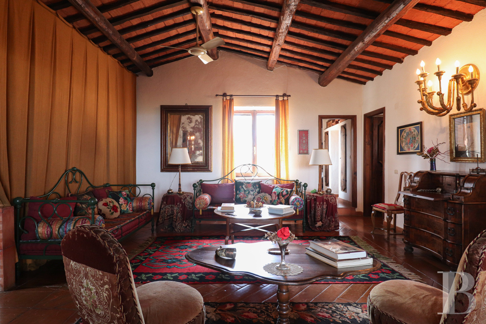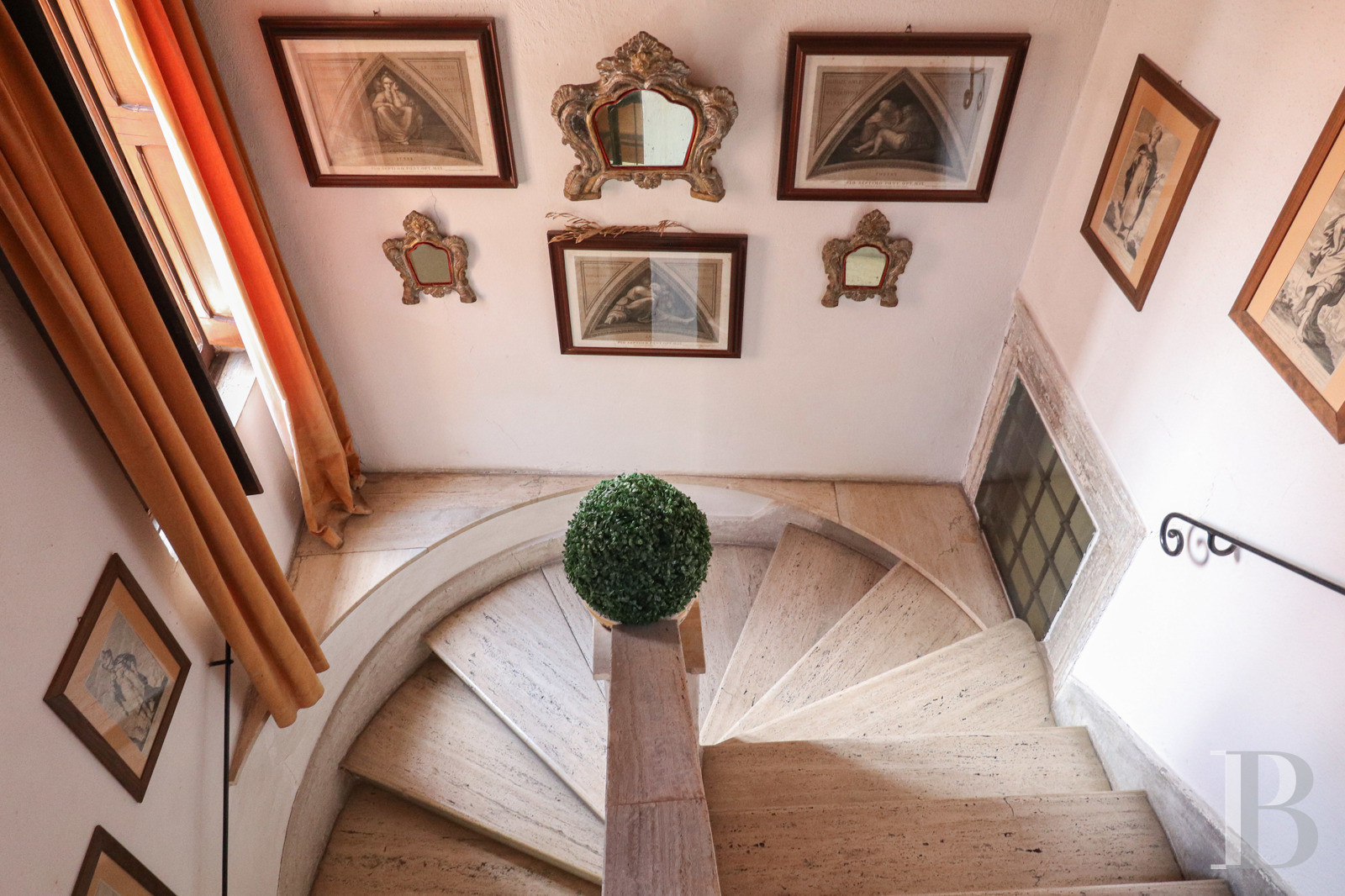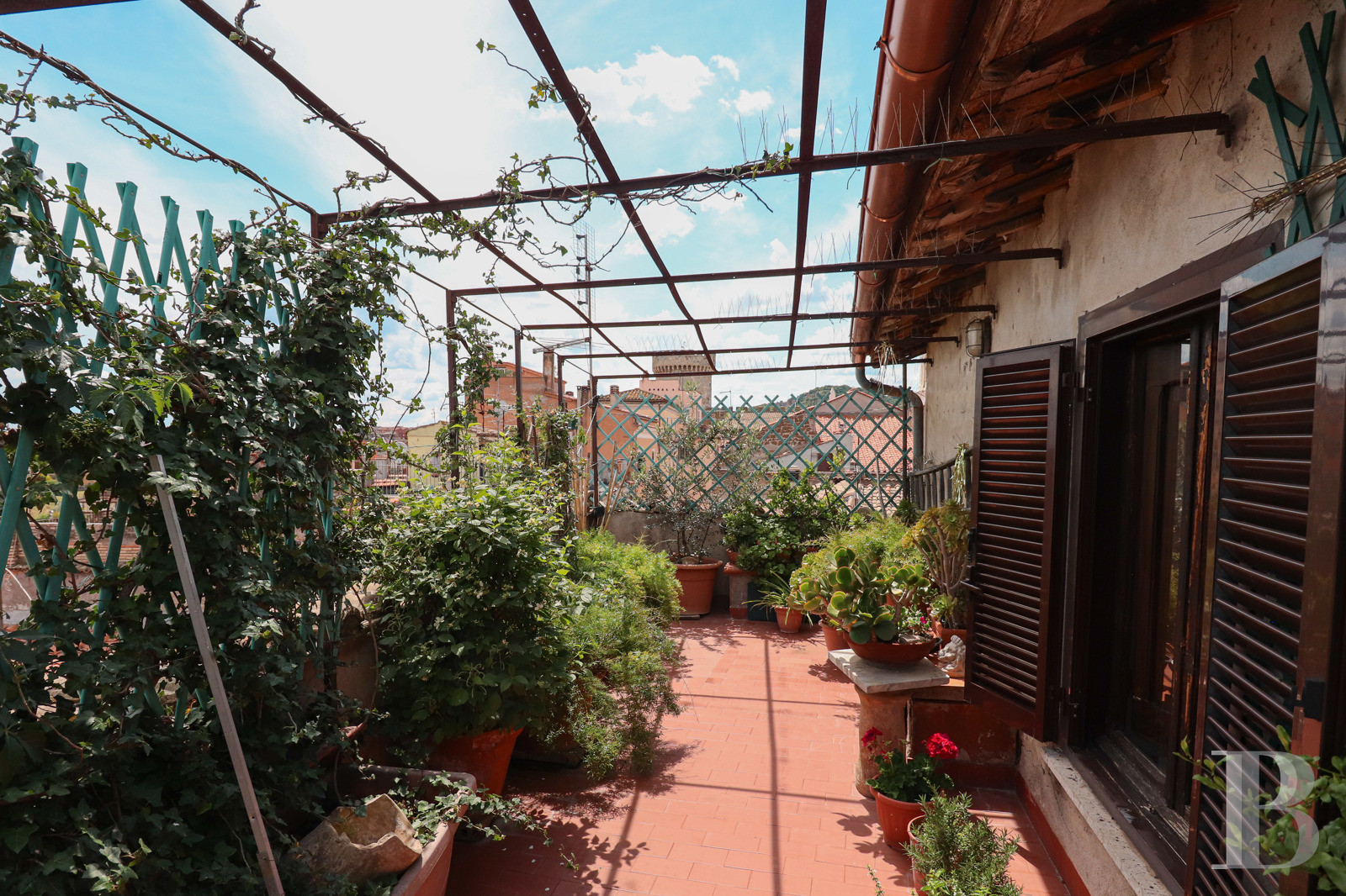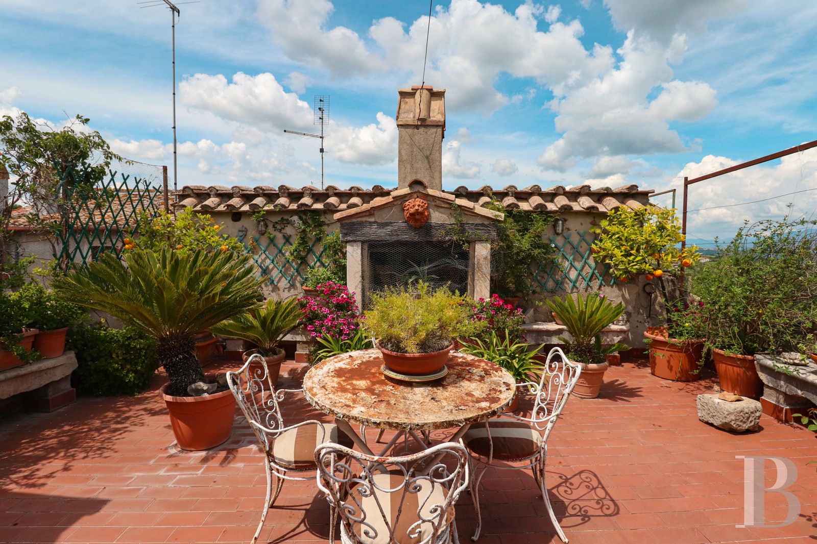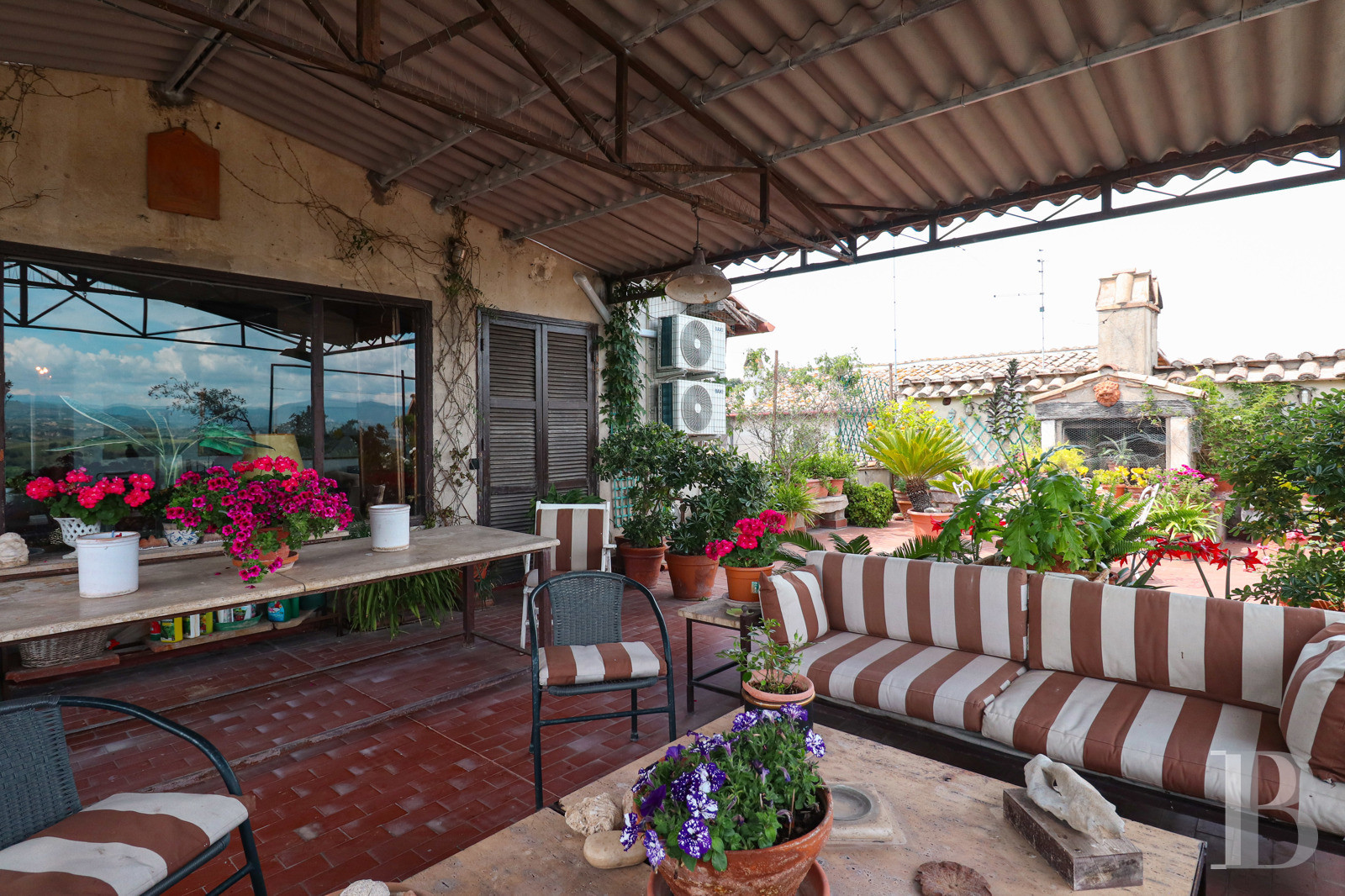 Inscrit dans le Palazzo Orsini et tourné vers les monts Sabins, un appartement en attique qui a su garder la noblesse des demeures patriciennes du 17e s. Ses plafonds à caissons, ses sols de terre cuite, ses poutres apparentes rappellent l'atmosphère particulière d'une résidence historique urbaine, à la fois imposante et habitée. Distribué sur trois niveaux et couronné d'une terrasse panoramique de 90 m², l'ensemble s'adresse autant à ceux qui souhaitent trouver l'authenticité d'un logis d'époque qu'à ceux qui désirent en faire une résidence singulière au cœur de Fiano Romano. À moins d'une demi-heure de Rome et de ses musées, il pourra aussi bien devenir une habitation principale que secondaire, à la fois ancré dans la vie de bourg et proche des attraits de la capitale italienne.