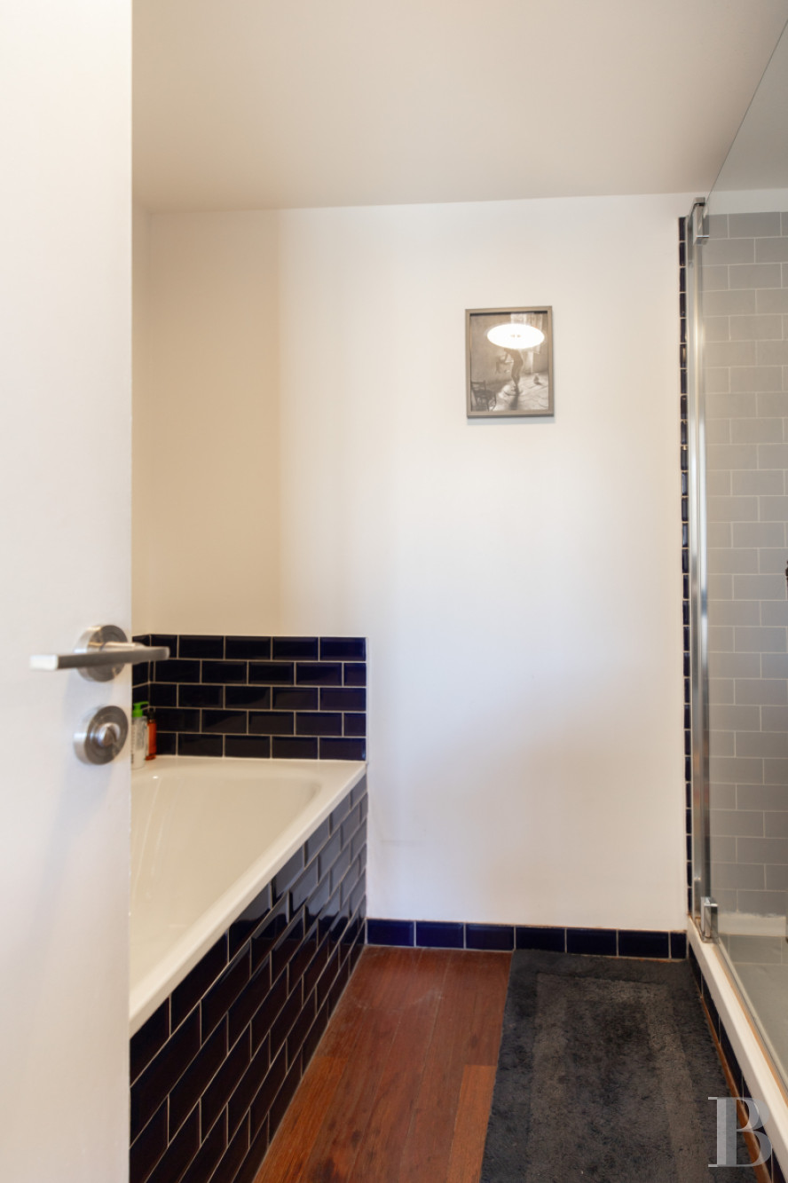 Un plateau situé en deçà du premier niveau, d’environ 47 m², est accessible par quelques marches le long desquelles des étagères murales ont été réalisées sur mesure. Elles se prolongent jusqu’à un plateau composé de deux grandes chambres de près de 16 m² chacune, desservies par un couloir. Une vaste salle de bains, de près de 7 m², équipée d’une baignoire et d’une douche ainsi que de toilettes confirme l’indépendance des lieux. Le niveau compte en outre une garde-robe séparée et un espace buanderie.