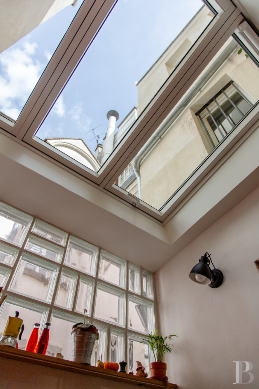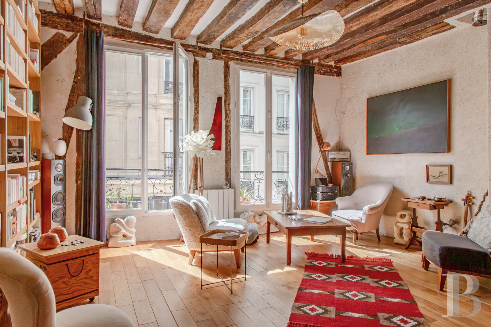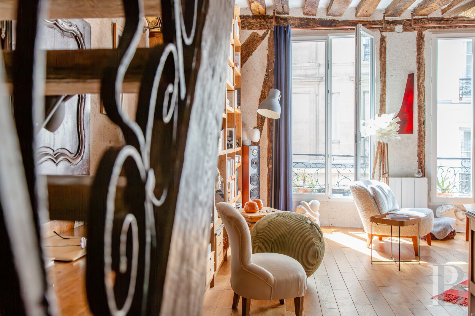 Avec ses angles de vues saisissants et la lumière naturelle omniprésente, un élégant appartement à la manière d’un belvédère. Les quatre baies exposées au sud sur la rue et la verrière côté cour ménagent deux perspectives : une rue piétonne arborée et, à l’opposé, les toits de zinc et le ciel de Paris. L’appartement a fait l’objet d’une rénovation soignée en 2018. Les murs à colombages, les poutres apparentes et les enduits à la chaux accompagnent des volumes dont les hauteurs sont marquées. L’organisation actuelle comprend trois chambres. Une famille d’artistes y réside aujourd’hui et envisage la transmission du lieu à des amateurs sensibles à la lumière et aux éléments anciens. À proximité des quais de Seine et du quartier de Châtelet, les parcours à pied mènent naturellement aux théâtres, aux musées et aux cinémas.