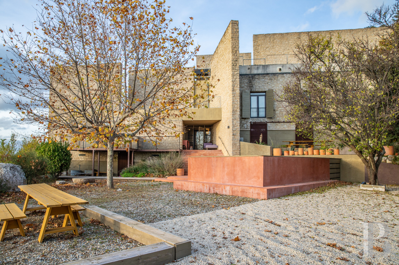 Il s'étend sur 2 ha clos, autour et en contrebas de la crête contre laquelle la construction est érigée. Il est constitué d'épineux et, sur une restanque, d'une micro-culture de fourrage. Sa superficie peut presque paraître modeste au regard des paysages et du domaine forestier à perte de vue qui environnent la propriété. Ici, le mot "vis-à-vis" est inconnu et le terme "voisin" ne se décline pas à moins de 10 min en voiture. L'omniprésence de la nature triomphe sur les hauteurs provençales qui cernent les lieux.Ce que nous en pensons