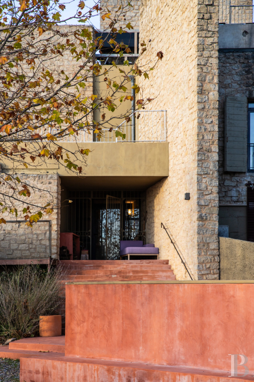 Le grand escalier extérieur en béton peint, qui rattrape la déclivité de la pente, aboutit à un double vestibule, le premier, extérieur, en forme de terrasse semi-couverte, étant séparé du second, intérieur, par une solide grille. Dès l'entrée, le parti pris ultra-contemporain des aménagements apparaît comme une réponse à la vastitude des volumes. L'âpreté du béton brut, omniprésent, est réchauffée par des murs teintés d'ocres sourds. Le bois brut, non poli, utilisé pour les portes, l'acier trempé noir des fenêtres, d'une rigueur minimaliste, et les lauzes des sols parachèvent l'impression d'un confort naturel très poussé. Le quinconce nord de ce niveau est dévolu aux locaux techniques, la récupération des eaux de pluie alimentant l'ensemble de l'habitation tandis que la gestion des panneaux solaires de la terrasse et d'autres équipements permettent une grande indépendance énergétique. La maison assure ainsi une vie en quasi-autarcie. Le quinconce sud est entièrement occupé par deux pièces seulement : une grande salle de séjour avec bibliothèque et une lumineuse cuisine prolongée par une immense terrasse extérieure, qui offre le sous-massif des Dentelles sarrasines comme point de mire particulièrement spectaculaire.