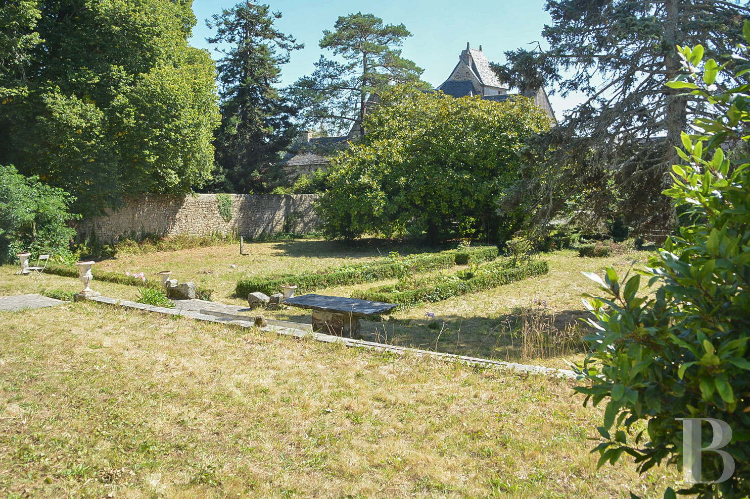 La cour au nord est suffisamment vaste pour permettre le stationnement de véhicules. Le portail d'entrée y accède directement. Le jardin clos se situe au sud. La partie haute a été dessinée dans un style à la française, avec des buis taillés en carré de façon régulière. La partie basse est arborée et fleurie.