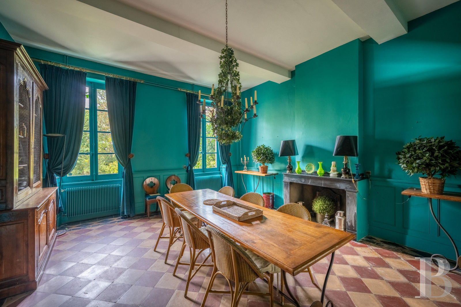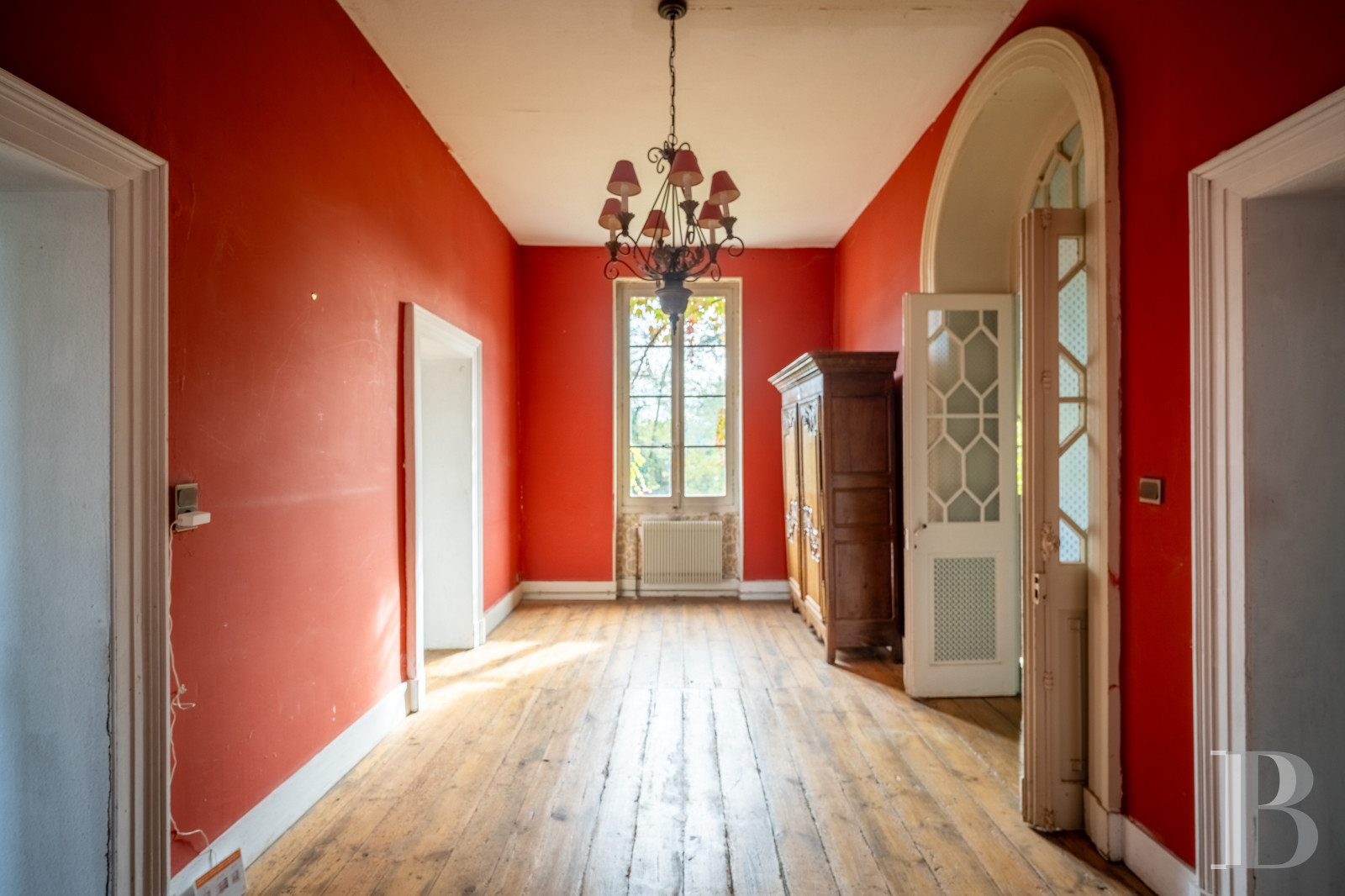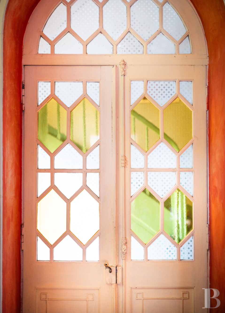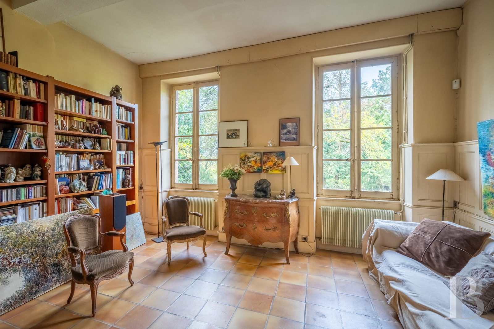 De l’autre côté du vestibule, un salon a conservé une partie de ses lambris du 19e s. Il donne lui aussi sur le jardin arrière. La cage d’escalier attenante constitue l’un des points remarquables de la maison avec sa disposition du 19e s. : porte vitrée à panneaux hexagonaux qui alternent verres translucides et colorés, structure en bois et barreaudage d’origine, potelet de départ du limon finement ornementé.