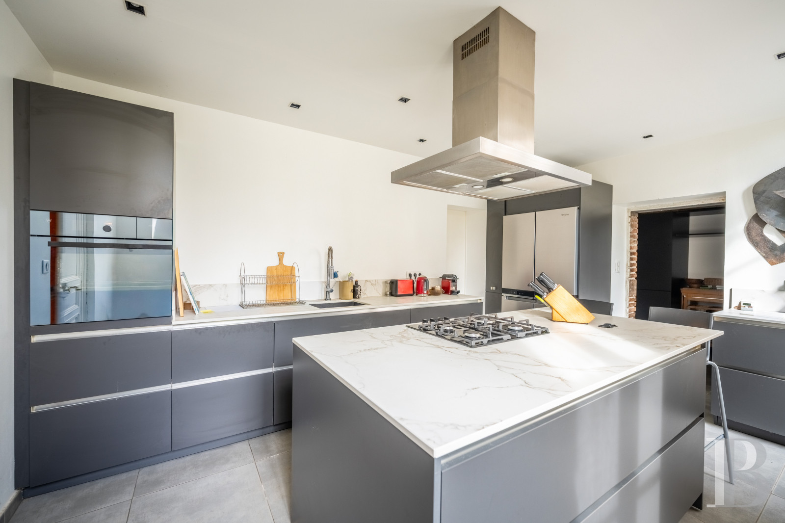 Un vestibule, large et traversant, relie l’entrée principale et la sortie arrière de la maison. D’un côté, une cuisine, récemment réaménagée, allie simplicité et fonctionnalité et ouvre sur une buanderie-cellier. Dans son prolongement, une salle à manger est orientée vers le jardin arrière. Sous une généreuse hauteur de plafond, une cheminée classique en occupe l’un des murs et le sol en carreaux de terre cuite polychrome apporte une vibration chaleureuse à la pièce.