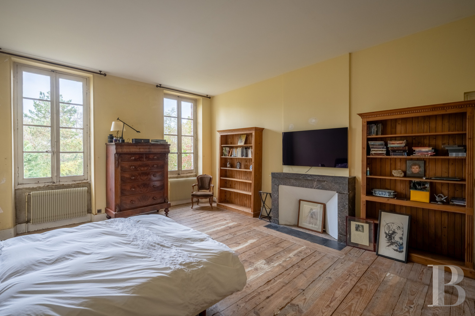 Un palier distribue une salle de bains avec toilettes qui donne sur la cour. D’un côté, une porte vitrée similaire à celle du rez-de-chaussée introduit un vaste vestibule. La chambre principale, éclairée par deux grandes baies tournées vers le jardin arrière, compte une cheminée en marbre gris et un parquet massif. La deuxième chambre, aussi grande mais plus sobre, n’a pas été aménagée ; une petite pièce attenante occupe une partie de l’aile sud. Entre ces deux volumes, un large espace sert de lingerie ou de garde-robe. Une dernière chambre, orientée vers la cour, comporte une cheminée et un lavabo.
