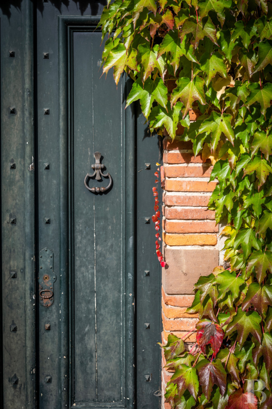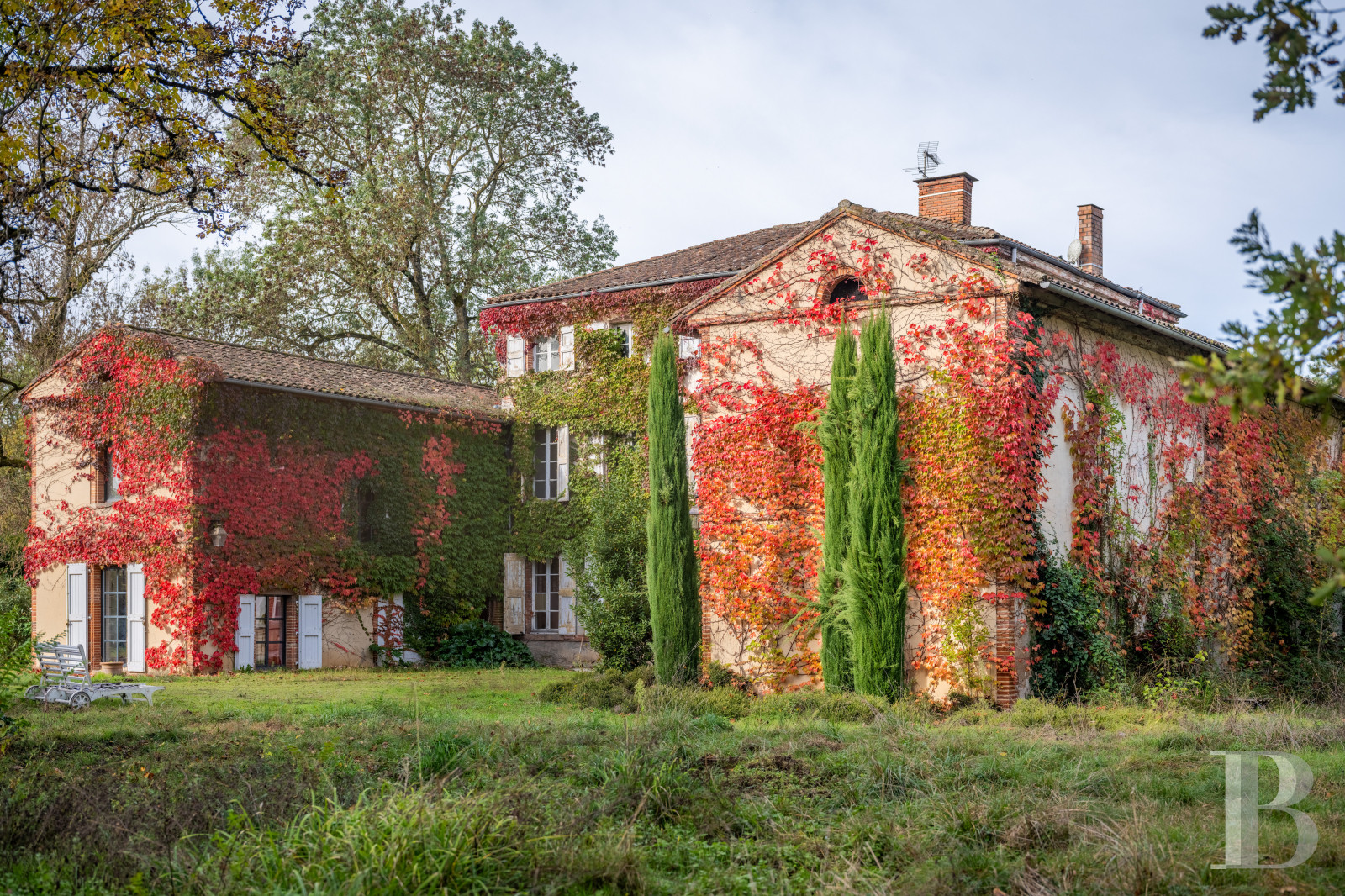 Le bâtiment adopte une composition symétrique : un corps de logis principal orienté sud-est / nord-ouest, prolongé par deux ailes de même volumétrie. Le corps central, élevé d’un rez-de-chaussée, d’un étage noble et d’un second niveau sous combles, présente une façade enduite rythmée par cinq travées régulières. L’encadrement en brique de terre cuite souligne chaque baie, pour créer un jeu de matière propre à l’architecture albigeoise. Au fil des saisons, la vigne vierge qui enveloppe partiellement les élévations nuance la façade de teintes changeantes – vert tendre au printemps, rouge profond à l’automne. À l’arrière, une petite terrasse dallée s’avance vers le jardin, prolongement naturel du logis. Les deux ailes, anciennement vouées aux activités agricoles et au séchage des récoltes, sont plus sobres : avec des percements rares, des façades pleines et une ordonnance moins stricte. Sur les deux façades sud-est, un cordon de deux rangs de brique suit le rampant de la toiture et dessine un tympan discret, ponctué d’un œil-de-bœuf en demi-lune. Leur relative austérité répond à la rigueur du corps central et forme, avec la cour qu’elles composent, un ensemble cohérent.