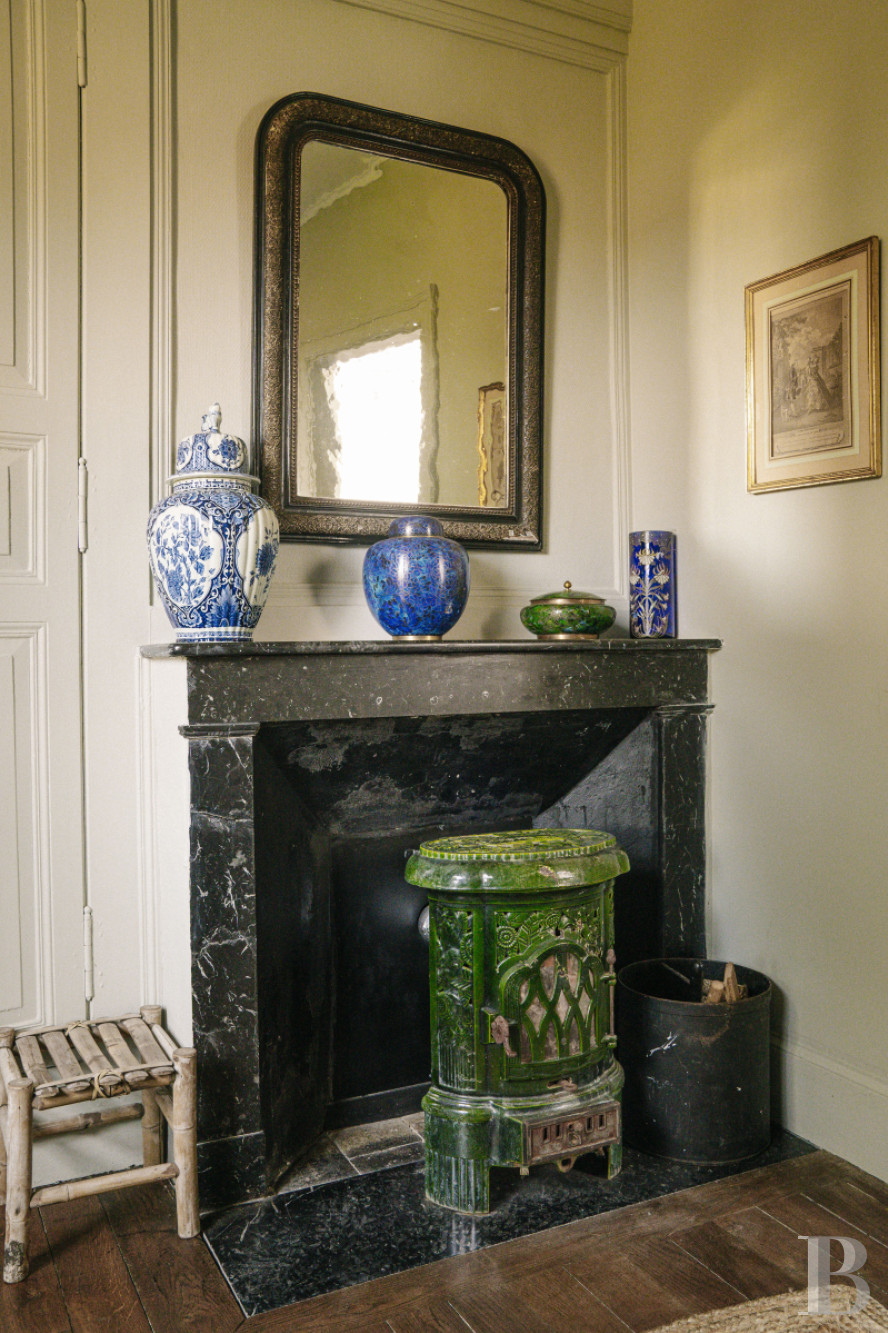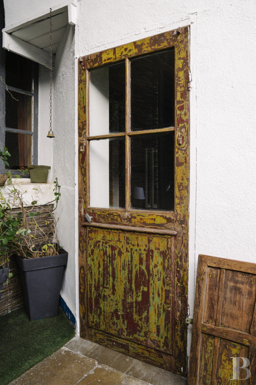 En face de la chambre, une salle à manger est éclairée par deux baies orientées vers la rue. Parquetée et décorée d'une cheminée en marbre brun veiné, elle ouvre sur une petite salle à manger avec baie tournée sur la terrasse. Quelques marches descendent vers une cuisine aménagée dans l'autre aile, face aux deux salons. Ceinturée de baies et porte vitrées, elle profite d'une vue et d'un accès directs sur la terrasse et le jardin en contrebas. Une cheminée utilisée comme four à bois prolonge les différents plans de travail et aménagements.