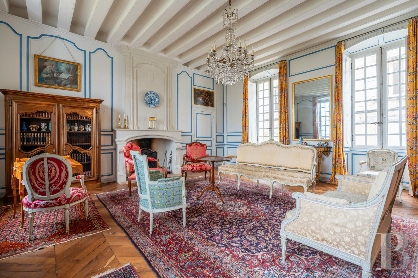 Un premier hall d’entrée distribue de part et d’autre des pièces de réception. Elles sont ornées de boiseries, avec des cheminées finement moulurées et des plafonds à la française. D’un côté, un salon traversant, parqueté en chêne à points-de-Hongrie, ouvre en enfilade sur une salle à manger et sur une cuisine. De l’autre, un second salon, pavé de carreaux de terre cuite hexagonaux, communique avec une bibliothèque. Celle-ci comprend deux espaces distincts, délimités par un arc en plein cintre ; le plus intimiste est souligné par une importante cheminée en tuffeau. L'espace mène à l'aile édifiée au 19e s., où deux chambres avec une salle d'eau voisinent une entrée indépendante.