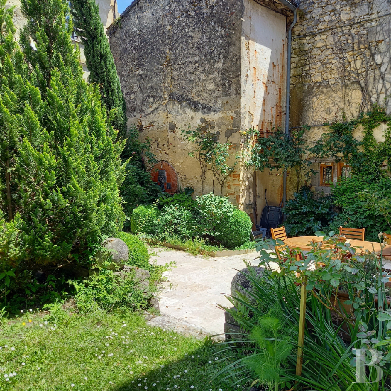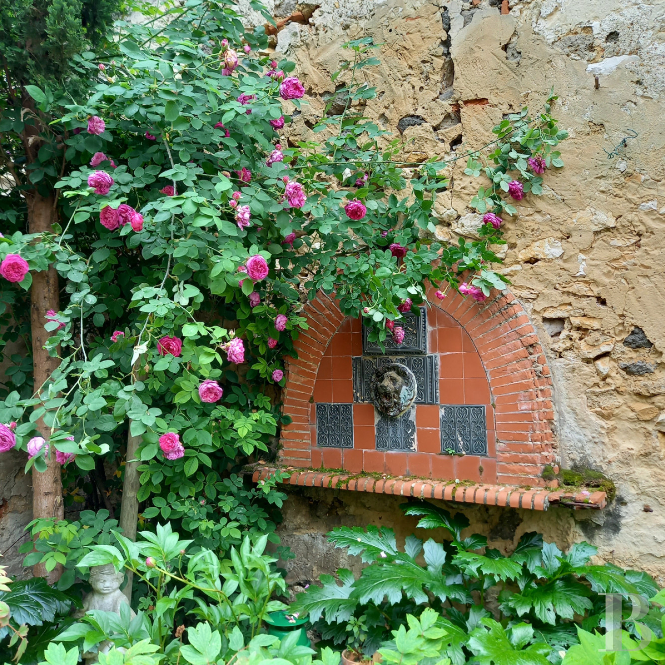 Fleuri et de plain-pied avec le rez-de-chaussée de la maison, il se prolonge en une terrasse dallée enrichie d'une collection de pivoines qui embaument jusque dans les moindres recoins. Quelques marches en pierre donnent sur un espace enherbé et ensoleillé qui pourrait recevoir une petite piscine. Le garage est suffisamment grand pour loger une voiture, des transats et du matériel de jardin. Un escalier permet d'accéder à un grenier pour davantage d'espace de rangement. Sur un côté du garage, couvert de roses anciennes, un petit enclos d'environ 30 m² peut être aménagé en potager.