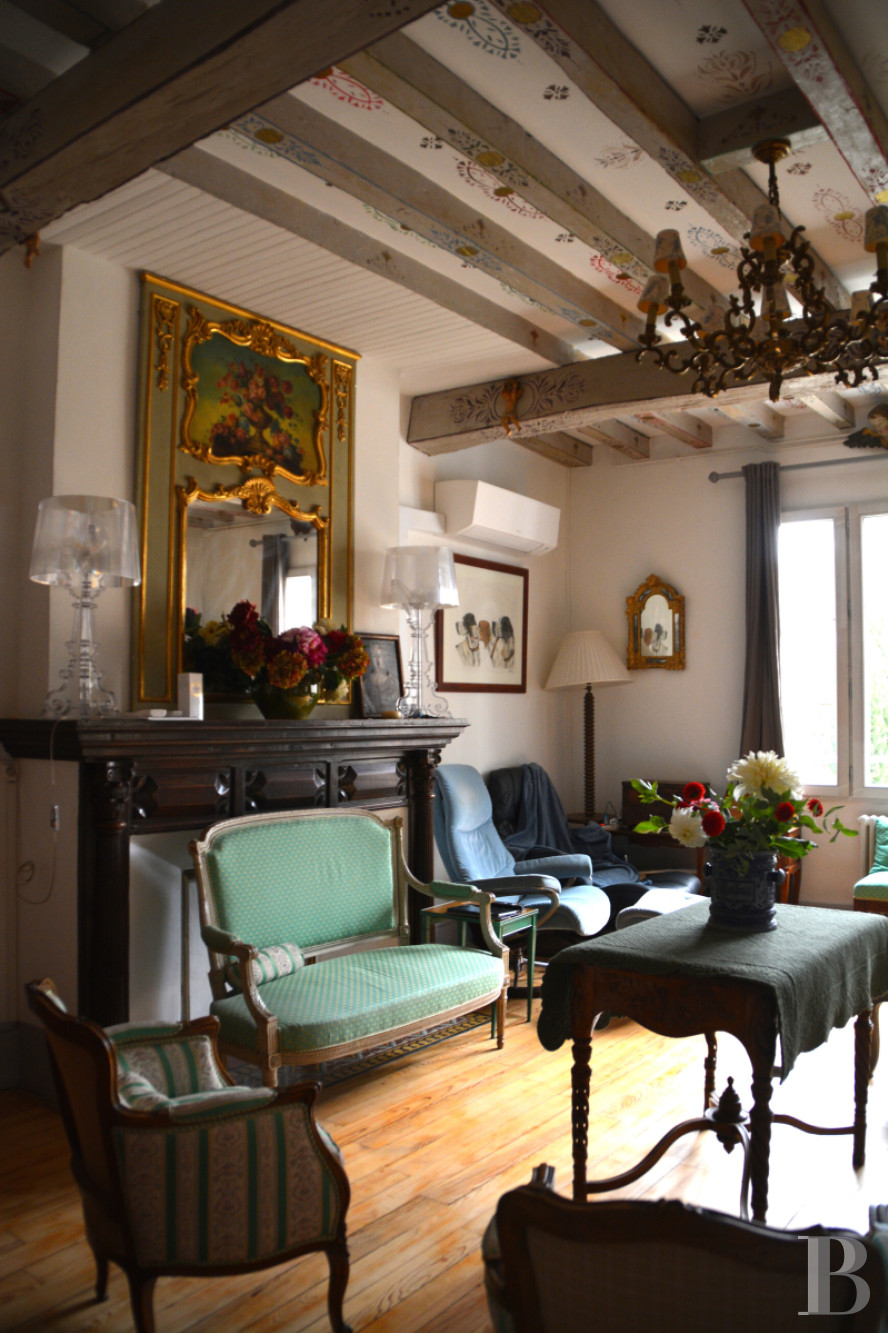 La cage d'escalier est lumineuse, grâce à une baie orientée à l'arrière de la maison. Un petit palier distribue quatre pièces principales dont une première chambre, discrète et chaleureuse. Orienté sur le jardin et éclairé par des baies à meneaux, un salon et sa cheminée de style Louis-Philippe au plafond peint, se prolonge d'une salle à manger, elle-même avec cheminée du 18e s. En angle, un petit bureau sur parquet donne sur le jardin. Communicante avec la salle à manger et par une porte étroite du Moyen-Âge, une cuisine moderne, de petite taille mais particulièrement bien agencée, a trouvé sa place. Au sol, toutes les pièces sont parquetées à l'exception de la cuisine dont les faïences sont posées dans un esprit carreaux de ciment. Une salle de bains avec toilettes en retour de palier jouxte le départ de l'escalier vers l'étage supérieur.