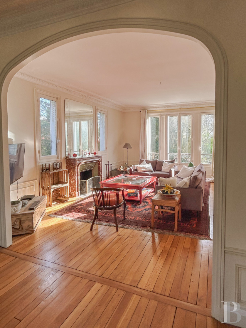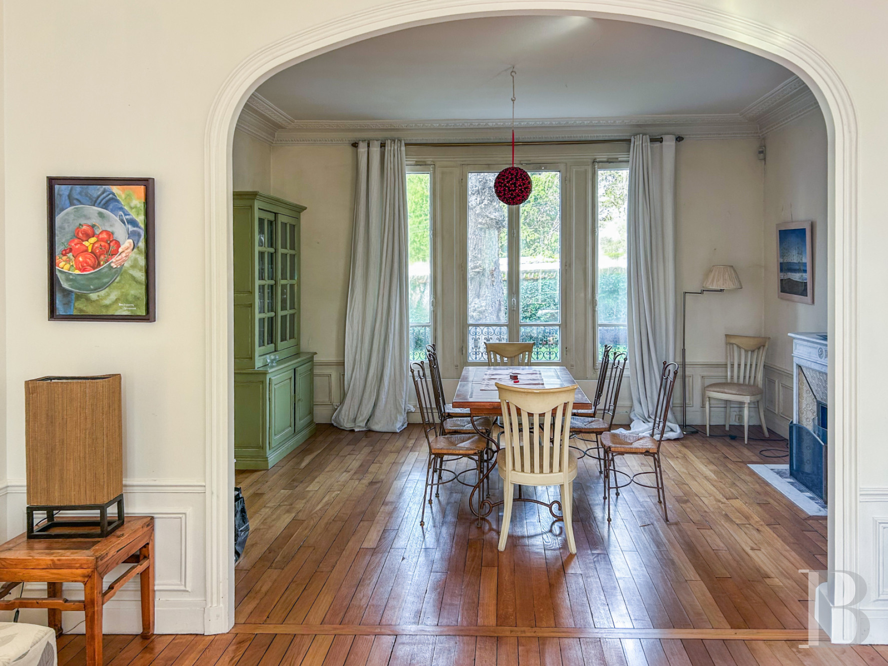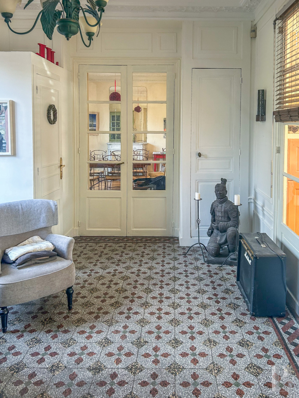 Le rez-de-chausséeL’entrée, traversante, jouit d'une abondante luminosité et commande plusieurs pièces. Ses murs sont rythmés par des boiseries en partie haute et basse de couleur blanche, qui contrastent avec le carrelage ancien à motifs géométriques répétés en terre cuite et tons brun-rouge sur fond clair. Une cuisine équipée, au sol revêtu d'un parquet en chêne à larges lames et éclairée d'une baie latérale, ouvre sur un grand salon percé de hautes fenêtres à petit bois, équipée d'une cheminée en marbre veiné rouge, surmontée d'un miroir ancien. Le plafond est souligné par des corniches moulurées, tandis que des boiseries de soubassement en ceinturent le pourtour, et confirme ainsi son assise classique. Dans son prolongement, une large arcade en anse de panier donne sur la salle à manger.
