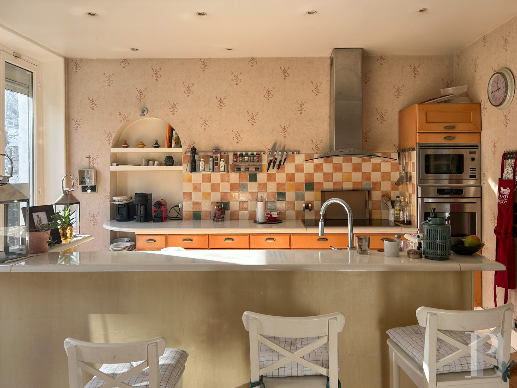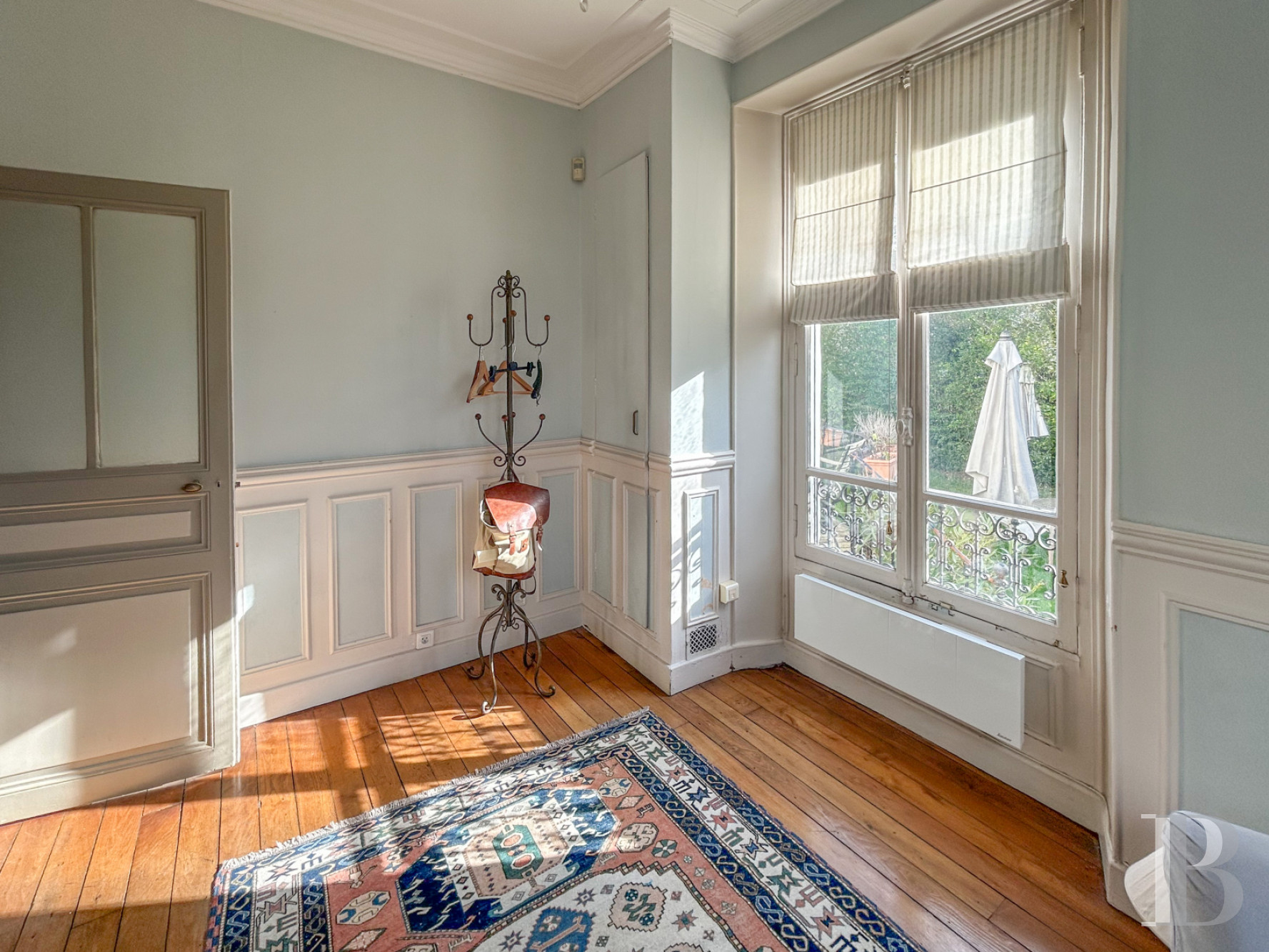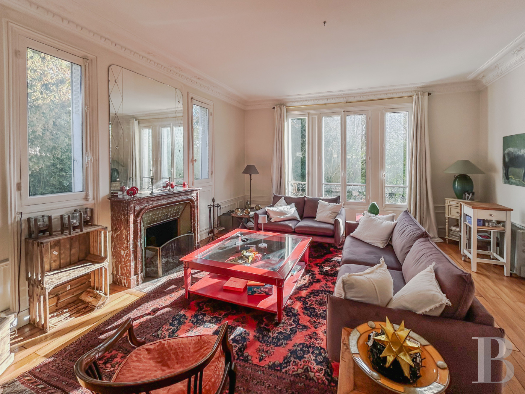 Le rez-de-chausséeL’entrée, traversante, jouit d'une abondante luminosité et commande plusieurs pièces. Ses murs sont rythmés par des boiseries en partie haute et basse de couleur blanche, qui contrastent avec le carrelage ancien à motifs géométriques répétés en terre cuite et tons brun-rouge sur fond clair. Une cuisine équipée, au sol revêtu d'un parquet en chêne à larges lames et éclairée d'une baie latérale, ouvre sur un grand salon percé de hautes fenêtres à petit bois, équipée d'une cheminée en marbre veiné rouge, surmontée d'un miroir ancien. Le plafond est souligné par des corniches moulurées, tandis que des boiseries de soubassement en ceinturent le pourtour, et confirme ainsi son assise classique. Dans son prolongement, une large arcade en anse de panier donne sur la salle à manger.
