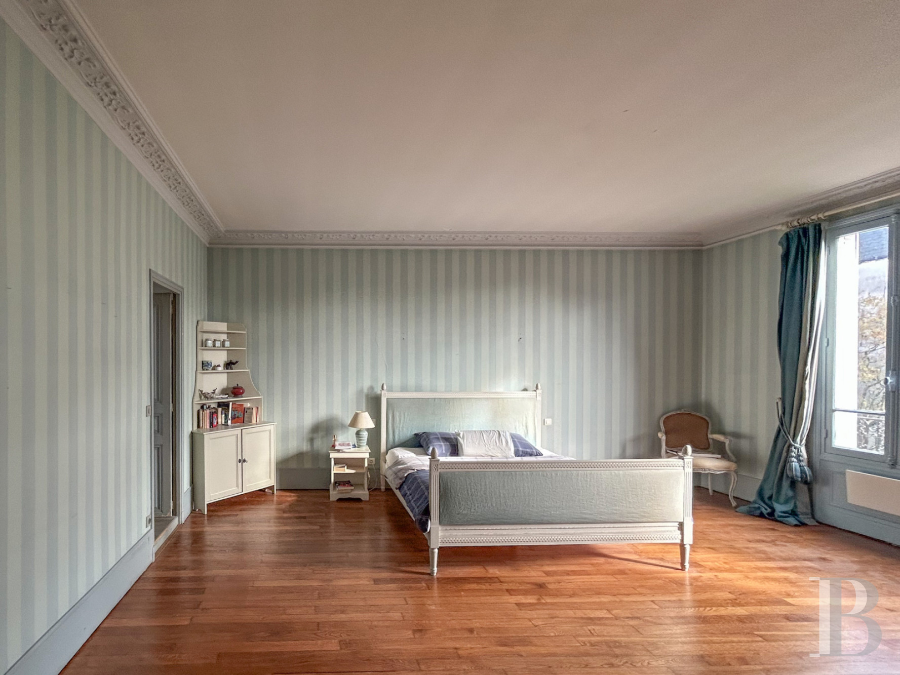 Il est accessible par un escalier en bois, qui se déploie dans une cage étroite baignée de lumière et dessine une spirale. Il s'organise autour d'un vaste palier qui distribue une salle de bains avec des toilettes, articulée autour d’une baignoire aux lignes adoucies et d’une double vasque encastrée dans un plan en bois massif. Une première chambre présente des murs revêtus de boiseries de soubassements moulurées, un sol couvert d’un parquet de chêne à lames droites et un plafond souligné d'une fine corniche sculptée, dont la hauteur demeure confortable. Un corridor marqué par des portes et des plinthes en bois massif, dessert successivement trois autres chambres ainsi qu’une salle de bains contemporaine, toutes composées des mêmes éléments décoratifs.